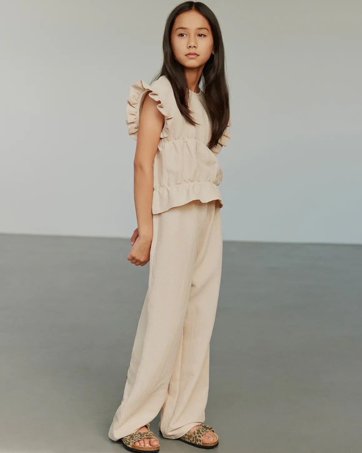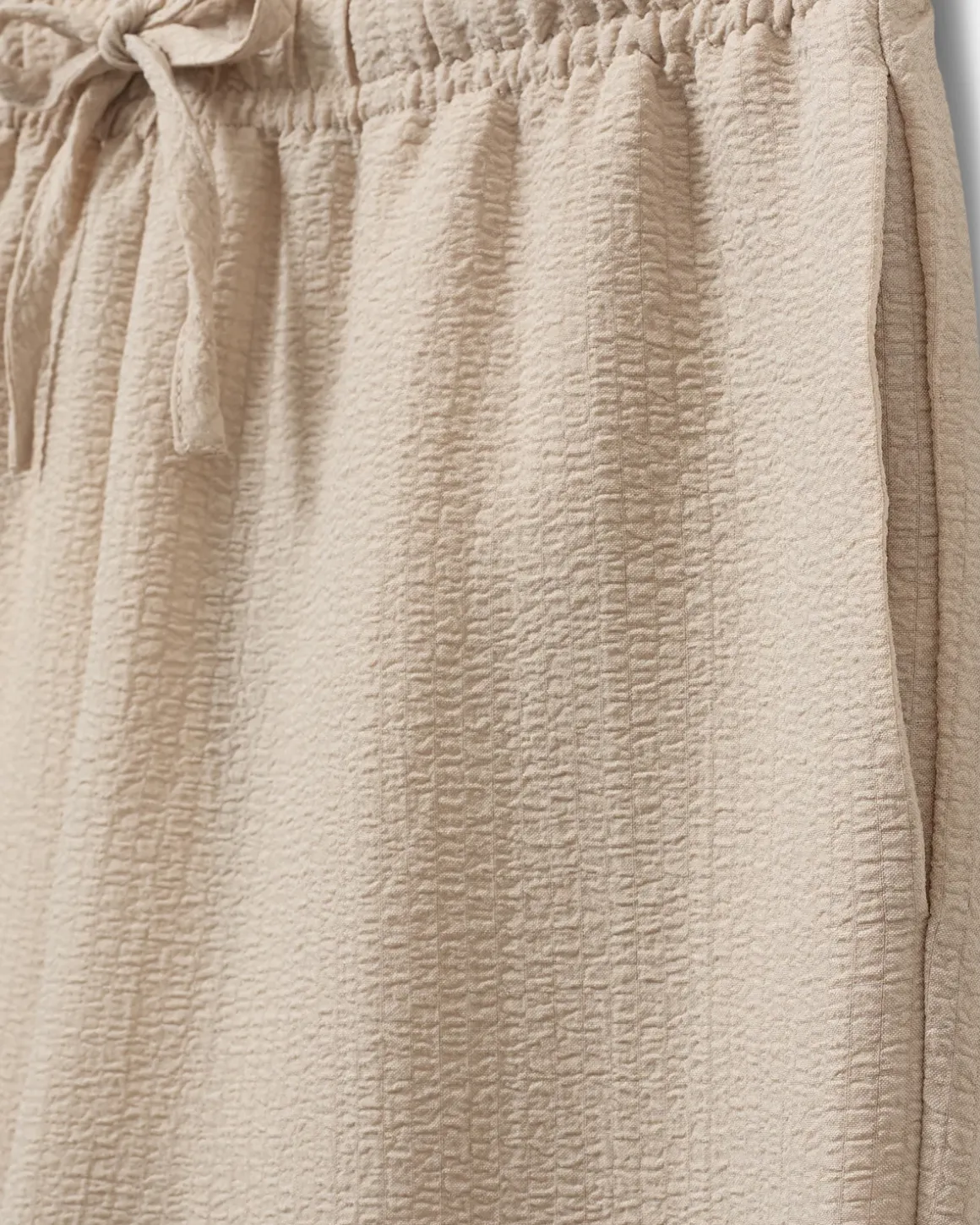 • Trousers in lightly structured fabric with elastic waist and tie belt