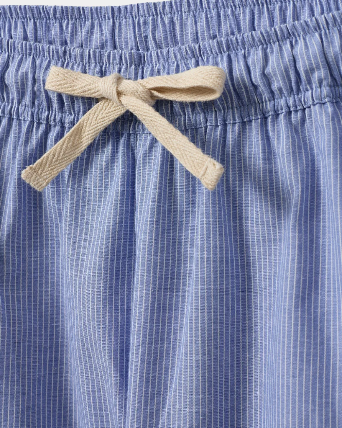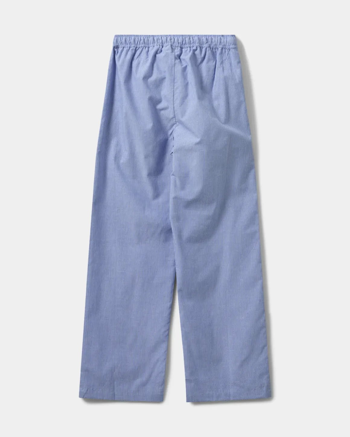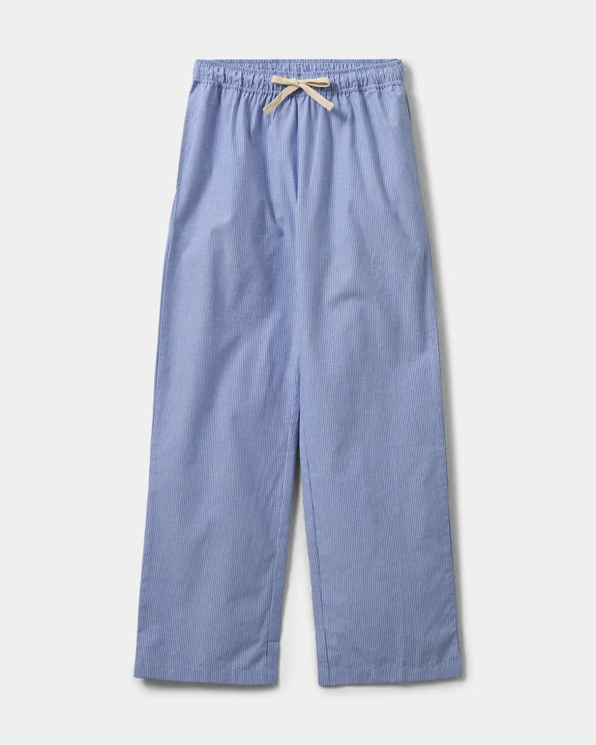 Loose blue striped trousers. The trousers have a tie waist and a loose-fit silhouette. Made of 100% cotton.