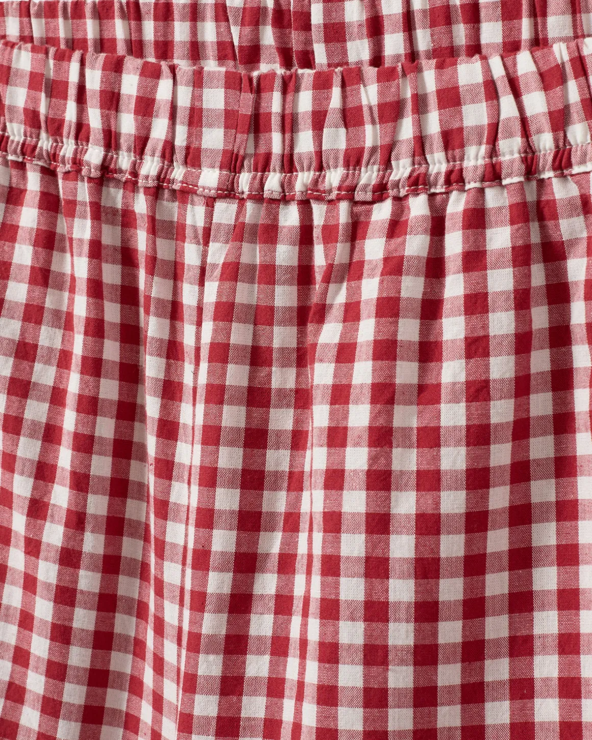 Trousers with red and white checkered pattern. The trousers have a high waist, elastic waistband, and a loose-fit silhouette. Made of 100% cotton.