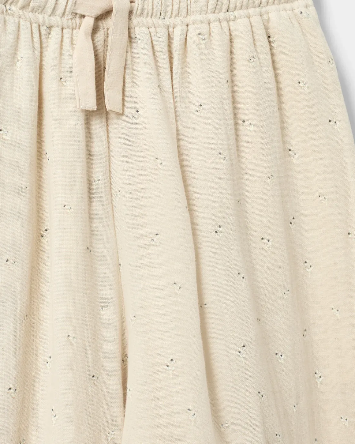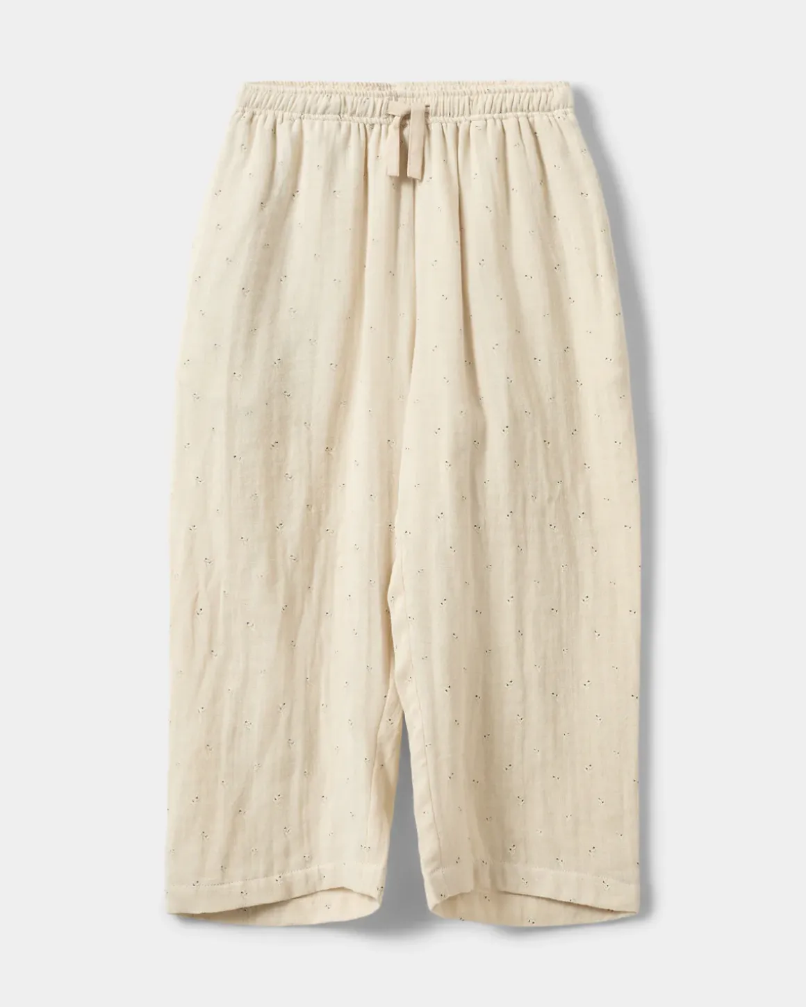 Loose off white trousers with small pointelle details. The trousers have a tie waist and pockets on the sides. Made of 100% cotton.