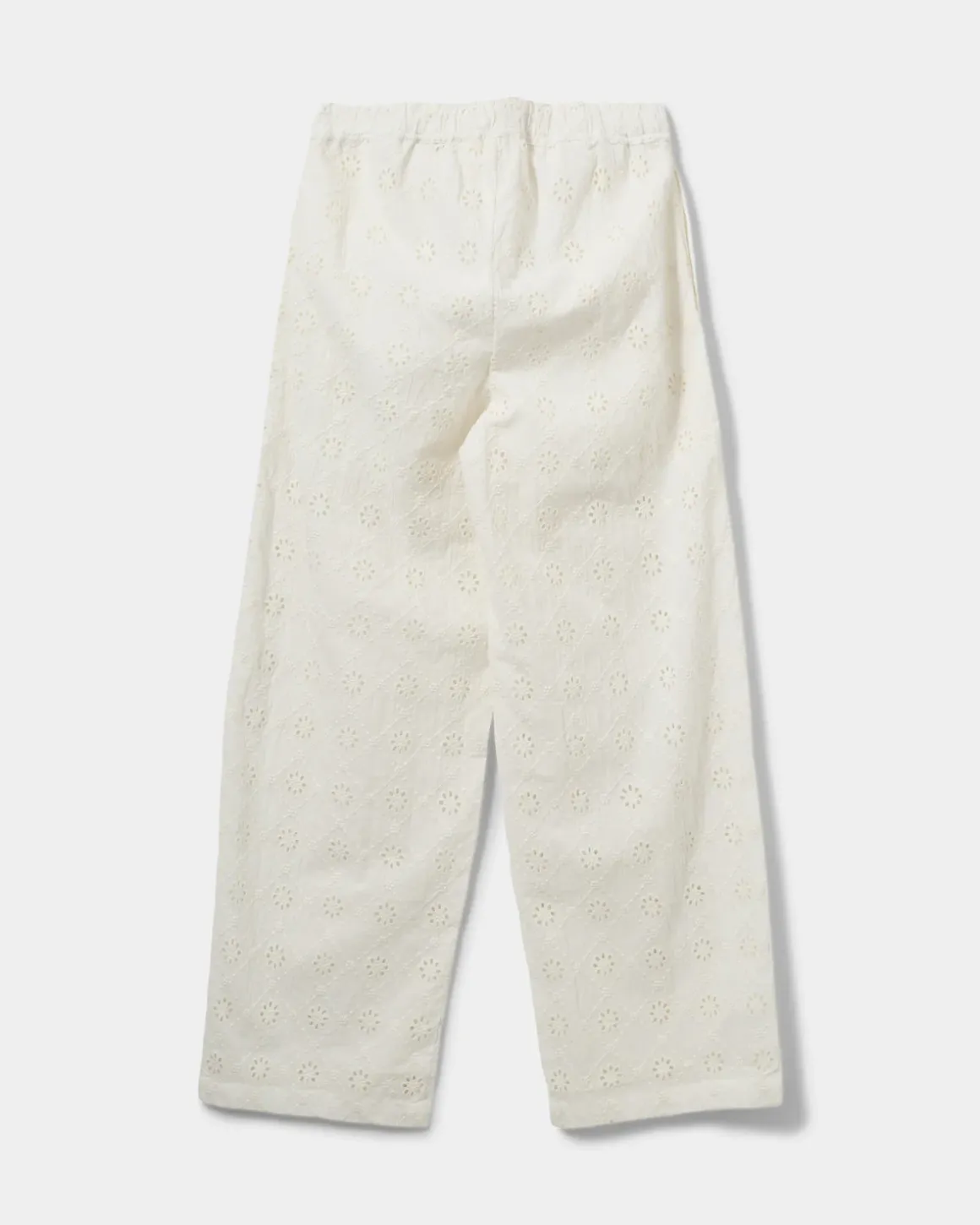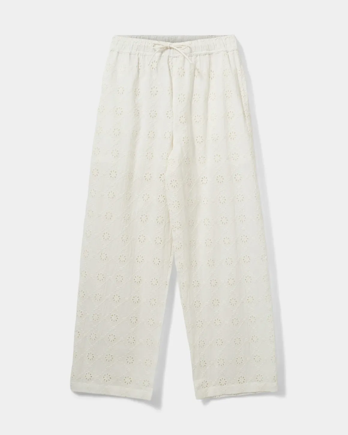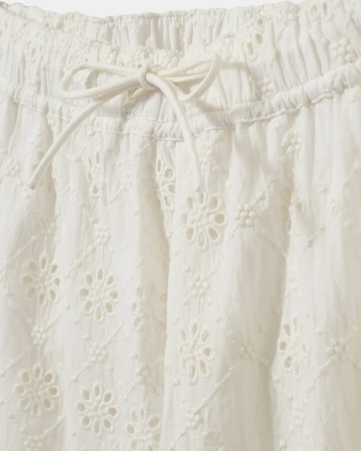 • Trousers with broderie anglaise and elastic waist with tie belt
