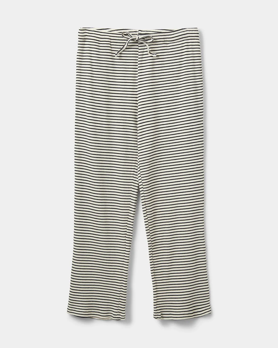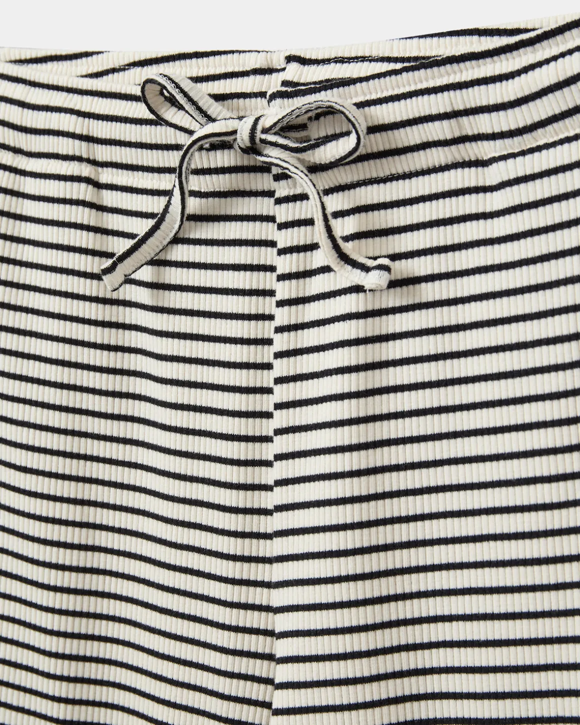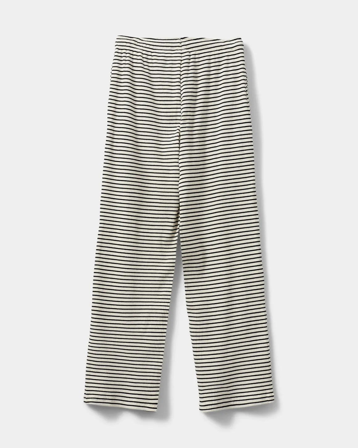 Loose black and white striped jersey trousers. The trousers have a tie belt at the waist and a loose-fit design. Made of 95% organic cotton with stretch.