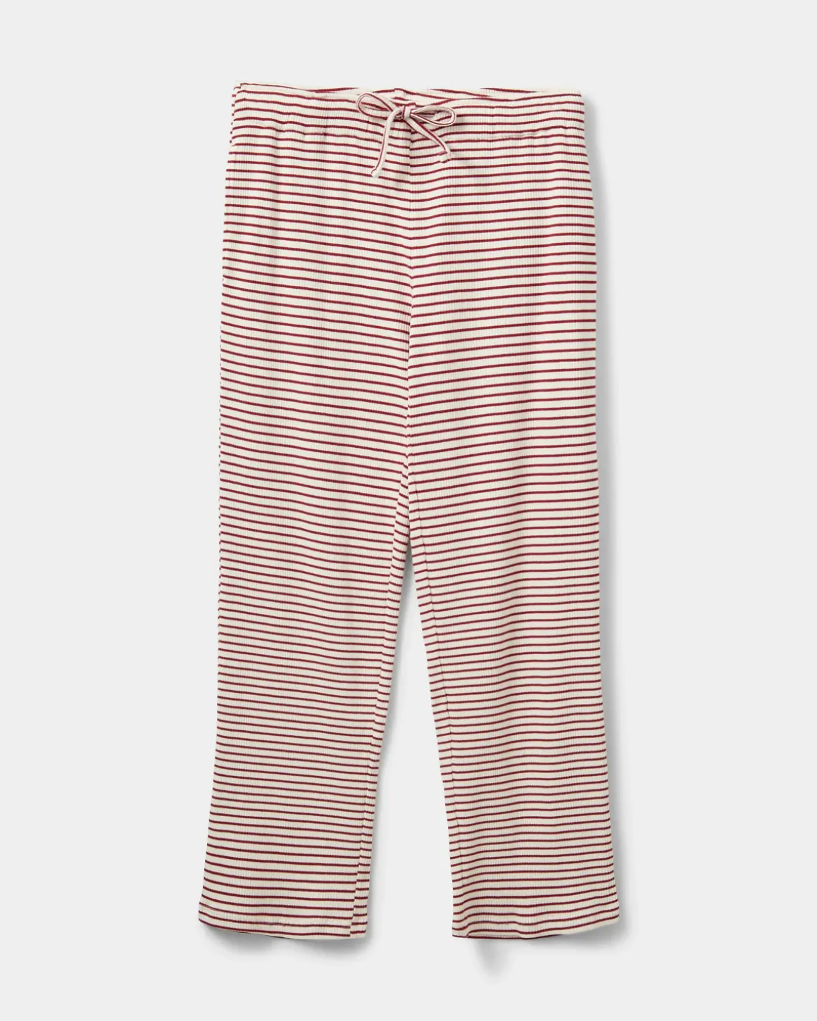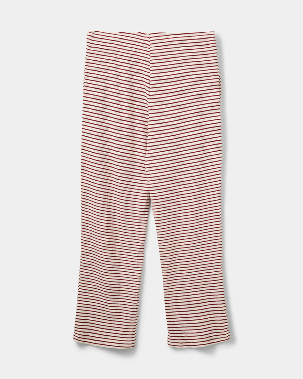 Loose red and white striped jersey trousers. The trousers have a tie belt at the waist and a loose-fit silhouette. Designed in 95% organic cotton with stretch.