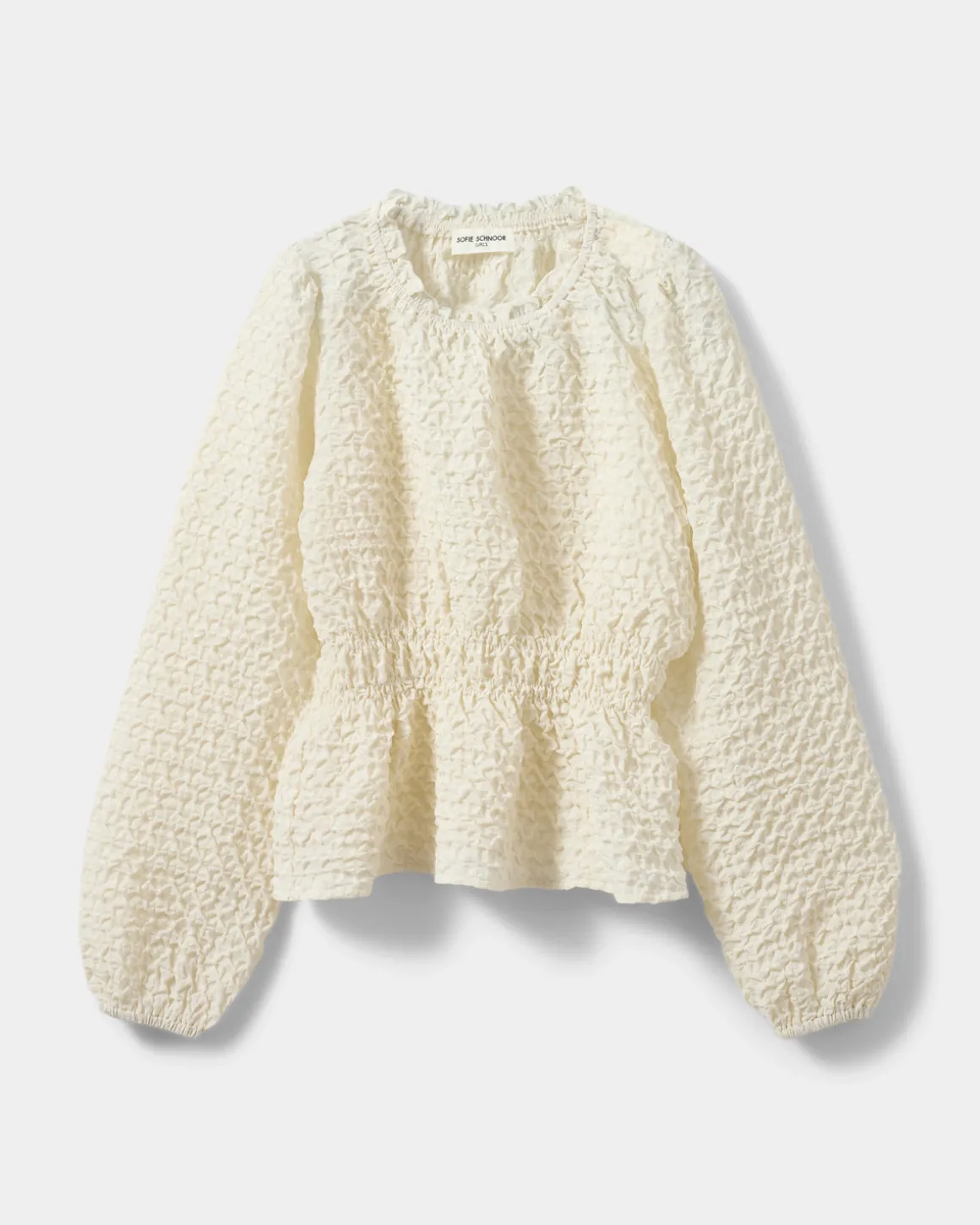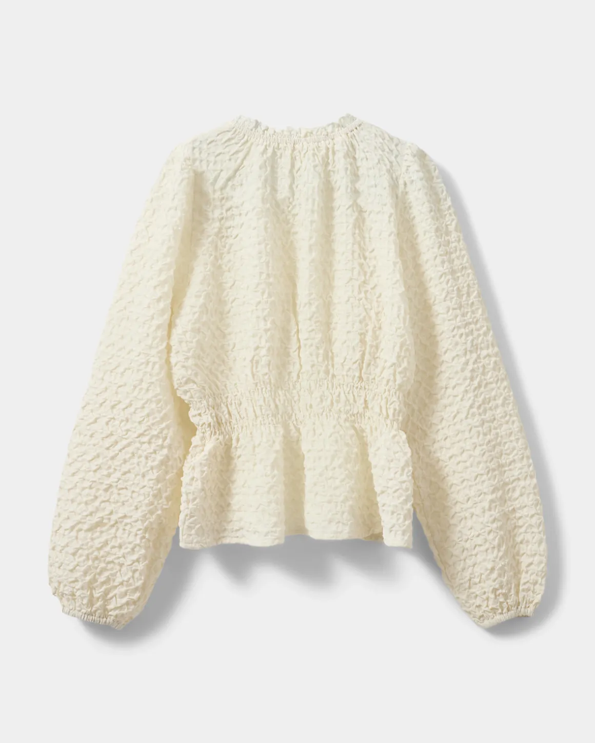 Blouse in off white structured fabric. The blouse has elastic details at the waist and at the sleeve edges, as well as a loose fit and slightly puffed sleeves.