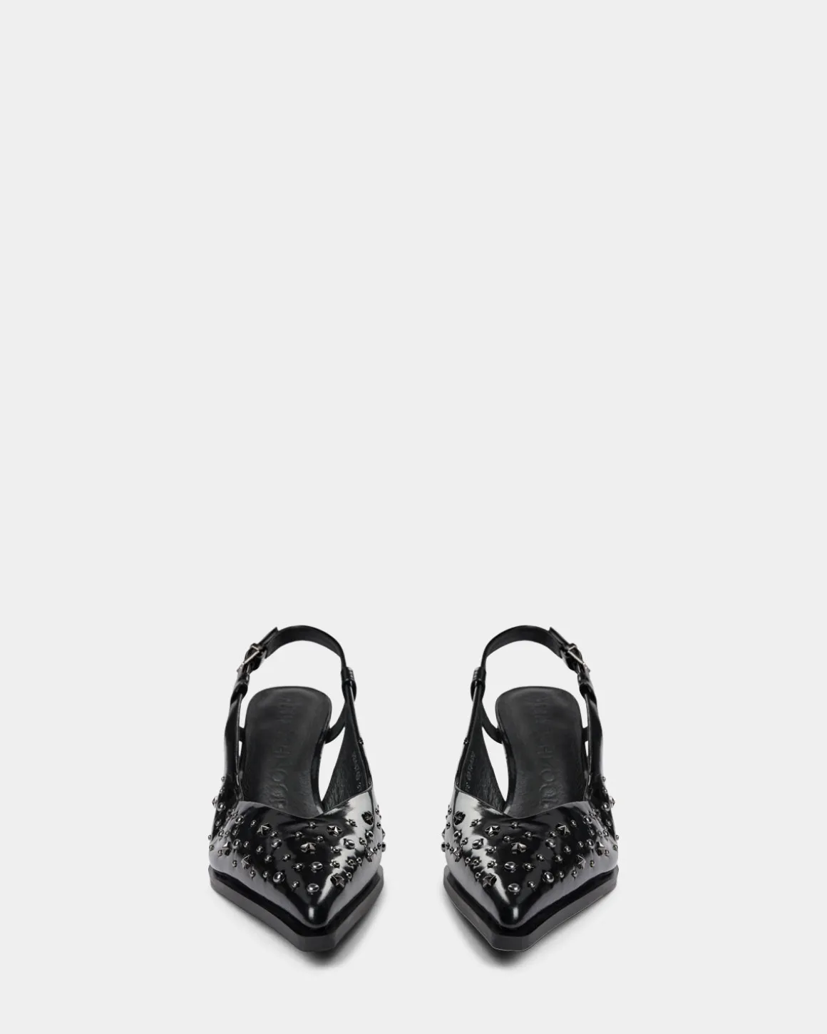 • With a pointed toe and high heel. The shoes are decoratively adorned with silver-coloured stars and rivets, which give a modern and festive look.