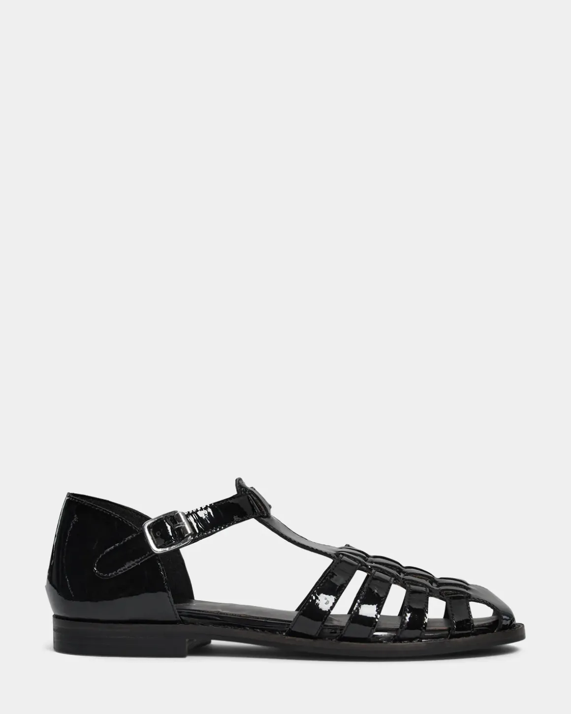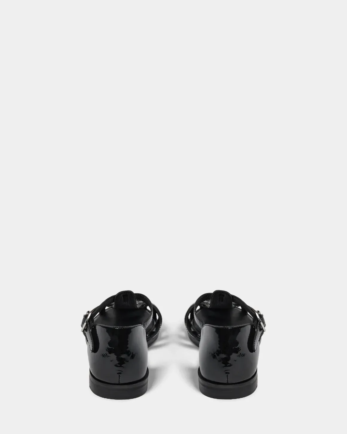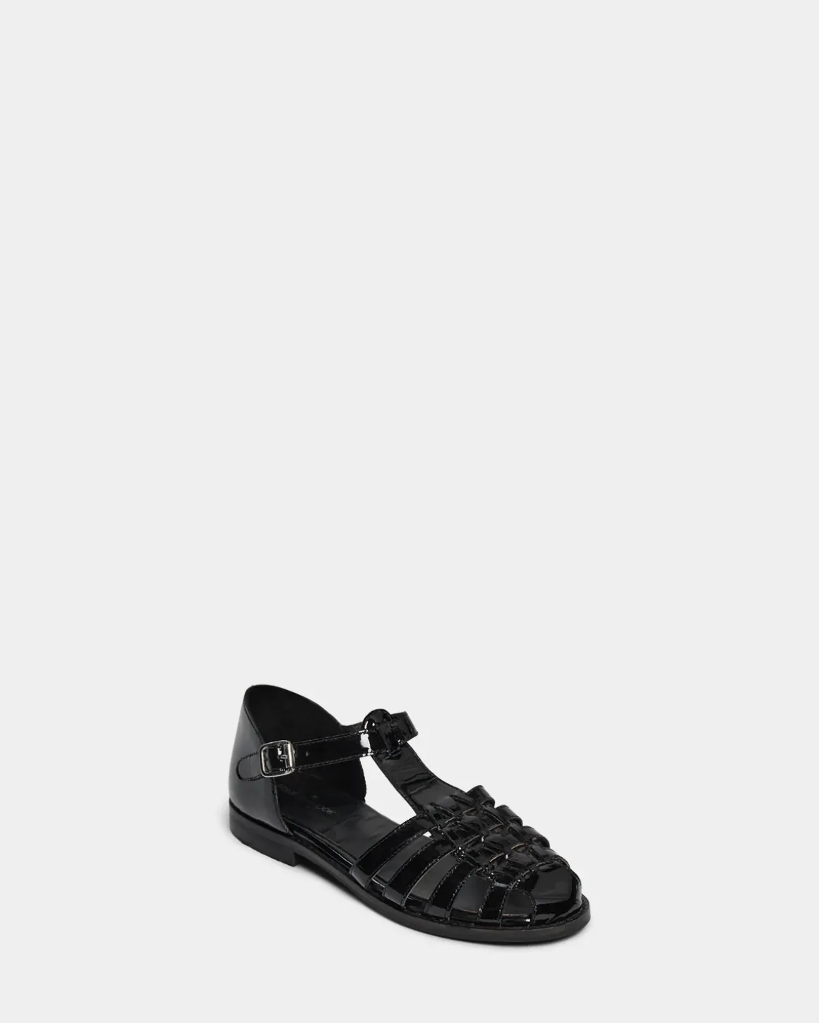 Sandals in black leather. The sandal features a braided design, adjustable ankle strap with buckle, and a flat sole. Made with 100% leather upper, leather insole, and rubber outsole.