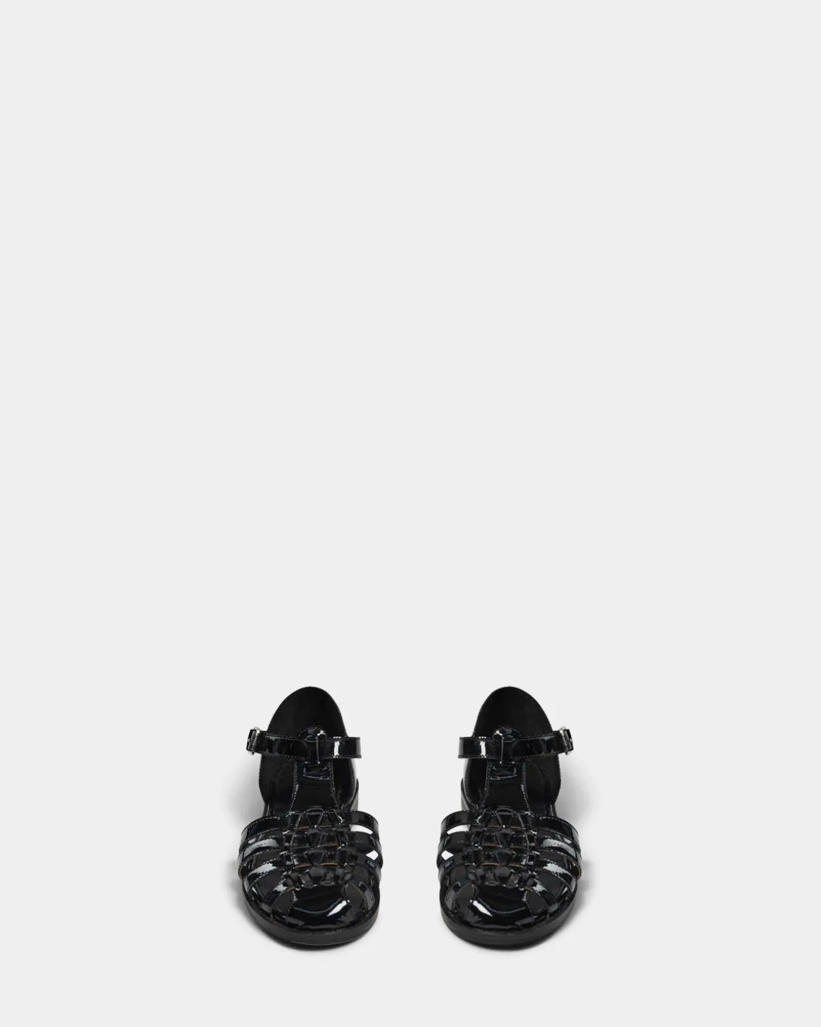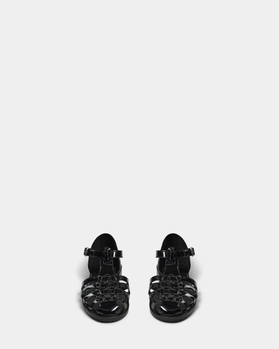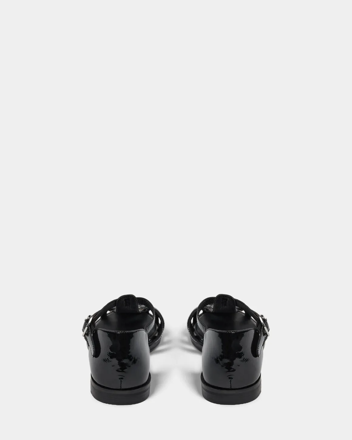Sandals in black leather. The sandal features a braided design, adjustable ankle strap with buckle, and a flat sole. Made with 100% leather upper, leather insole, and rubber outsole.