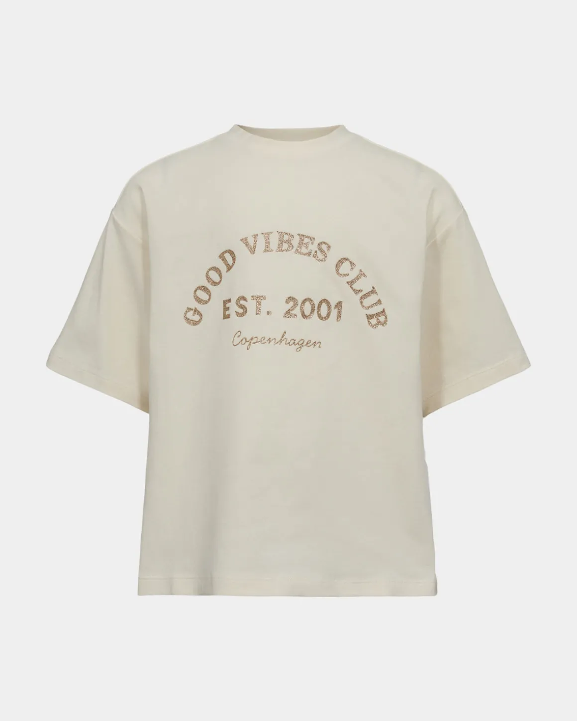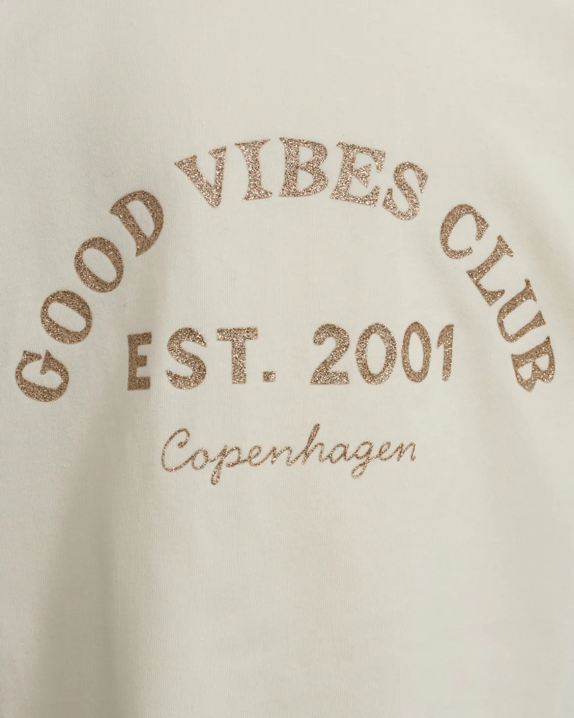 The design with text ”GOOD VIBES CLUB EST.2001 COPENHAGEN” in gold with glitter on the front.