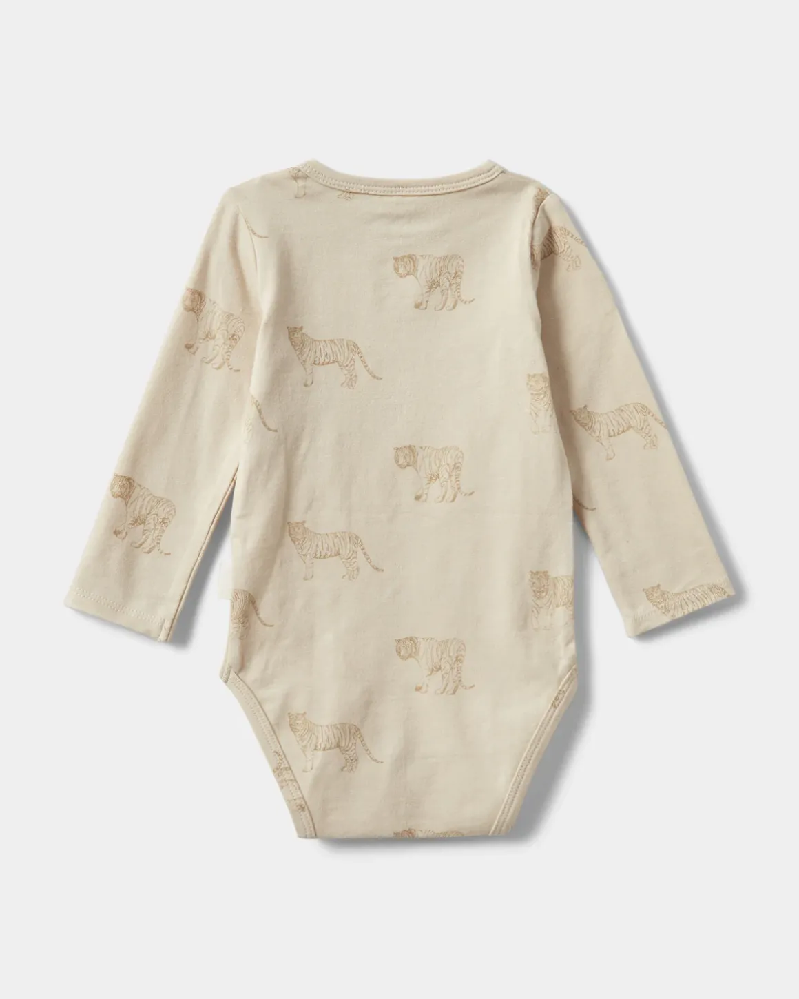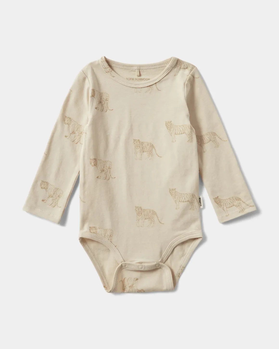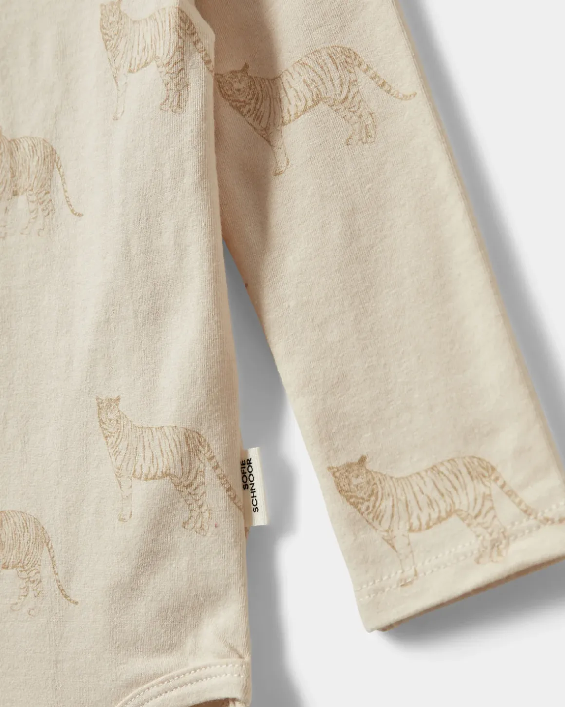 • The bodysuit has a round neck, snap buttons at the bottom, and long sleeves