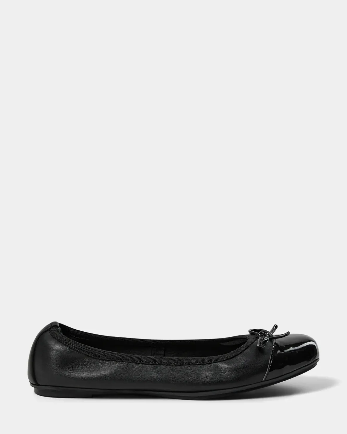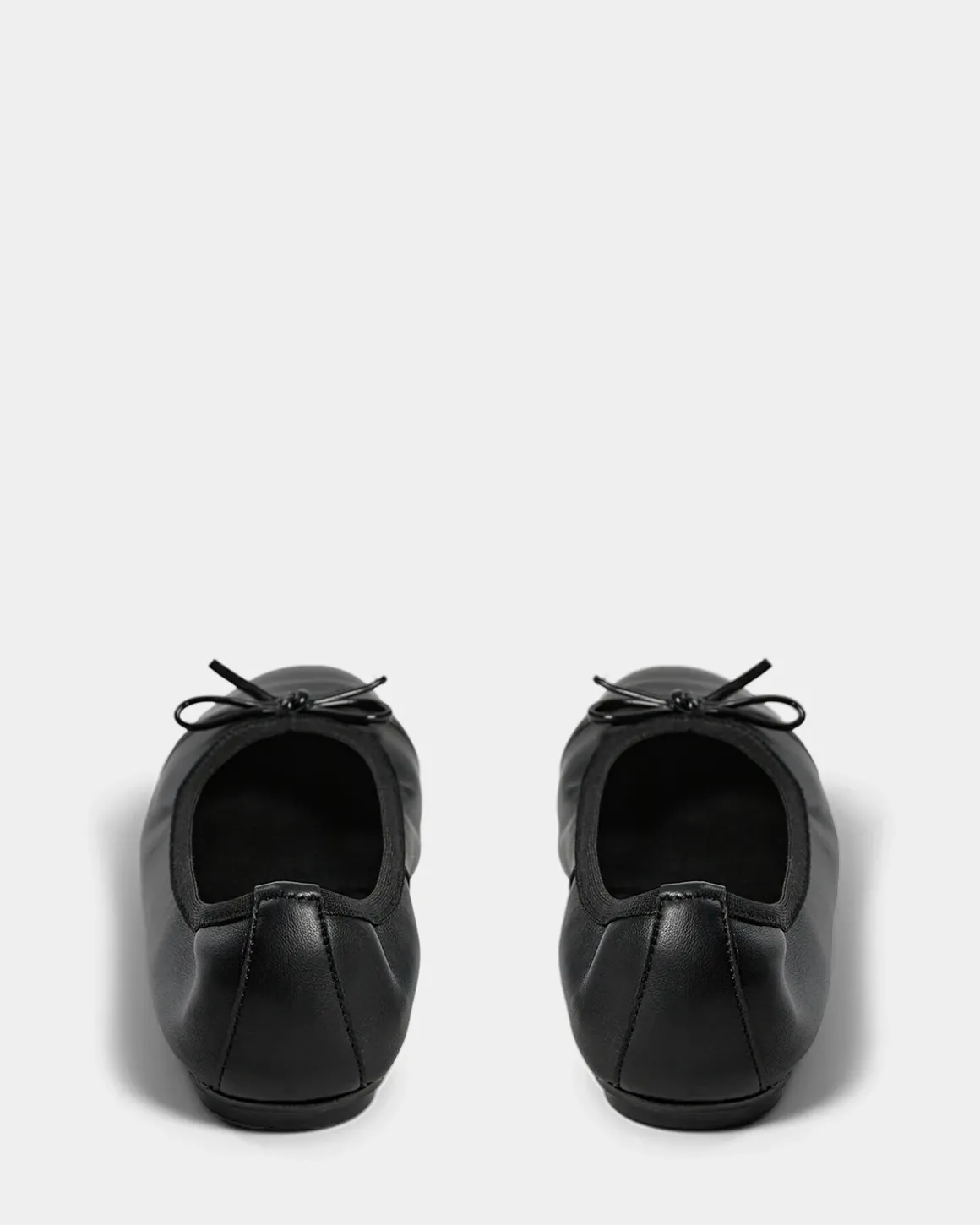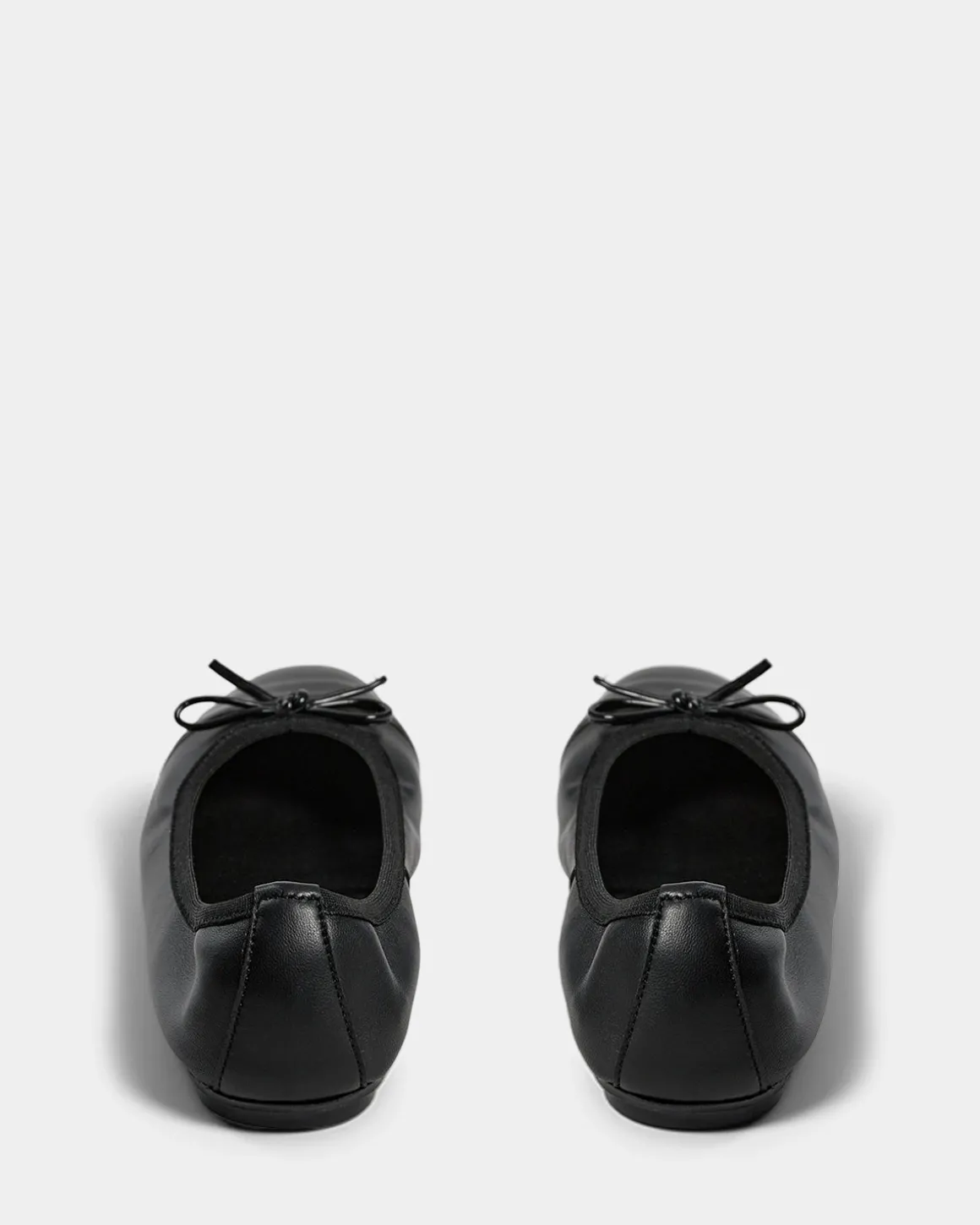 Ballerina in black leather. The ballerina has a round toe, a decorative bow on the tip, and a low heel. The upper is made of 100% leather, the insole in leather, and the outsole in rubber.