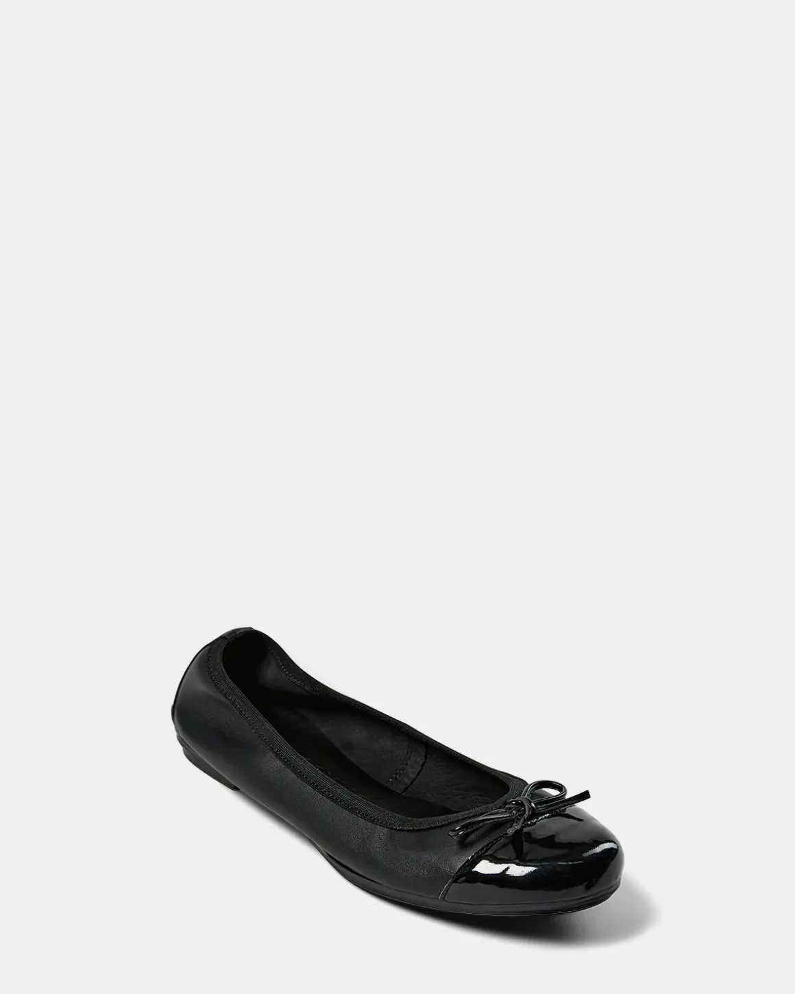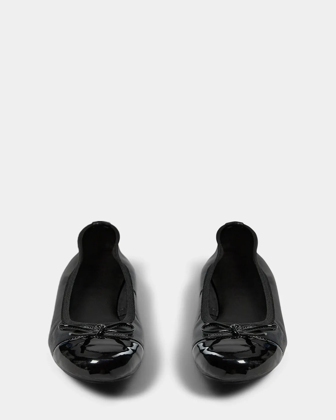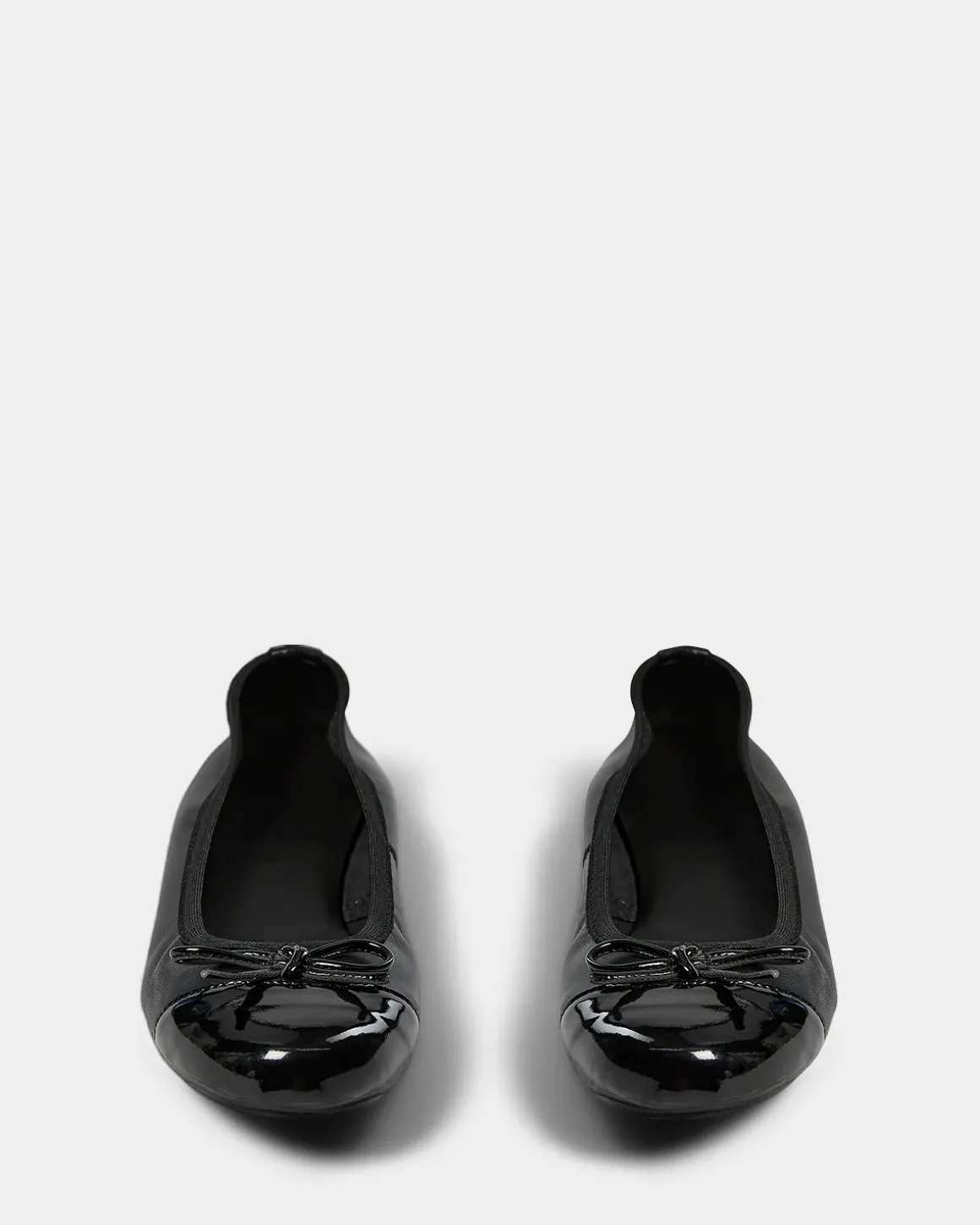 Ballerina in black leather. The ballerina has a round toe, a decorative bow on the tip, and a low heel. The upper is made of 100% leather, the insole in leather, and the outsole in rubber.