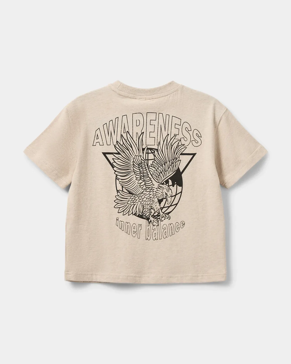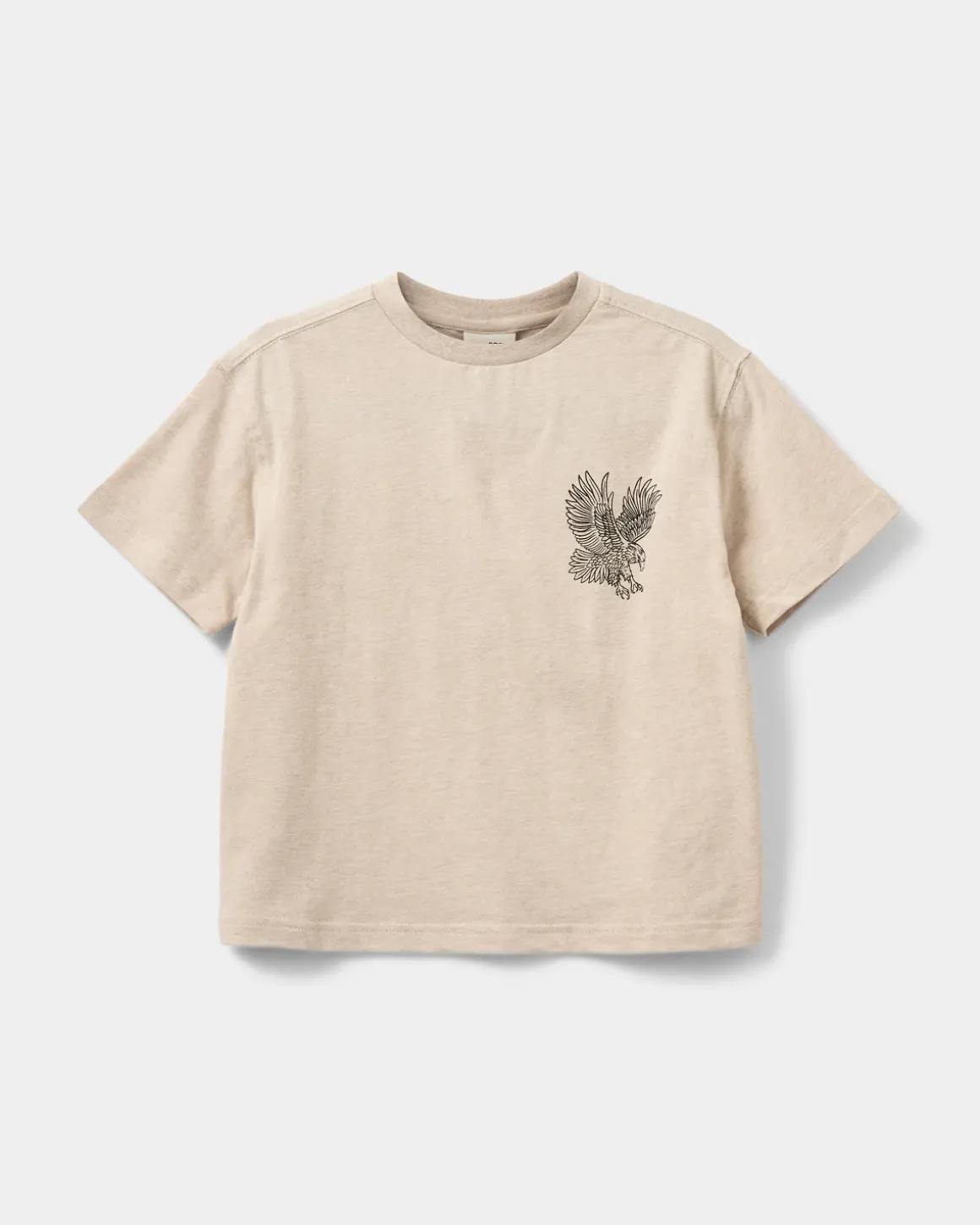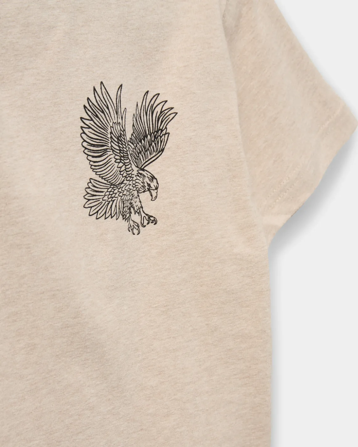 Beige melange classic T-shirt with a graphic print of an eagle and a loose fit. Designed in 95% organic cotton and 5% elastane for a soft and flexible fit.