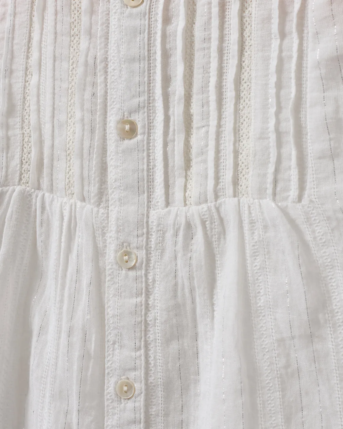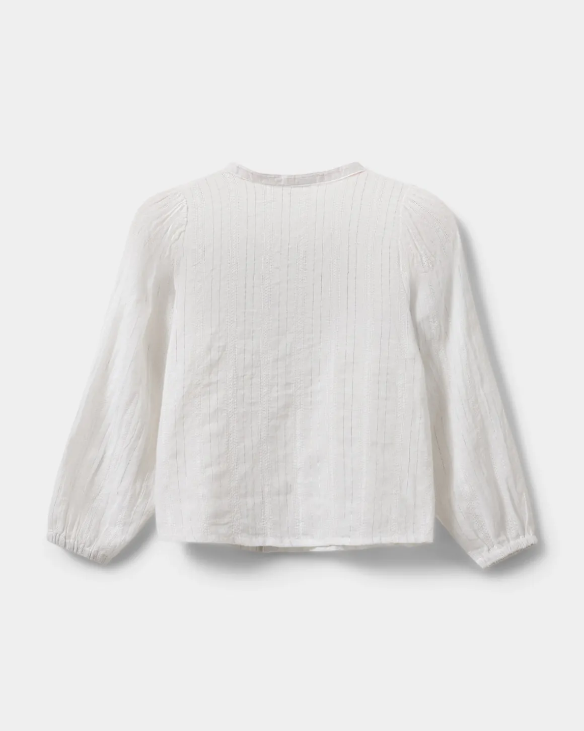 White lightweight shirt. The shirt has a button closure at the front and narrow pleat details on the chest. Long sleeves with elastic at the cuffs. Made of 100% cotton.