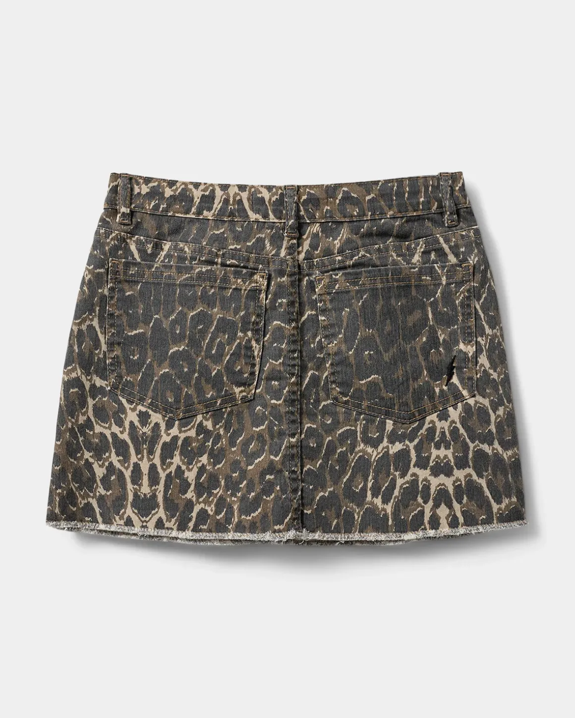 • The skirt has zipper and button closure, five pockets, and raw hem at the bottom