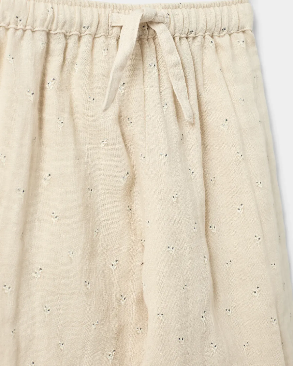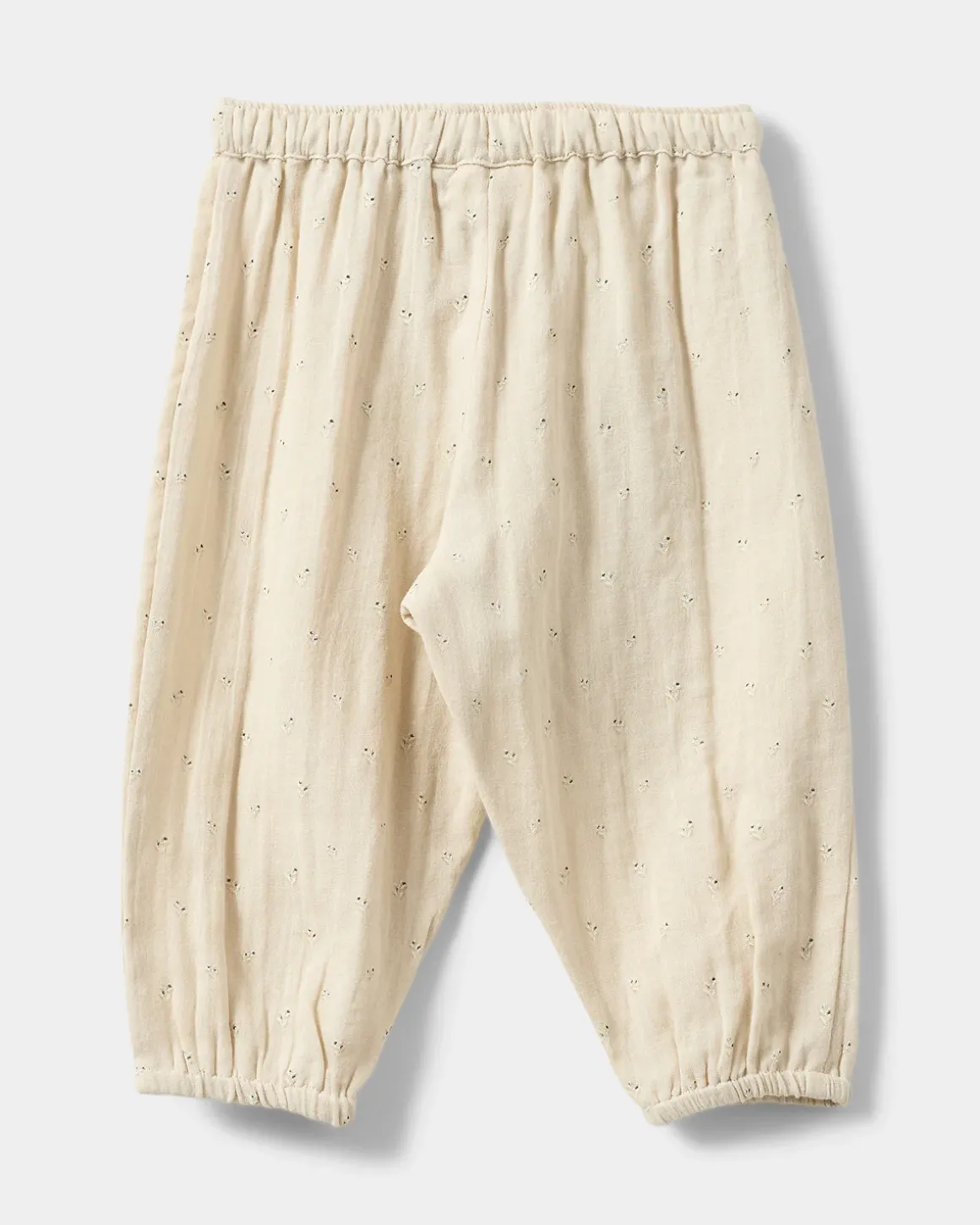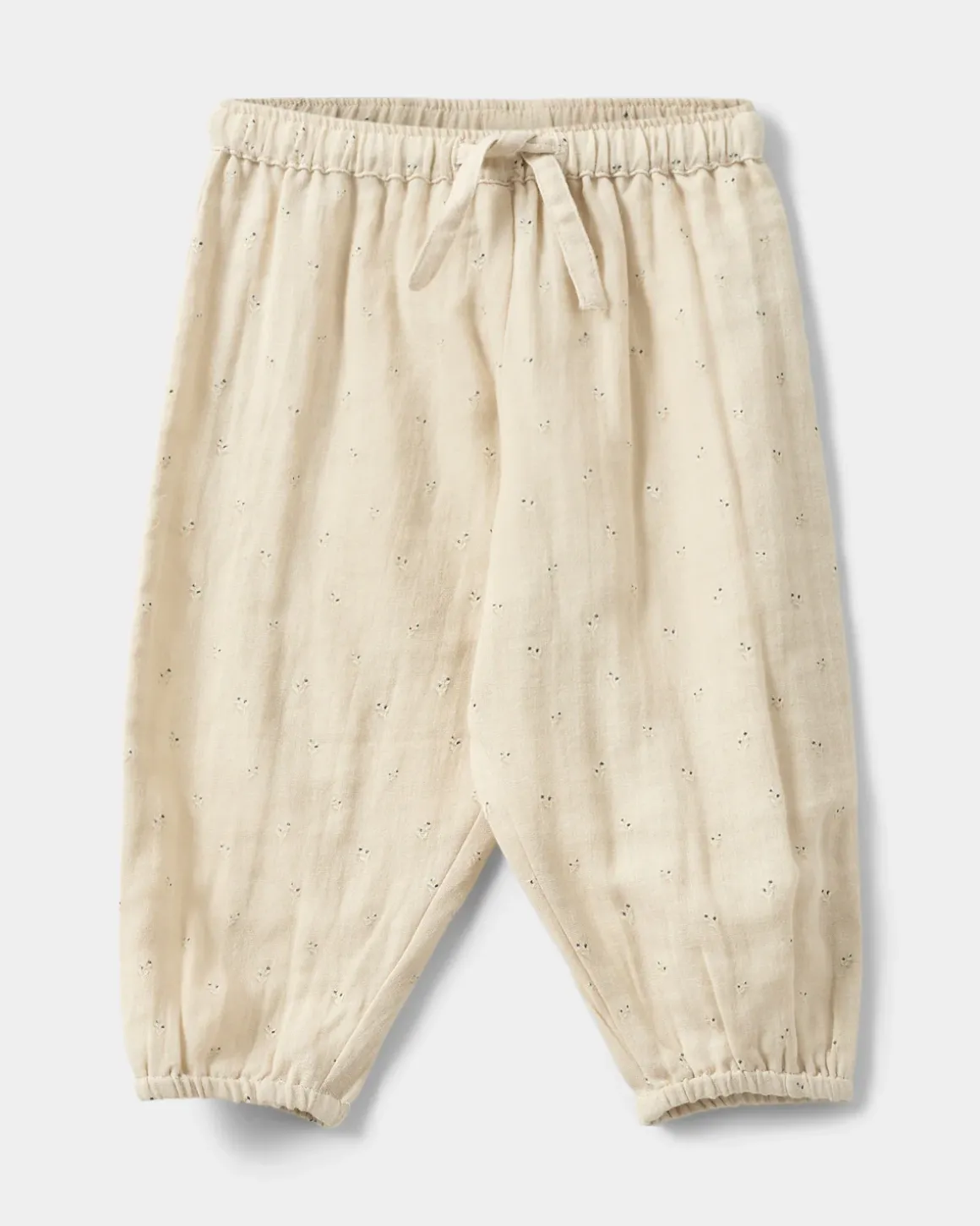 Cream-colored pants with small pointelle details. The pants have elastic and a tie at the waist, as well as elastic cuffs at the ankles. Made of 100% cotton.
