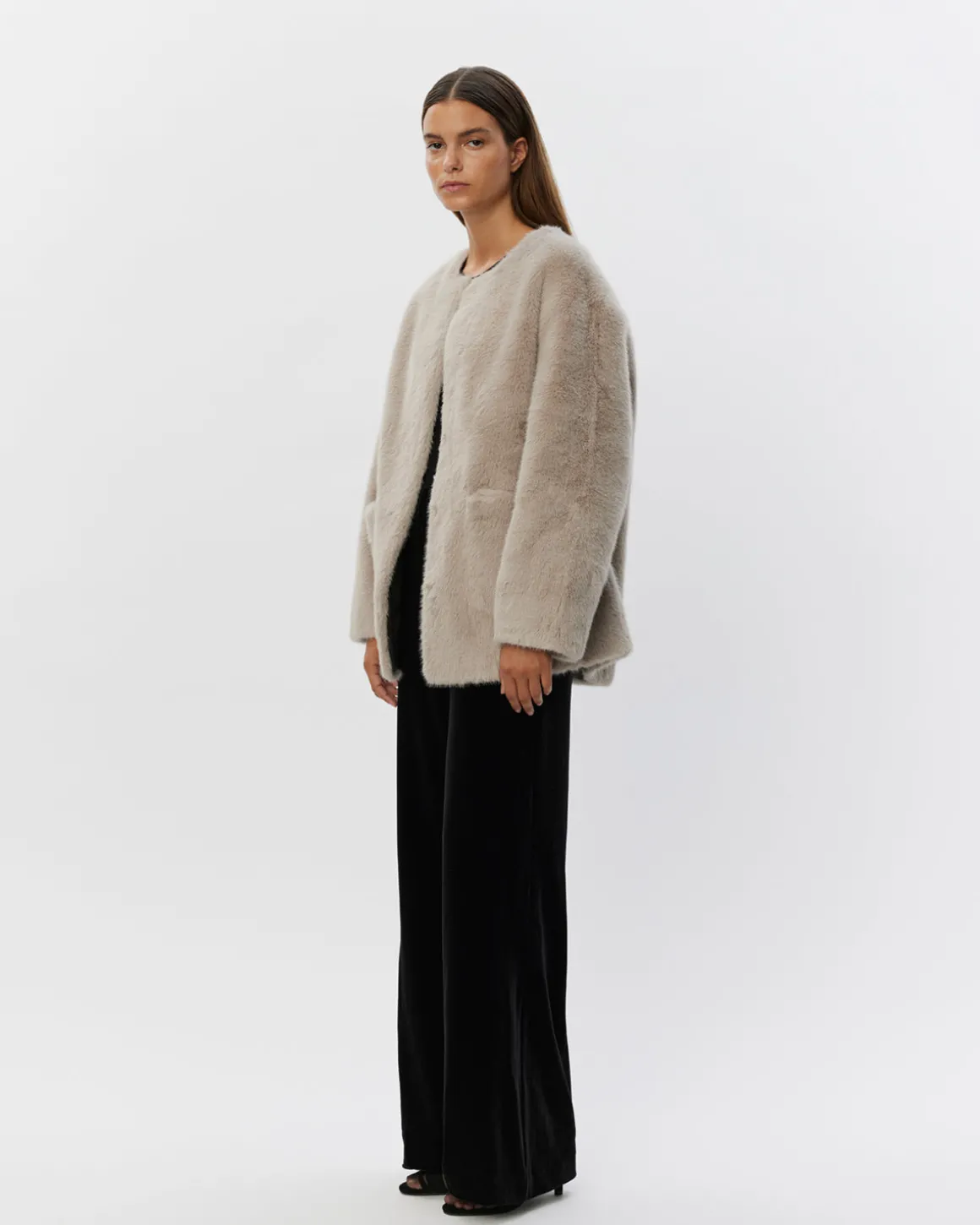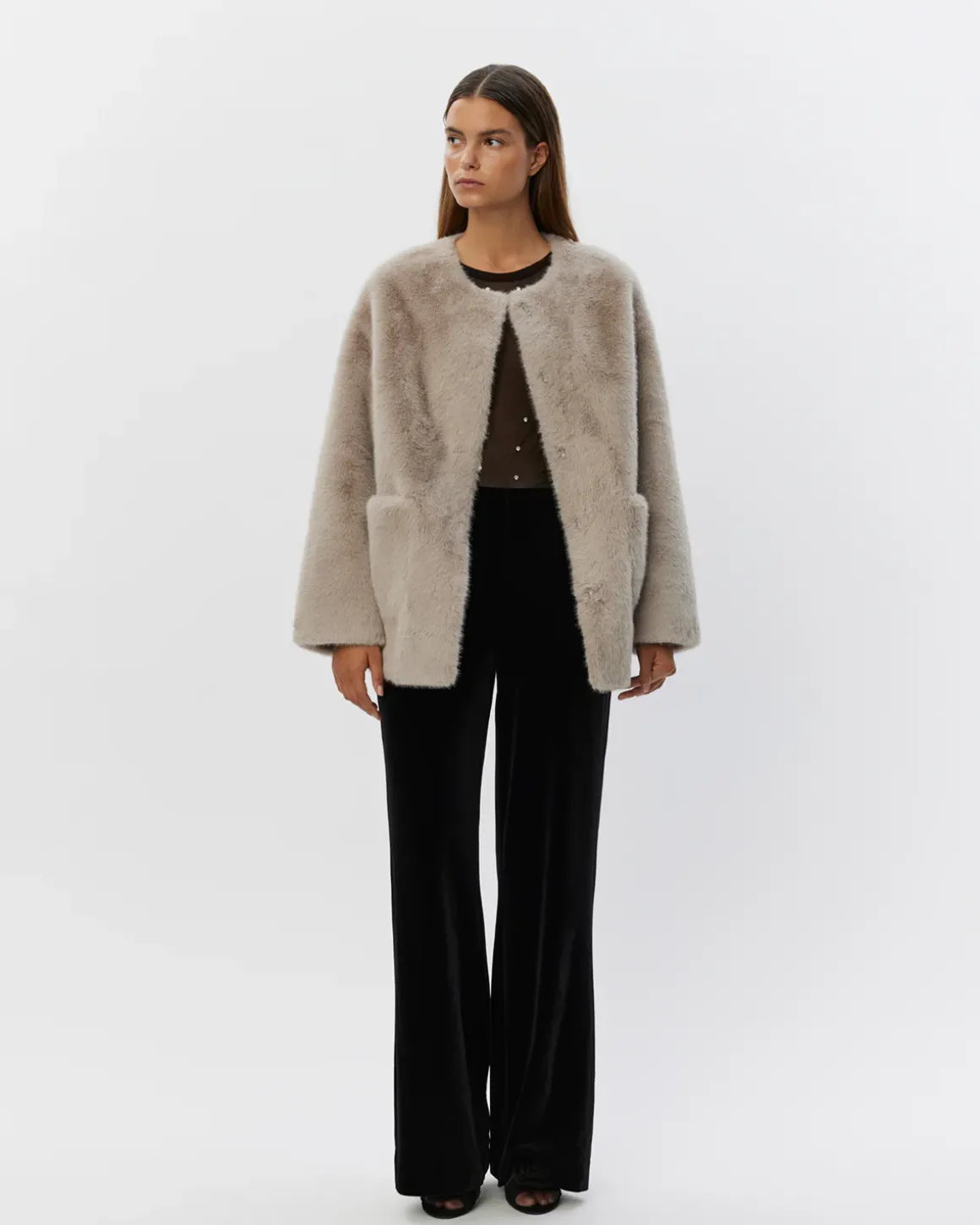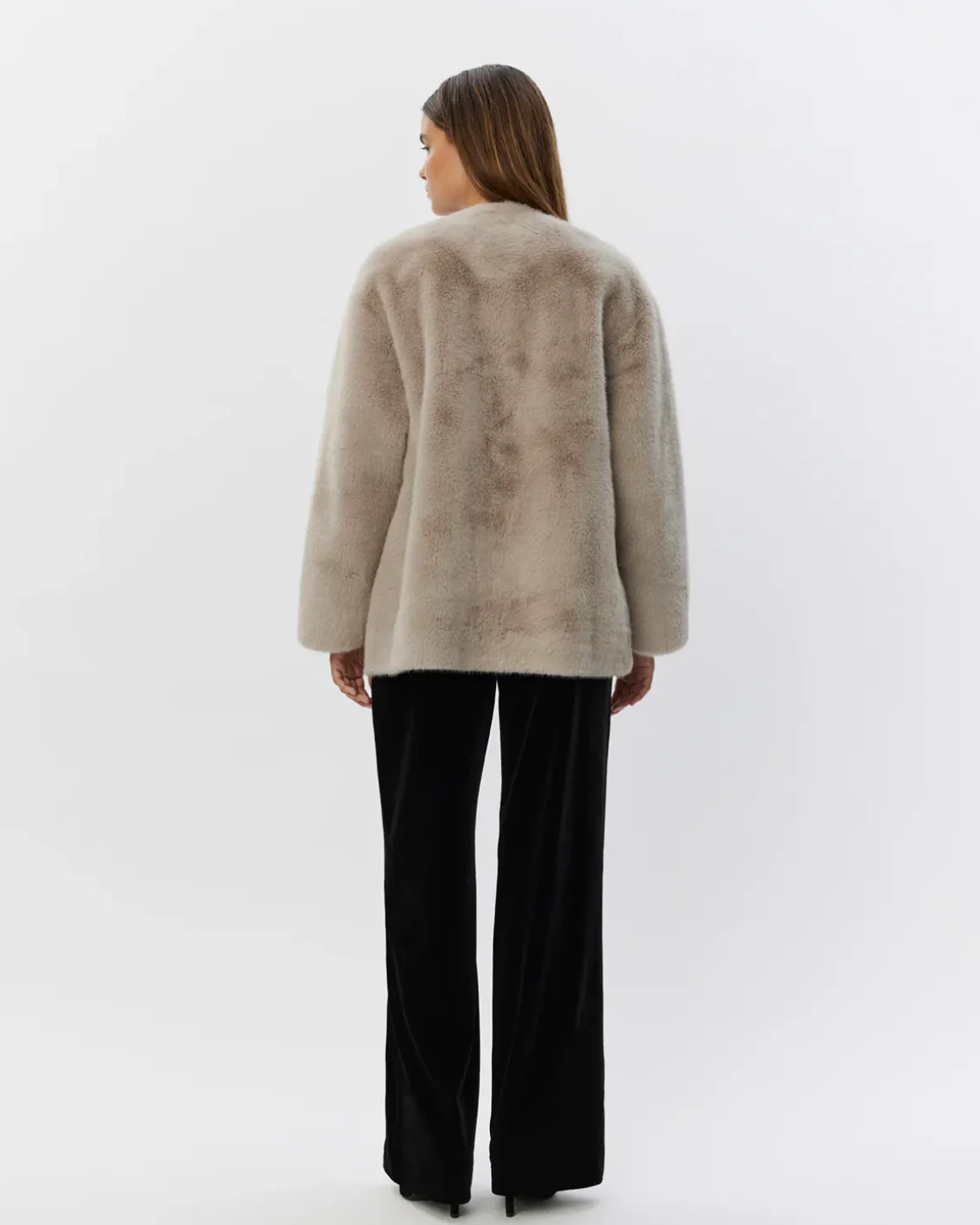 • The jacket is designed in 100% polyester, which gives a soft, fluffy texture.