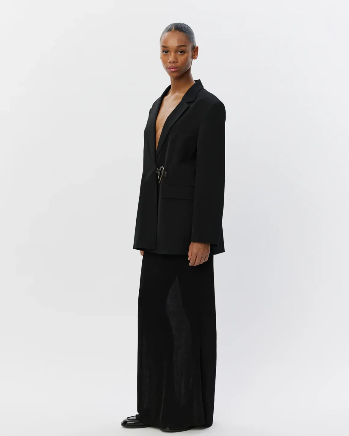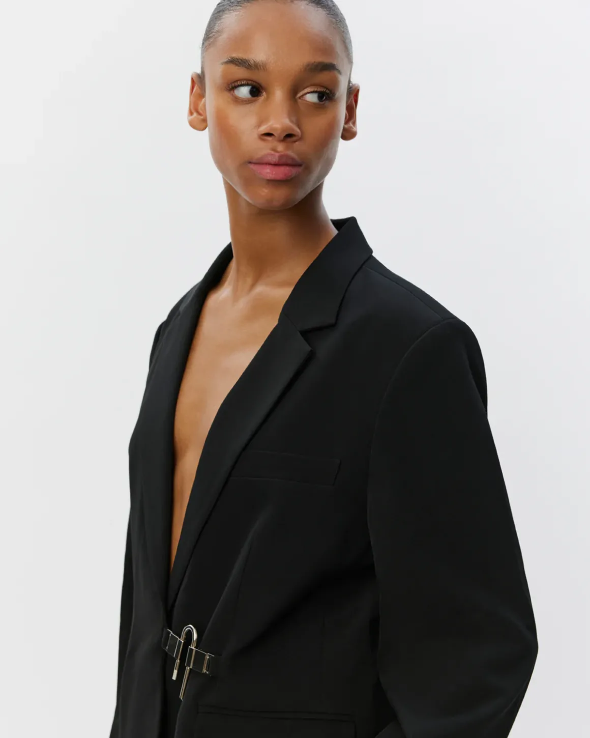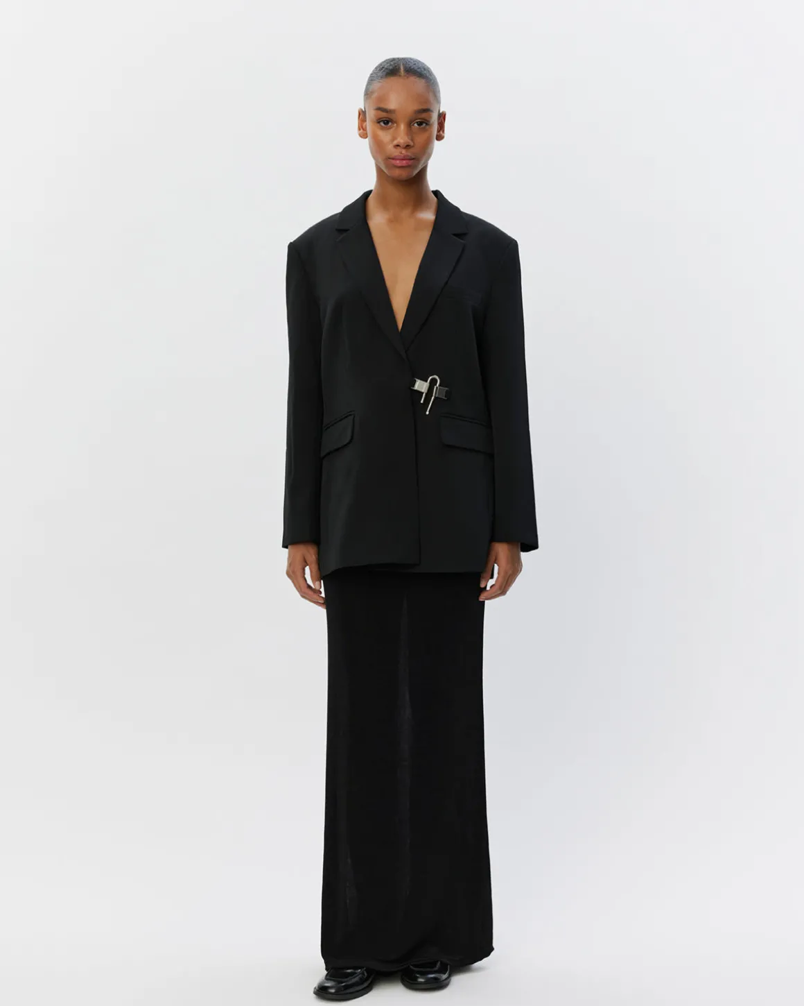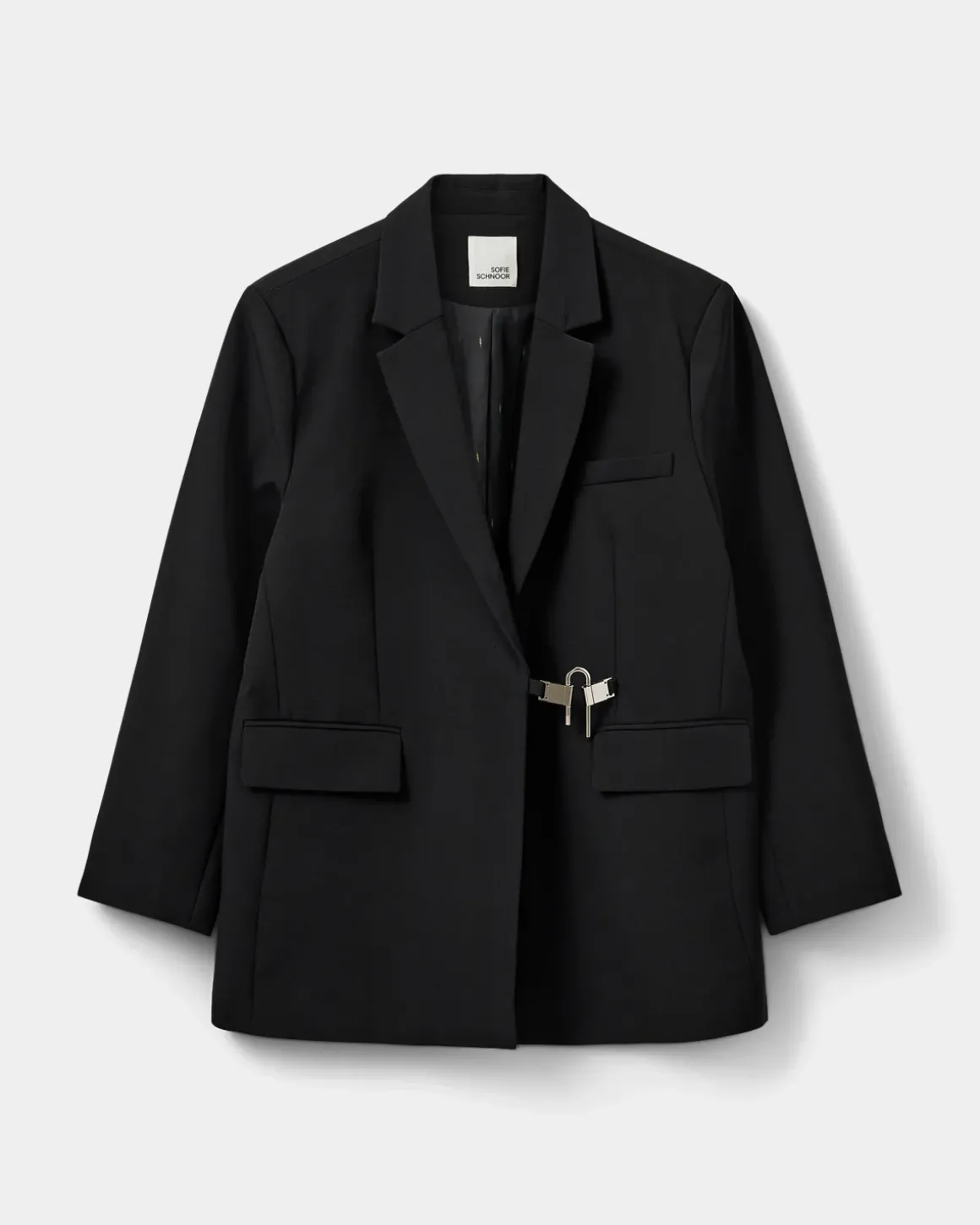 • The unique silver closure in the front stands out as a sophisticated detail that gives the blazer a modern twist and an elegant expression.