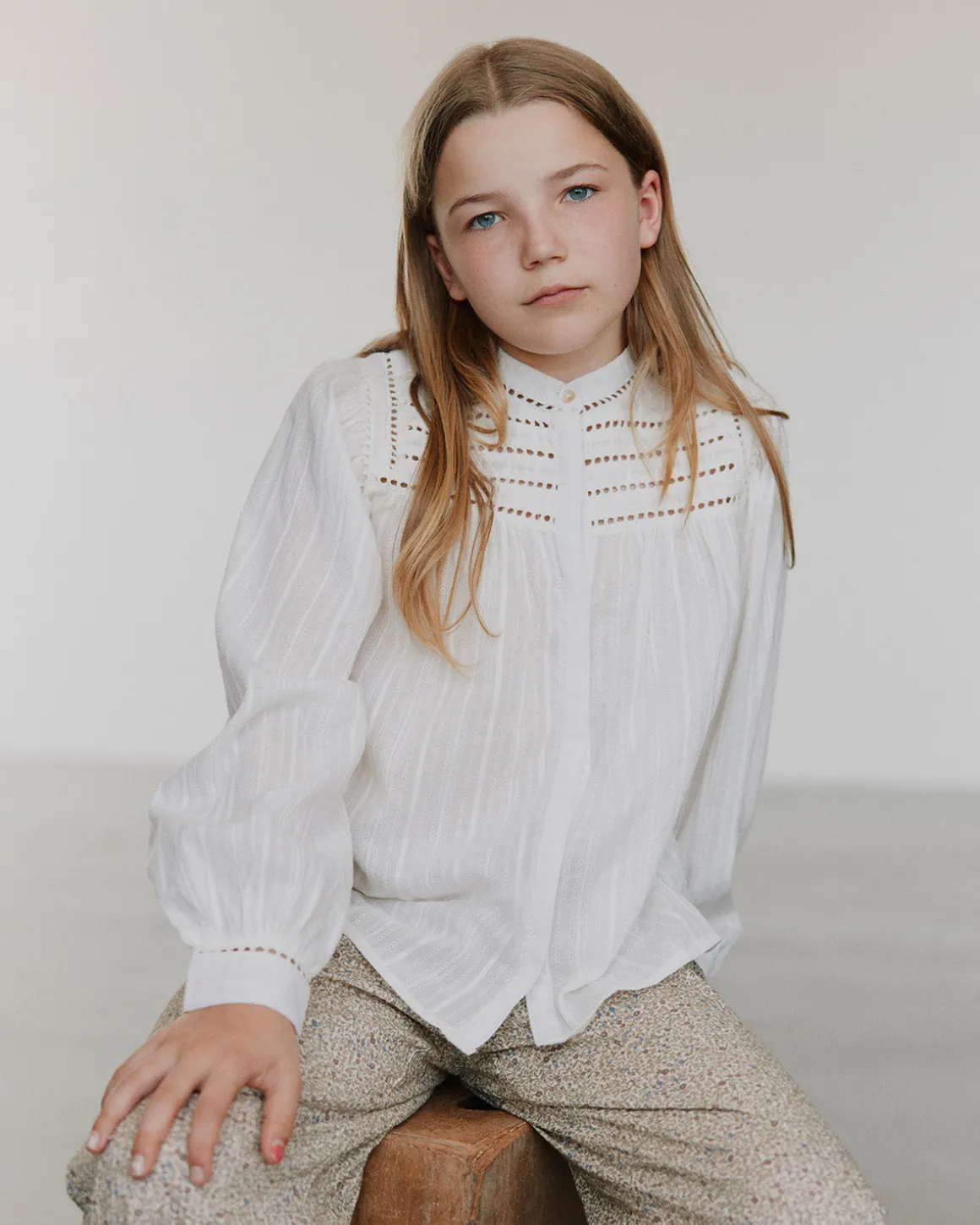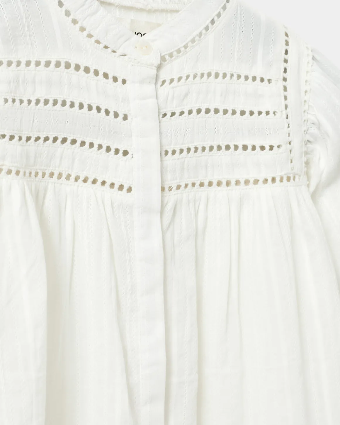 White shirt with embroidery details at the chest. The shirt has long sleeves, a round neckline, and button closure at the front. Made of 100% cotton.