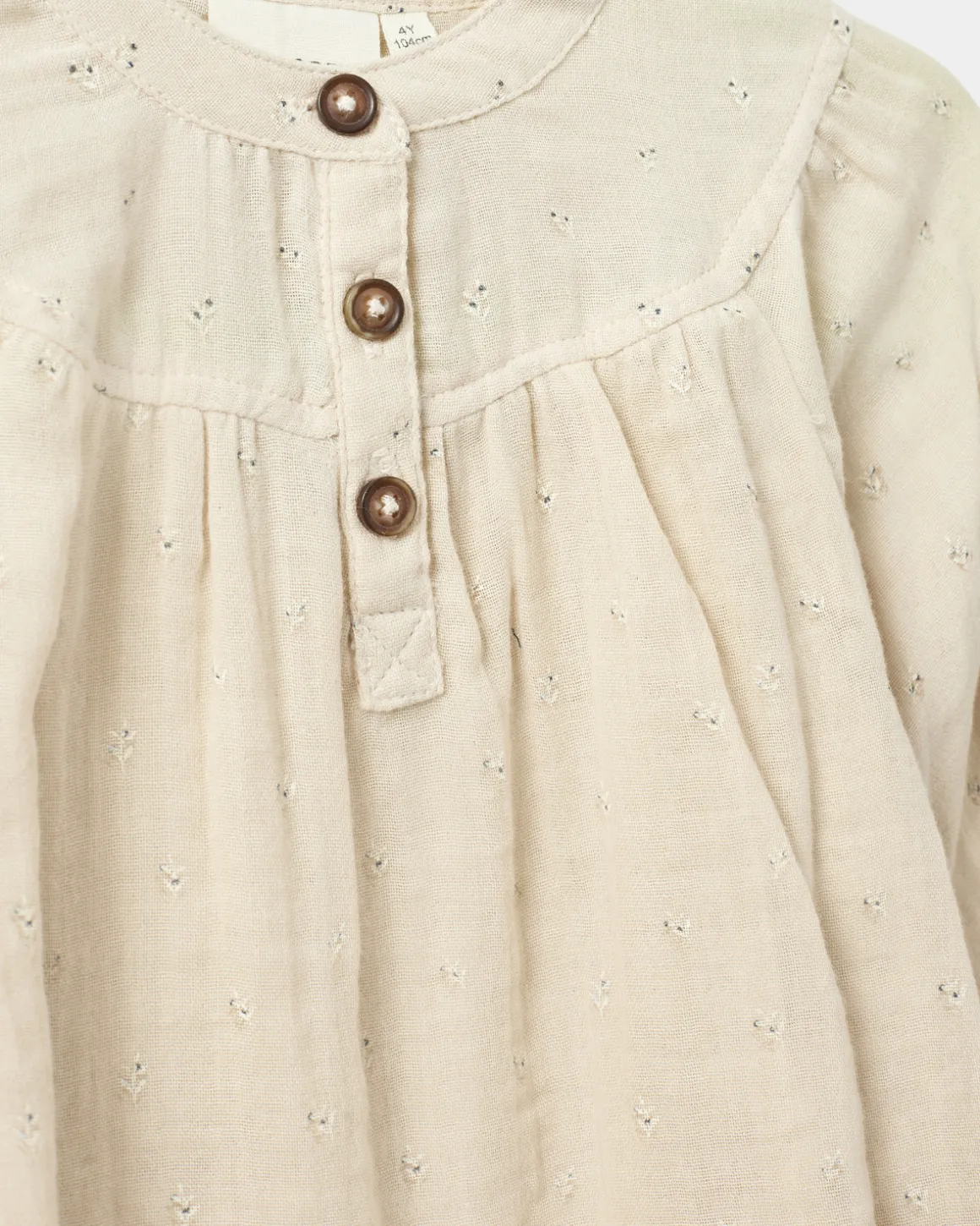 Off-white shirt with small pointelle details. The shirt has a button closure at the front, gathered details at the shoulders, and long slightly puffed sleeves. Made of 100% cotton.
