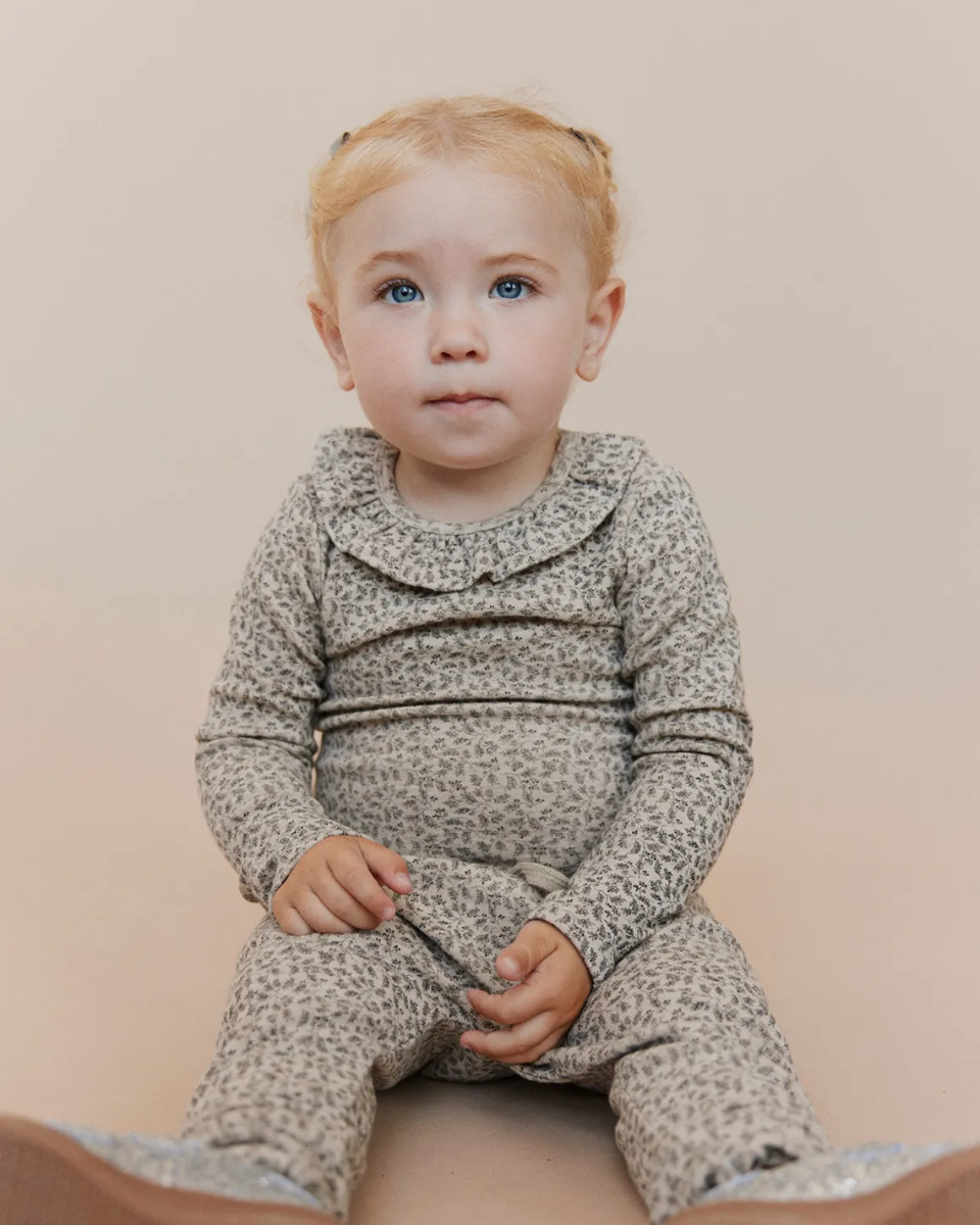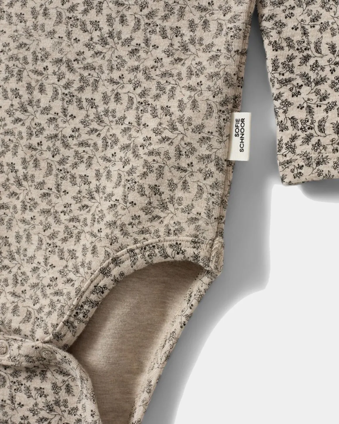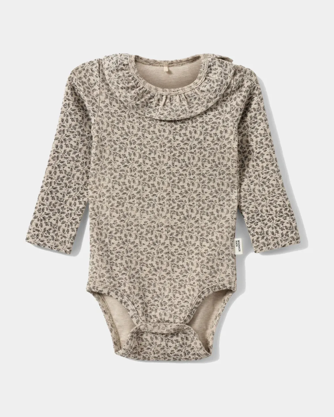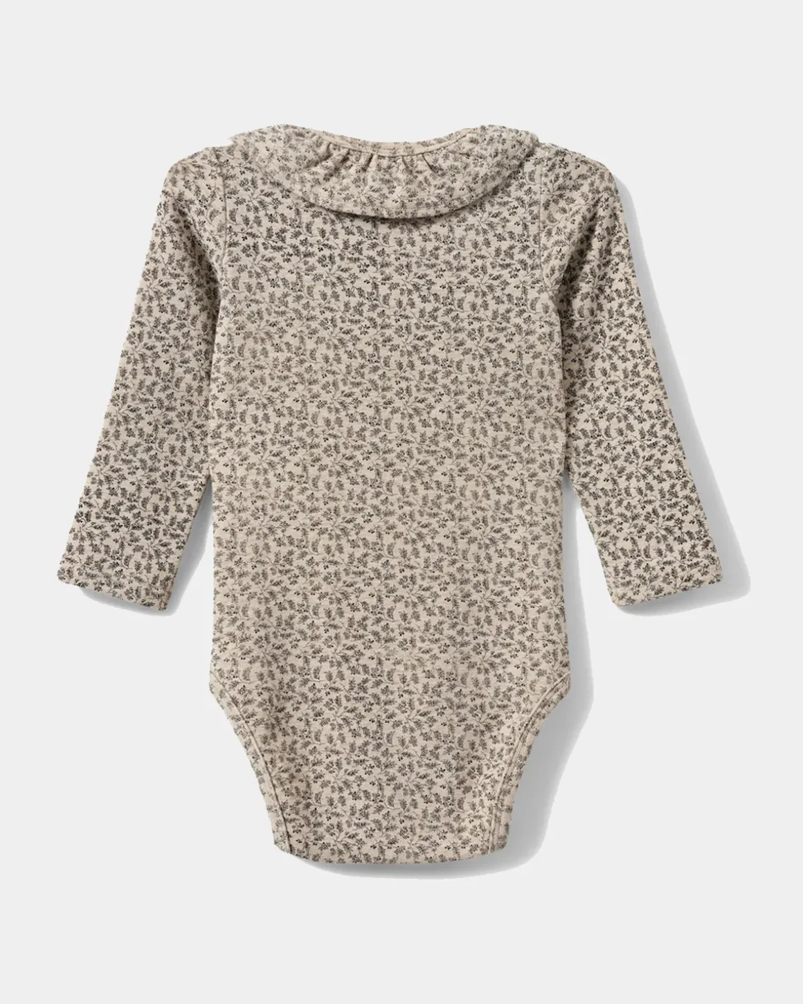 Bodysuit with floral print. The bodysuit has long sleeves and a sweet ruffle collar. Made in a blend of cotton, modal, and spandex.