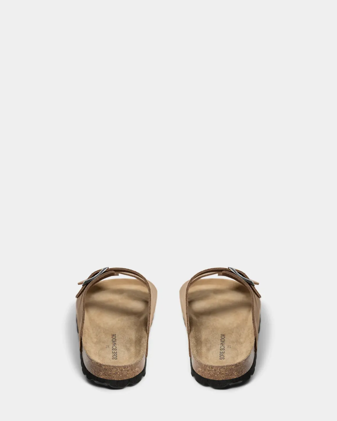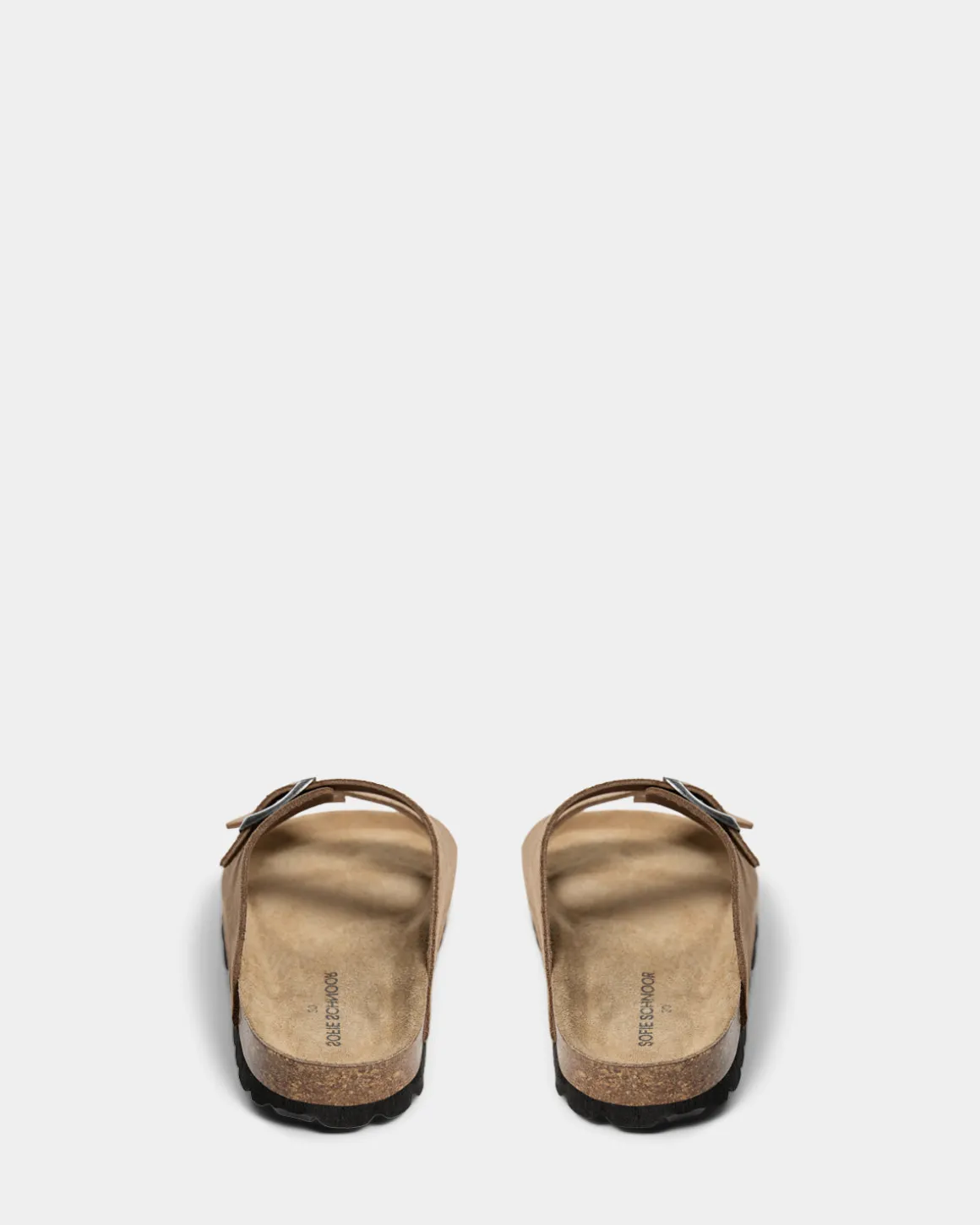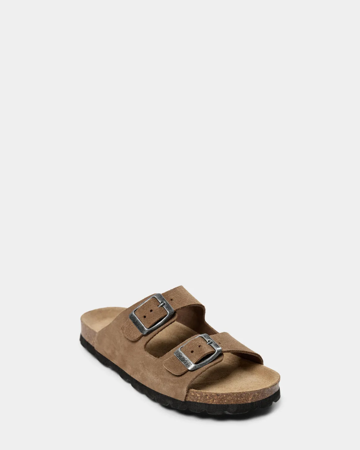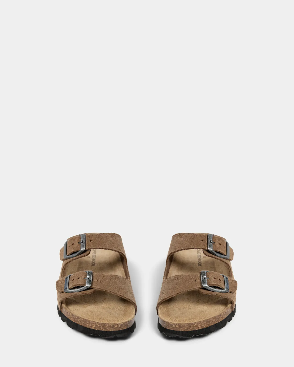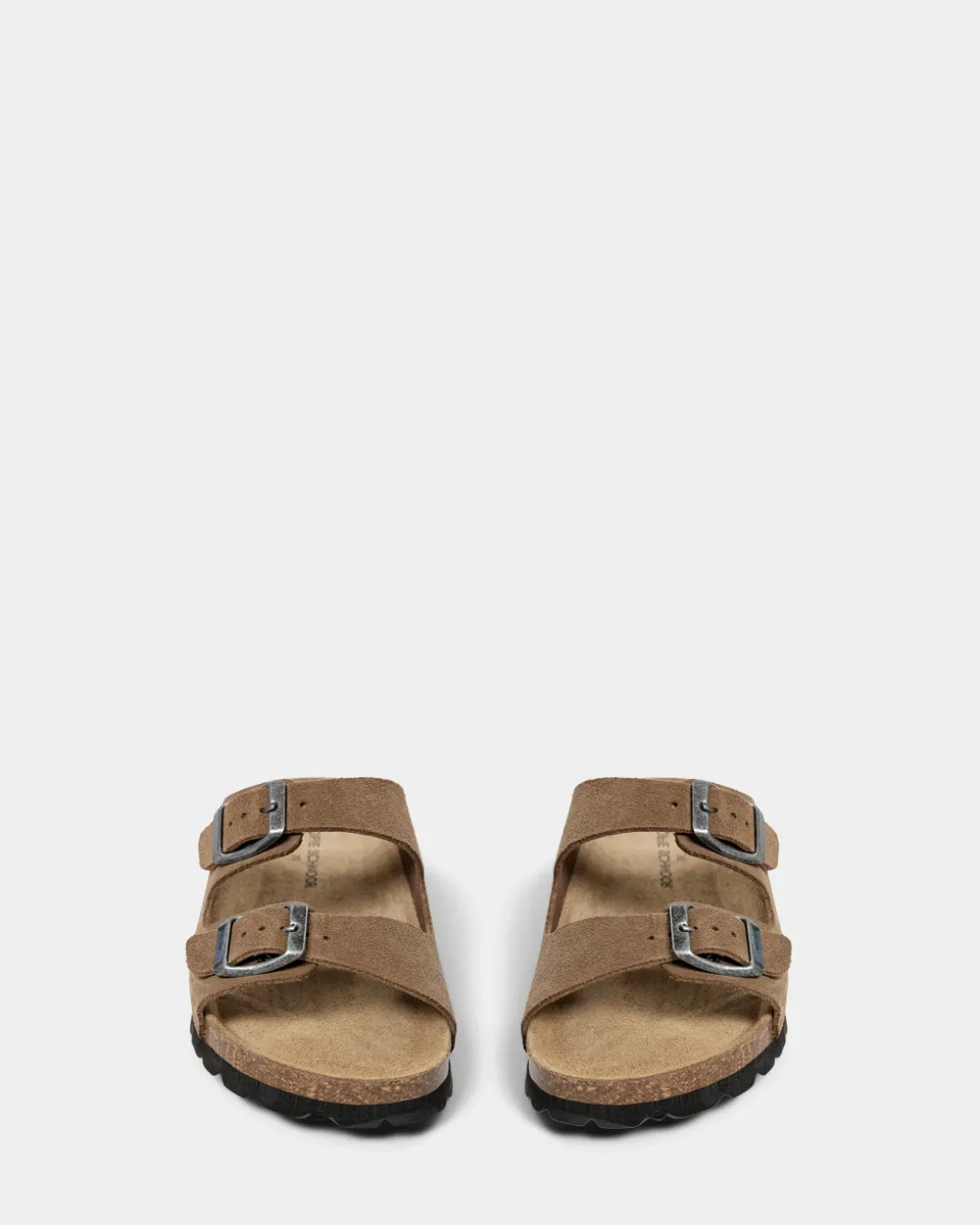 Sandal in the color dark sand. The sandal has two adjustable straps with buckles and an ergonomically molded sole for extra comfort. The upper is made of 100% suede, the insole of 100% leather, and the outsole of rubber.