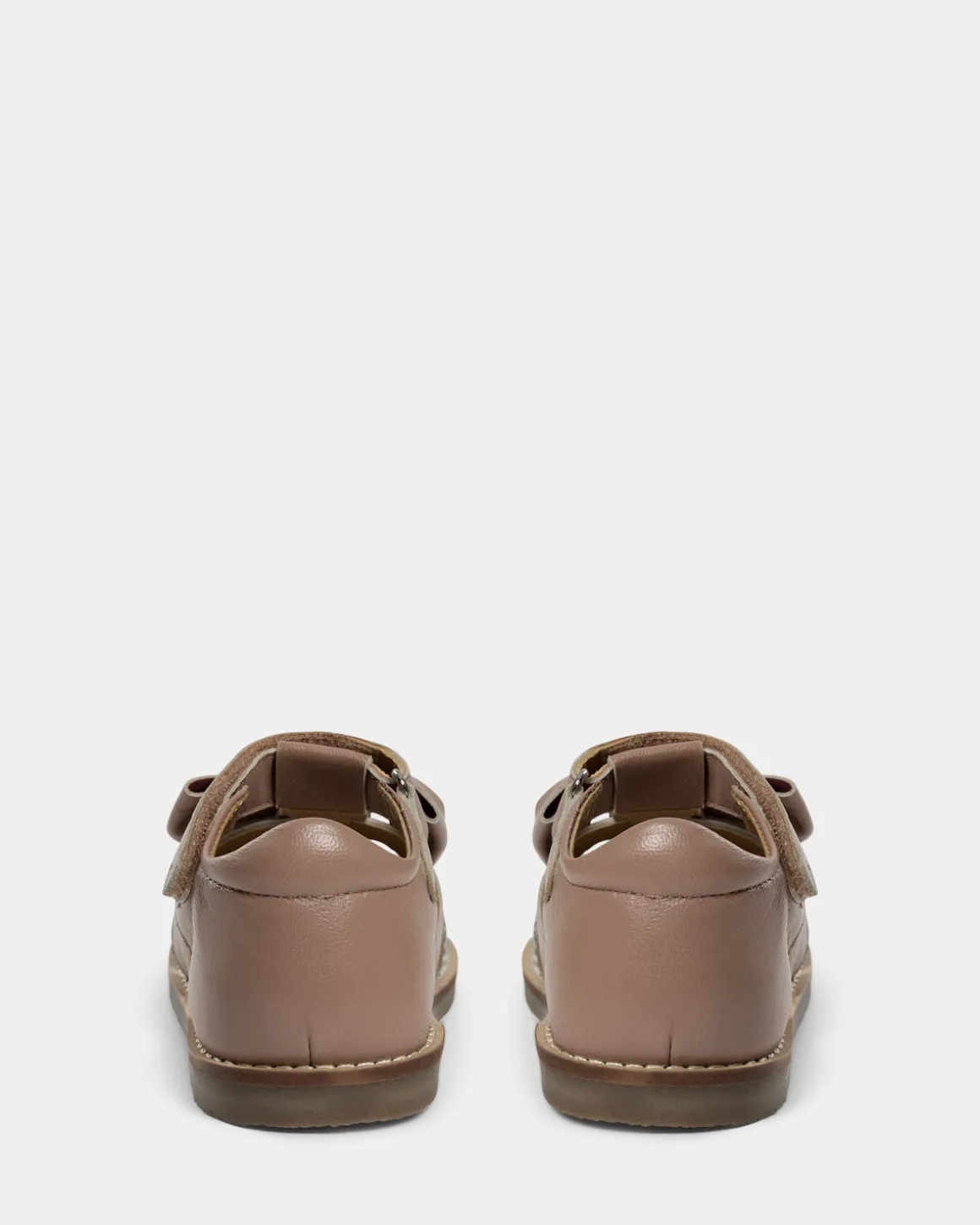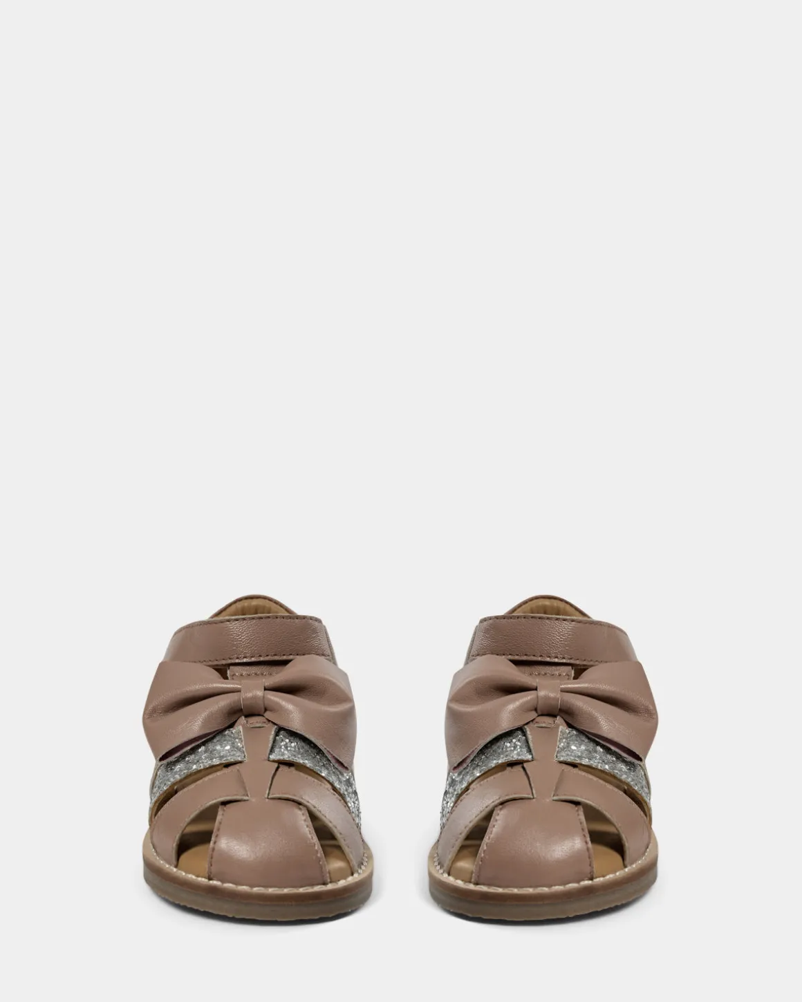 Sandals with a combination of leather and glitter details. The sandals feature a cute bow at the front, velcro strap for easy adjustment, and a sturdy rubber outsole for good grip. Made of 100% leather and 100% rubber.
