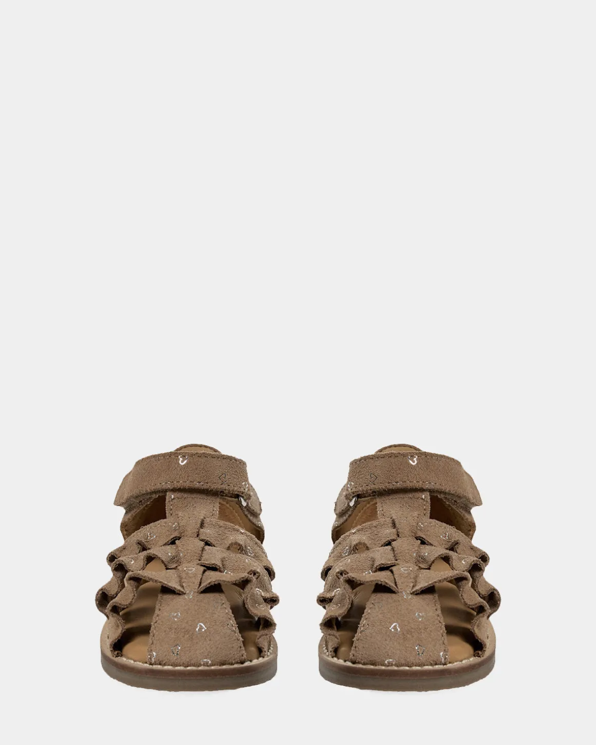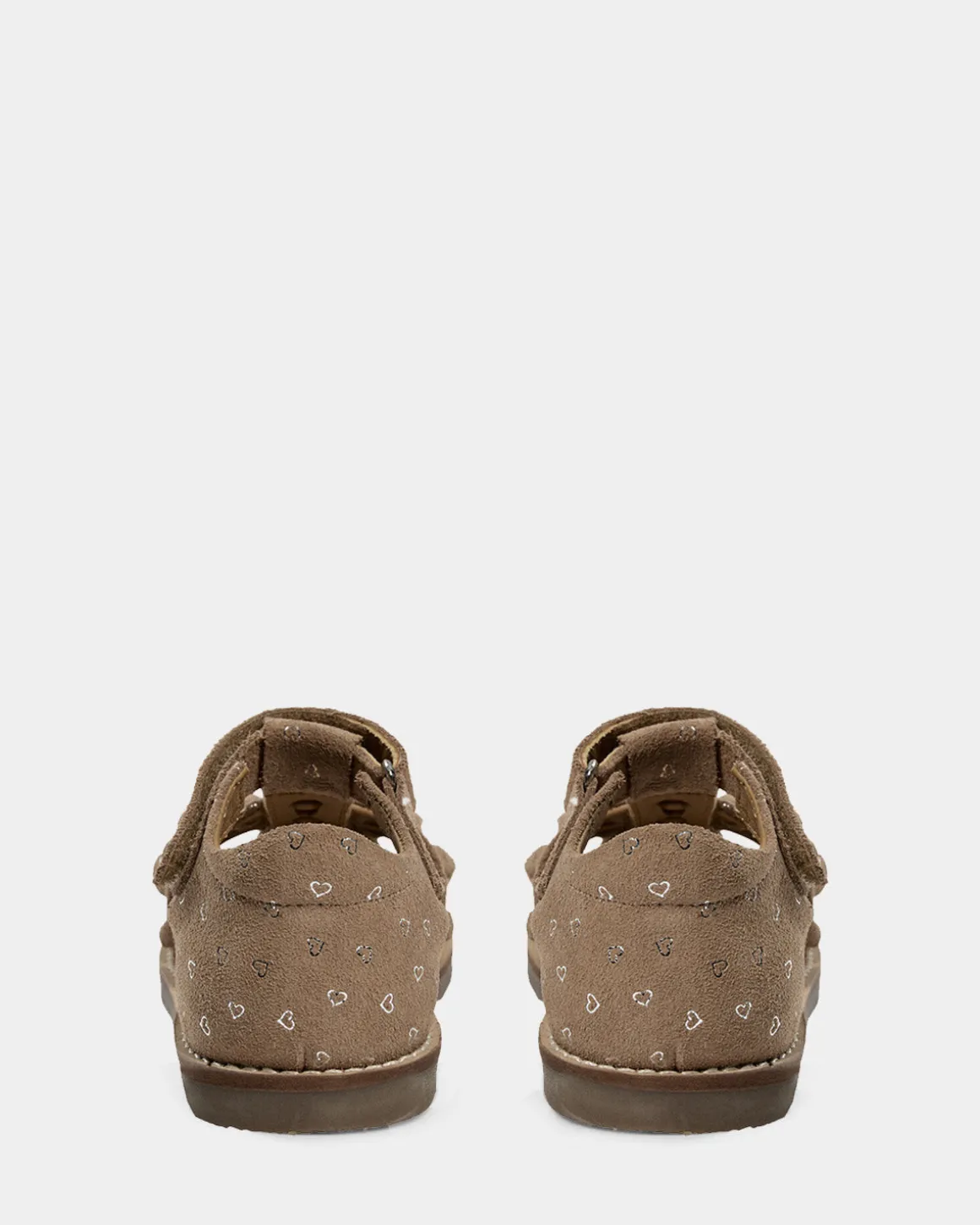 Suede sandals with small heart prints. The sandals have an adjustable velcro closure and an open design that ensures breathability. Made of 100% suede with leather lining and a durable rubber sole.