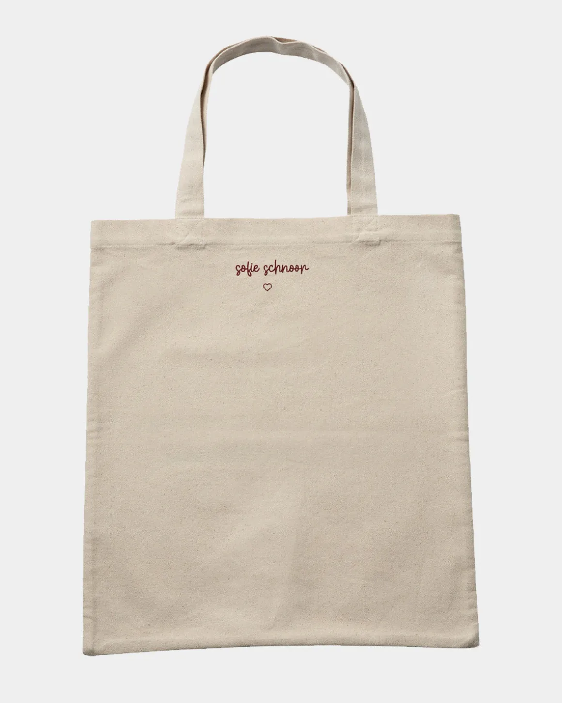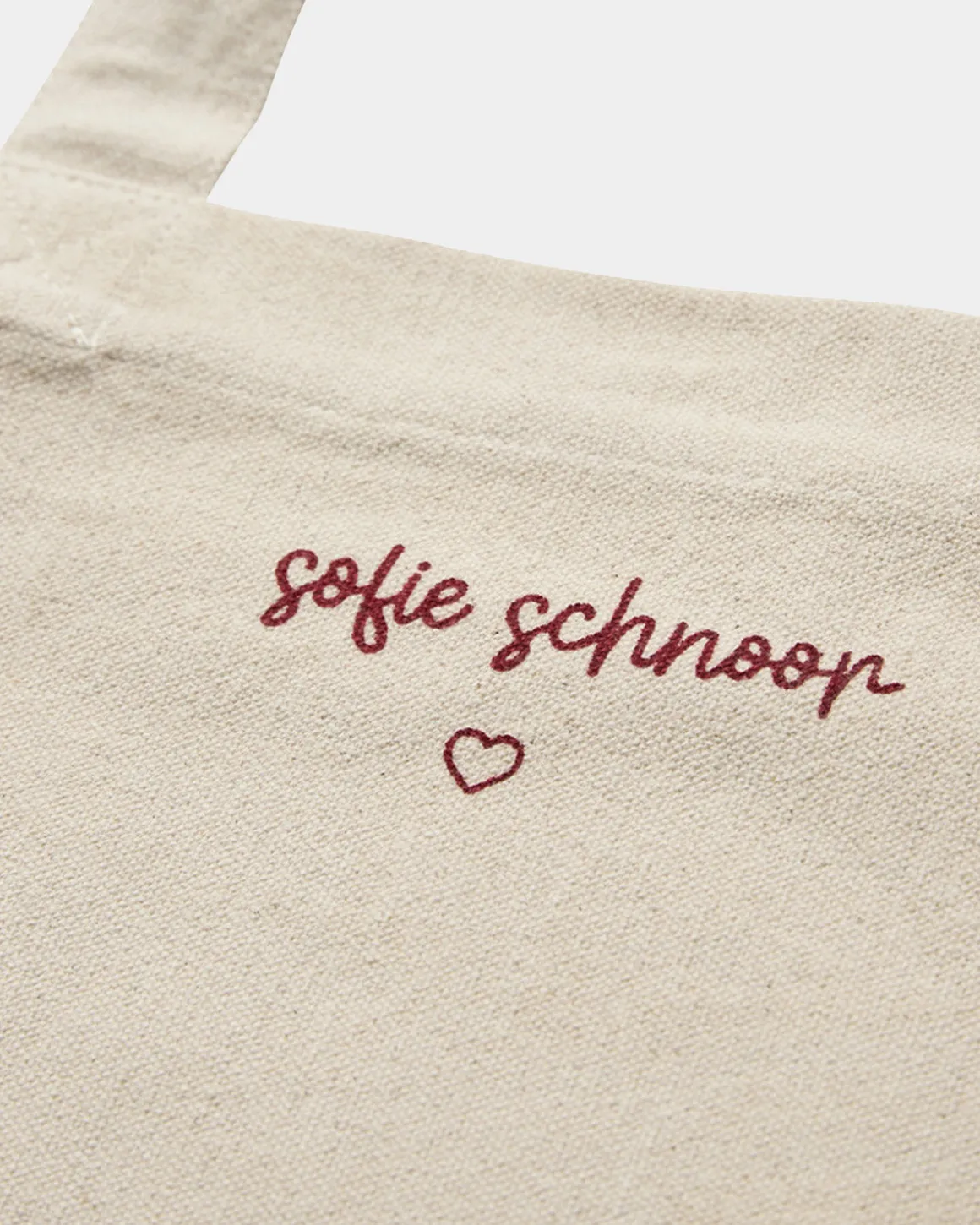 Tote bag in cream-colored cotton with cherry print and the text ”Return to the source” in dark red. The bag has two handles and is made of 100% cotton.