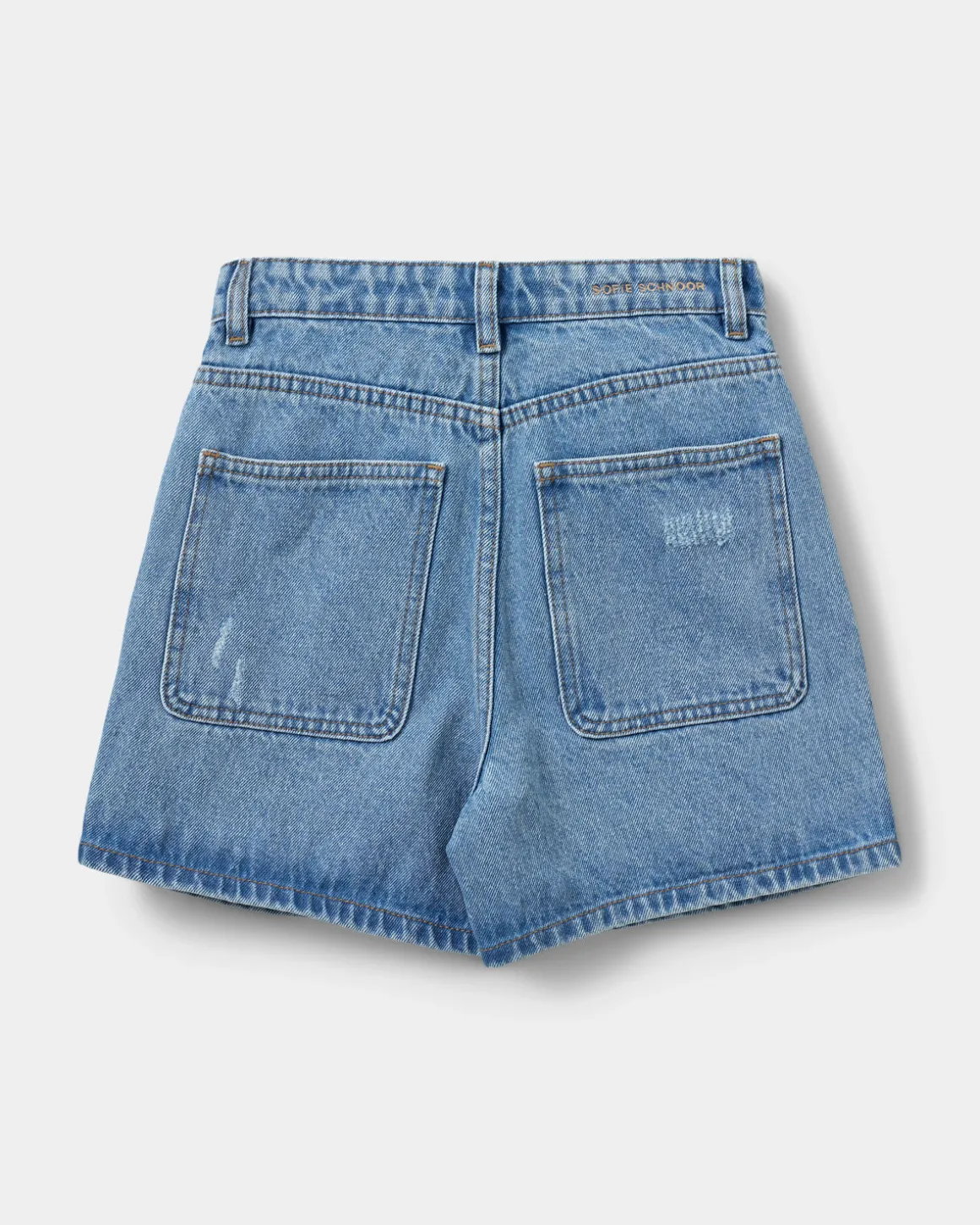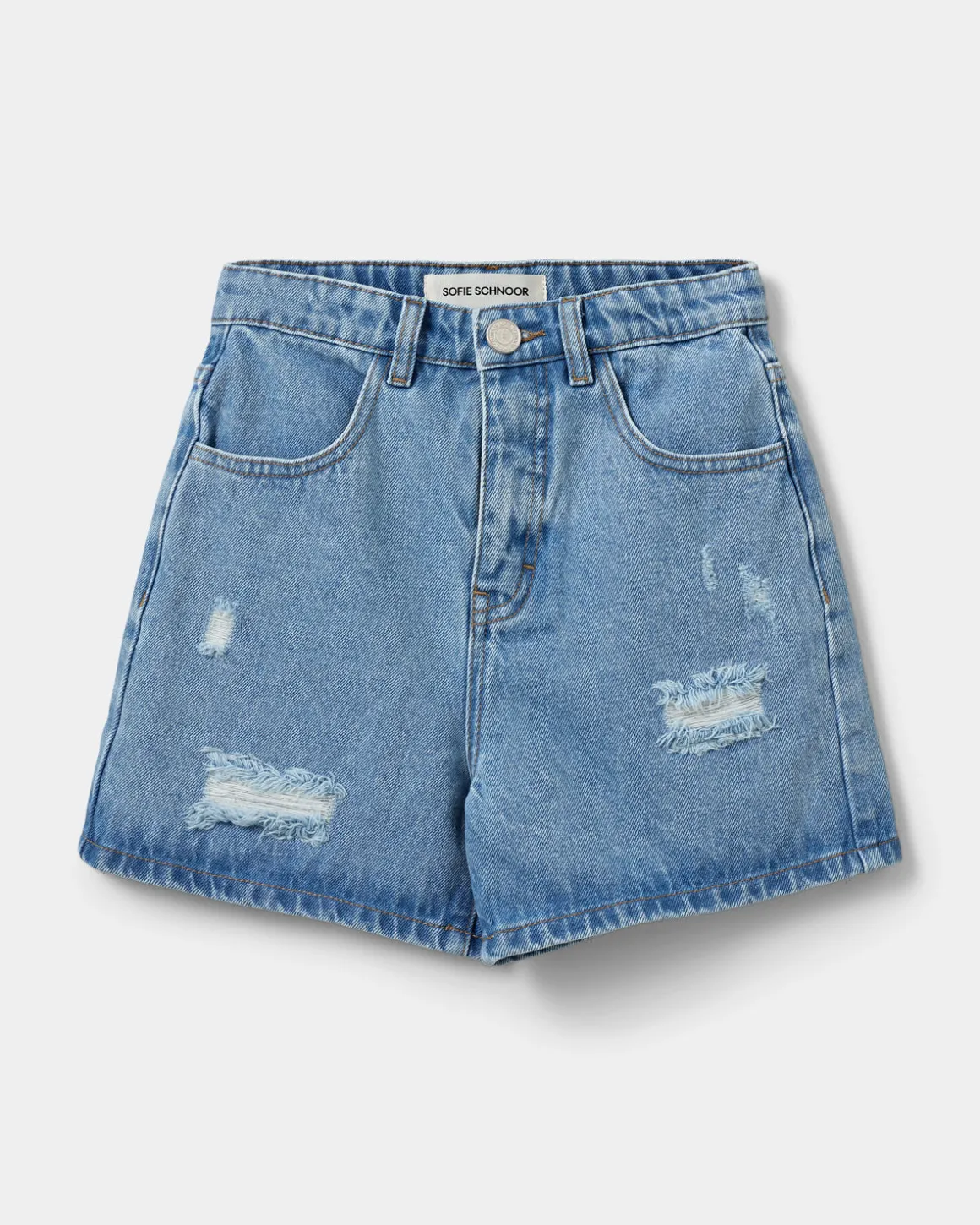 • Denim shorts with high waist and distressed details. • The shorts have five pockets, belt loops, and close with a zipper and button.