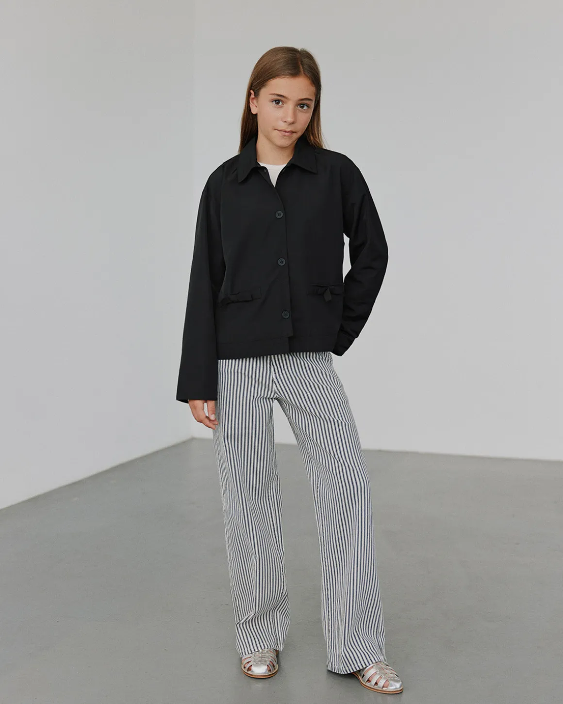 Black jacket with a classic collar, button closure at the front, and two front pockets with cute bow details.