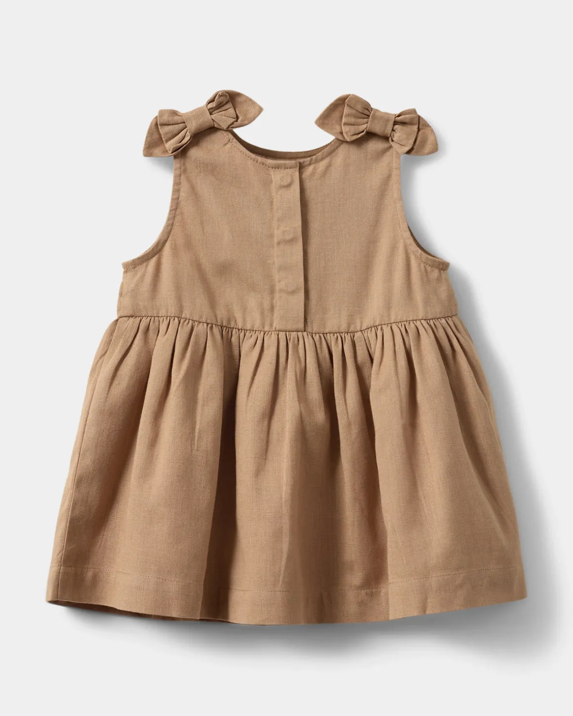 • Dress with bow details on the shoulders, round neckline and button closure at the back