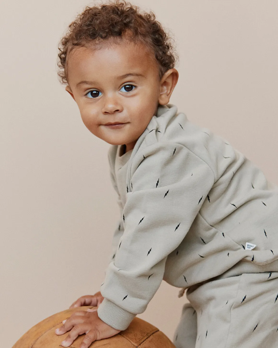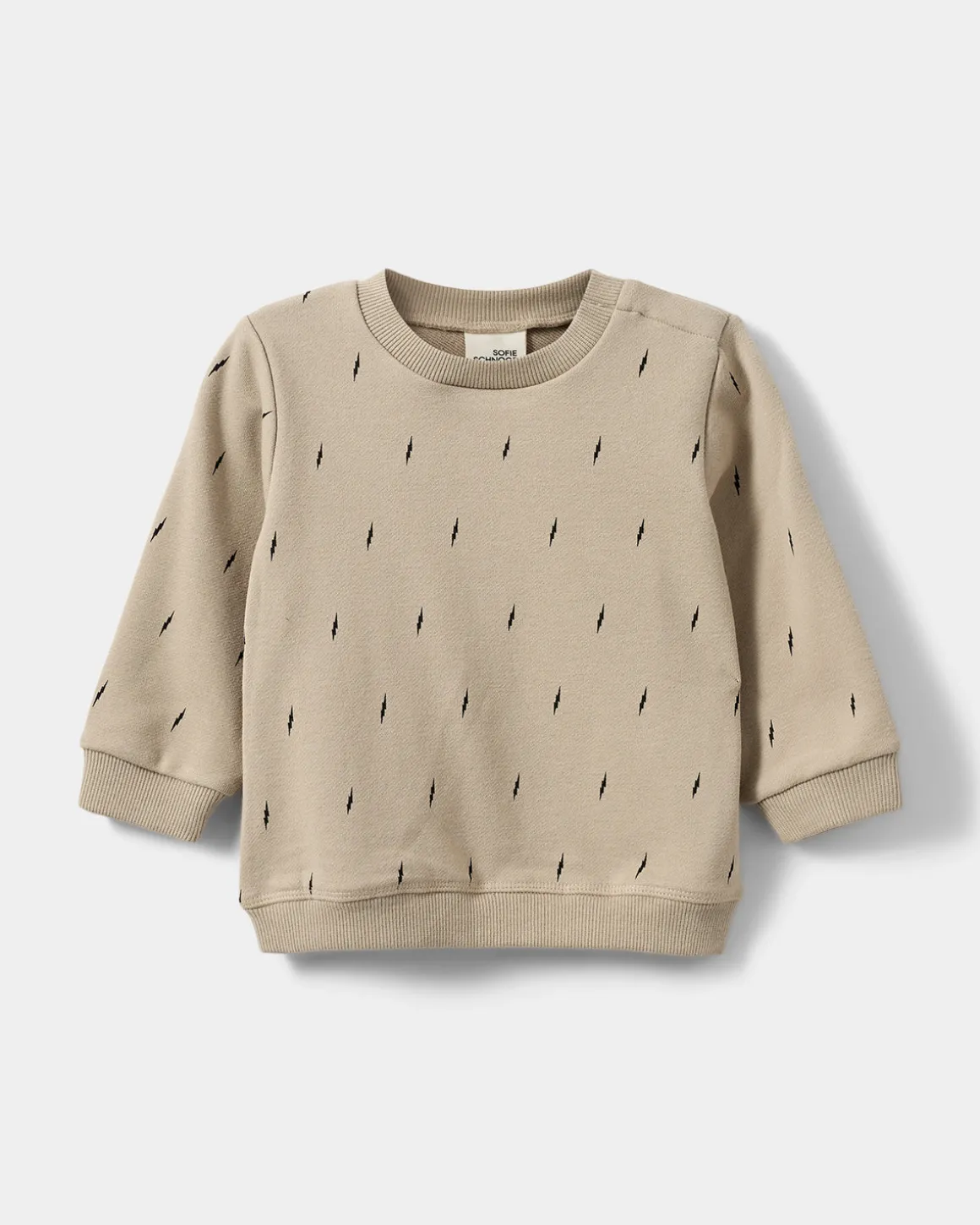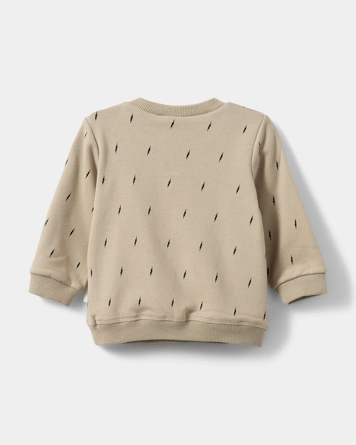 Beige sweatshirt with small, black lightning print. The sweatshirt has long sleeves and elastic at the waist and cuffs. Made in a soft blend of 87% Cotton 10% Polyester 3% Spandex.