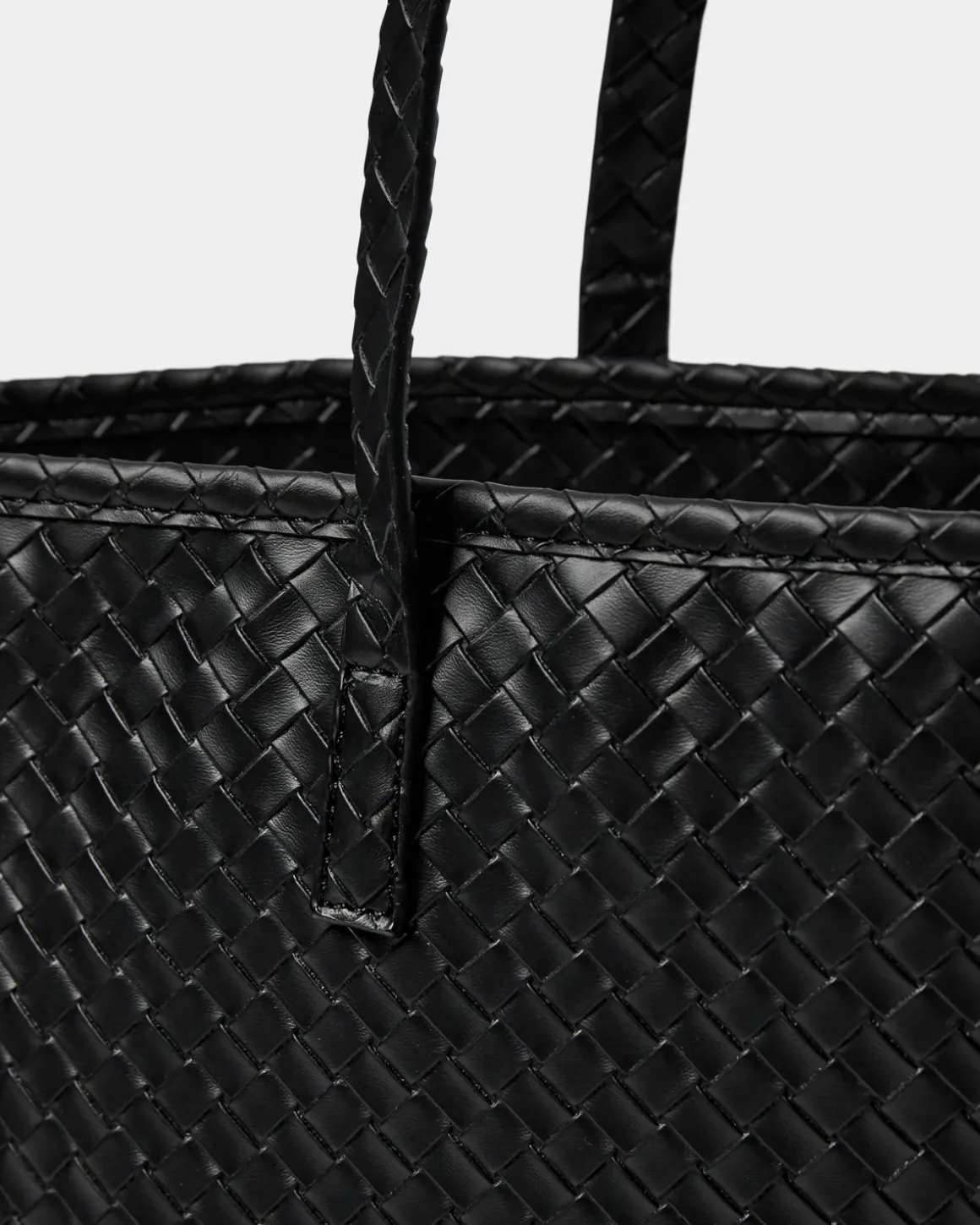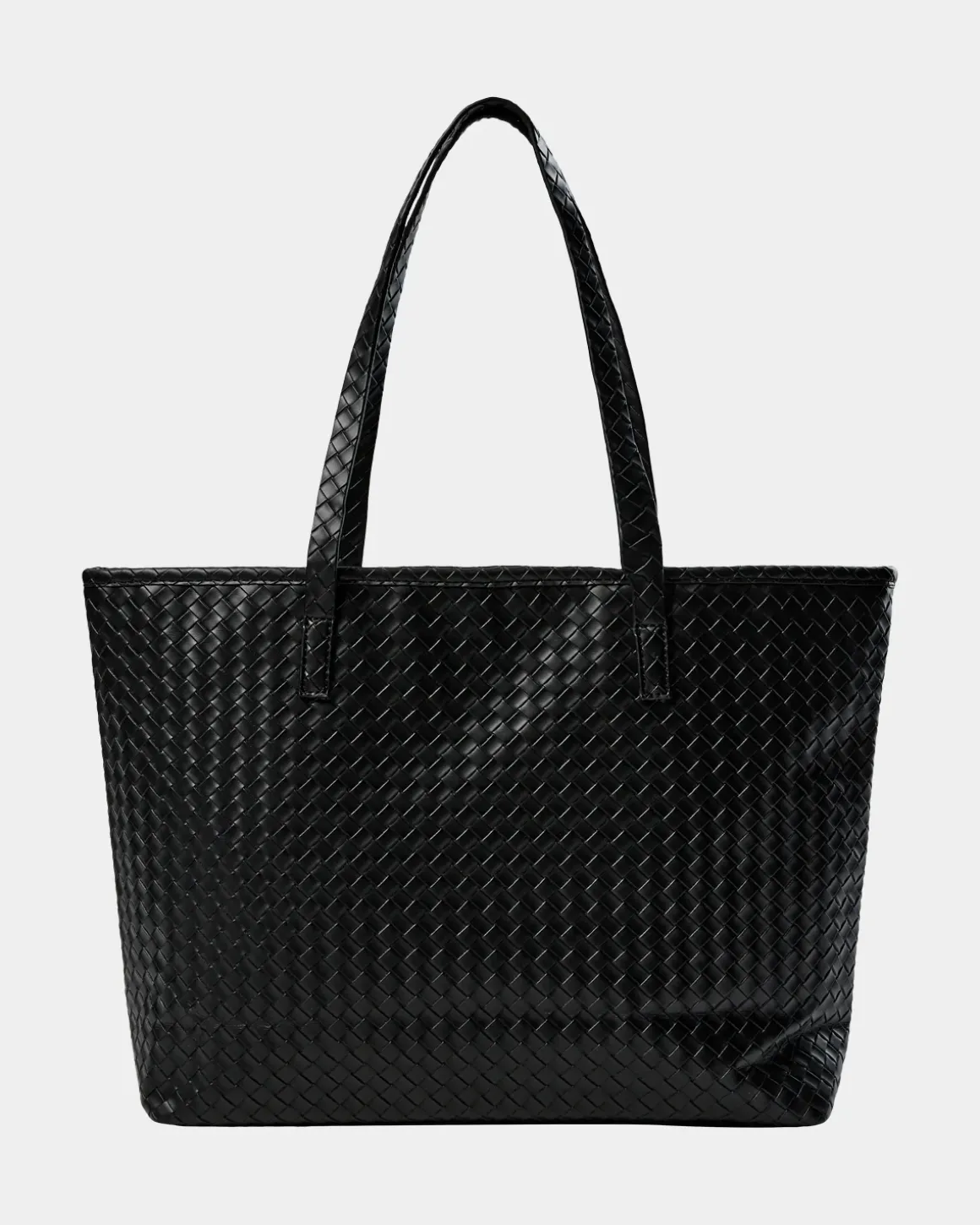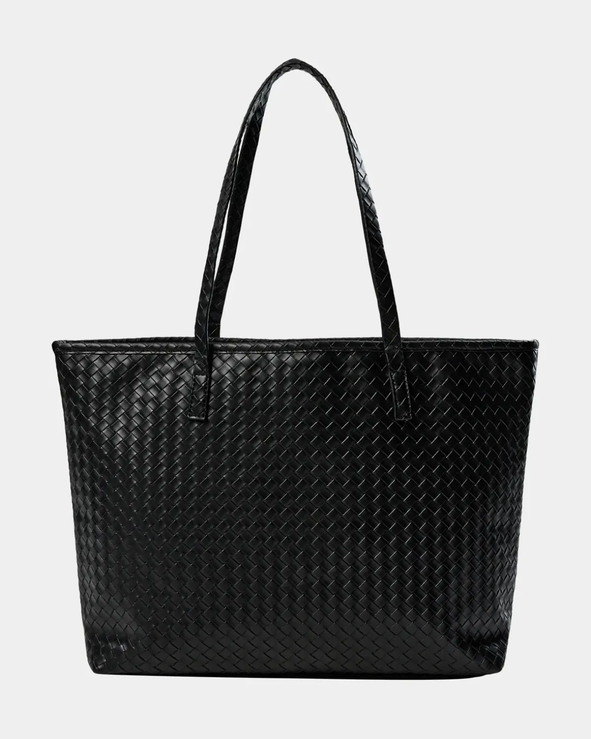 Large shopper bag in black braided imitation leather. The bag has an open main compartment with plenty of space.