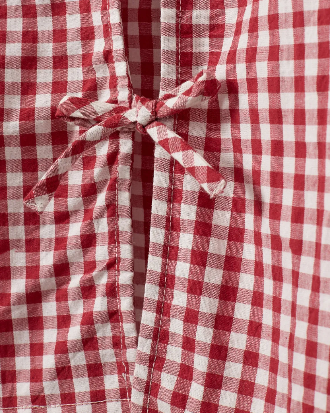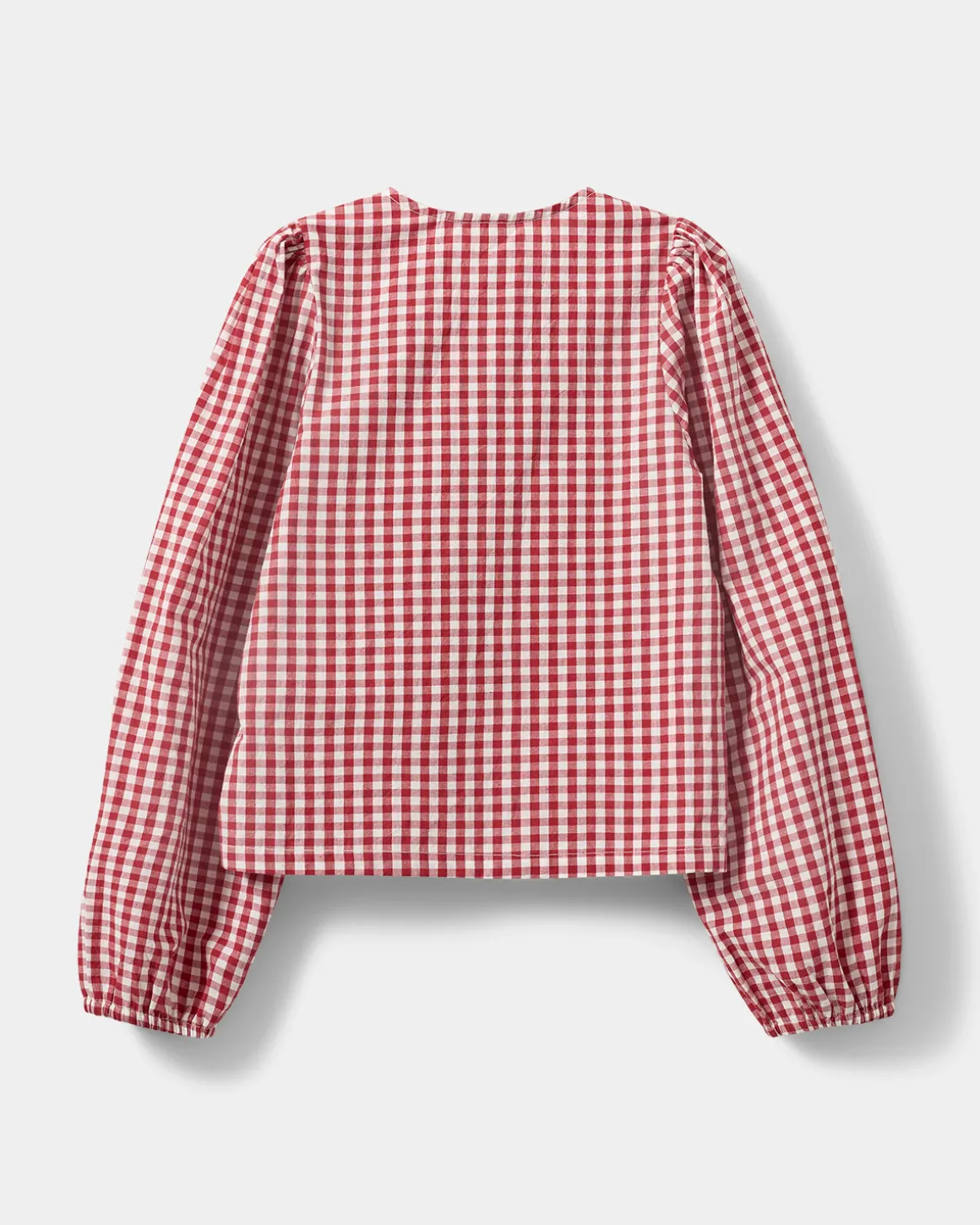Sweet red and white checkered shirt blouse. The blouse has pretty bow ties on the front and slightly puffed sleeves. Designed in 100% cotton.