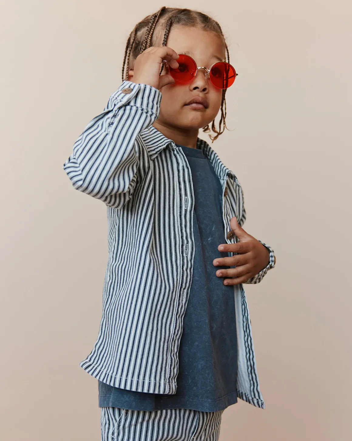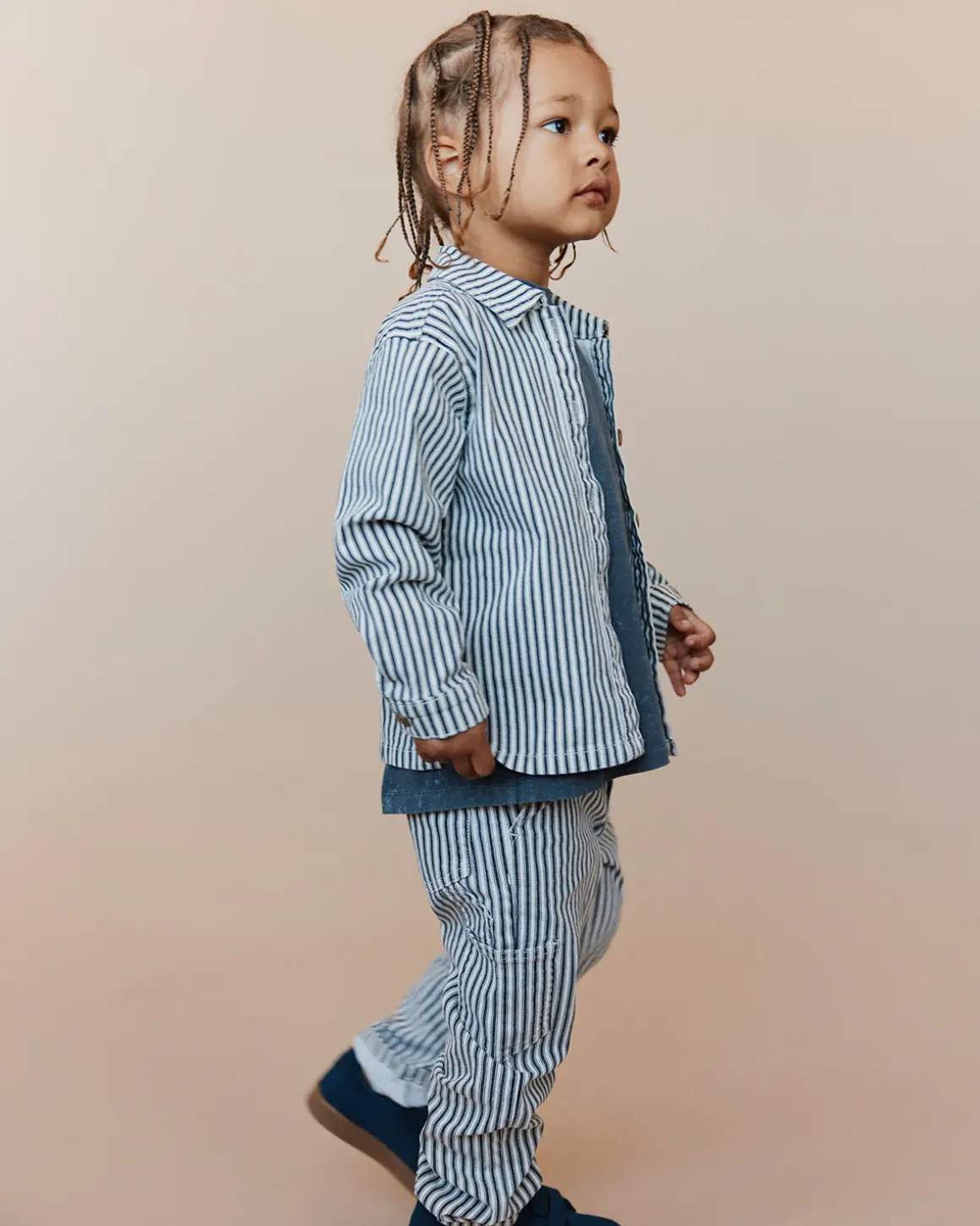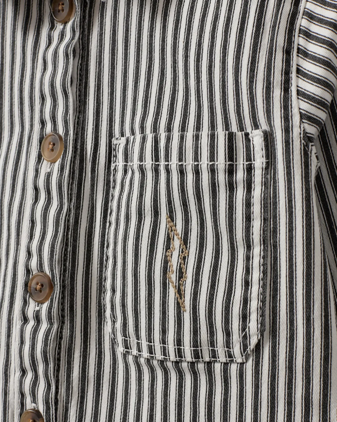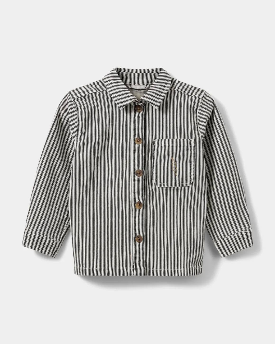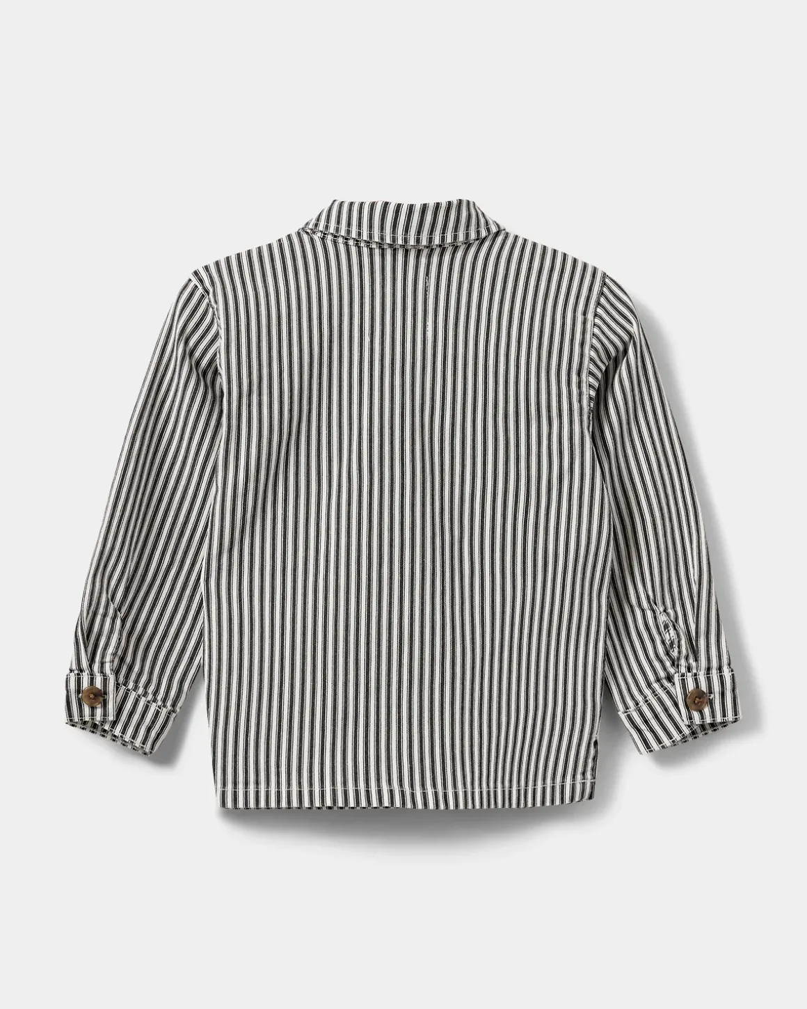 Sweet denim jacket with black and white stripes. The jacket features a classic collar, button closure at the front, and a small pocket with a zipper detail. Made in a lovely cotton blend.