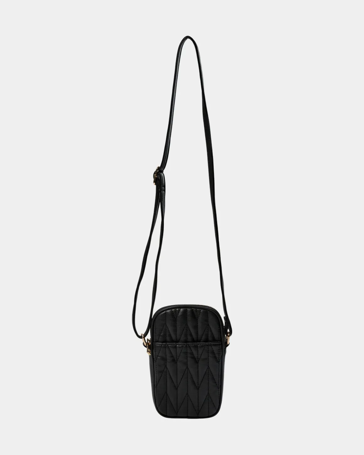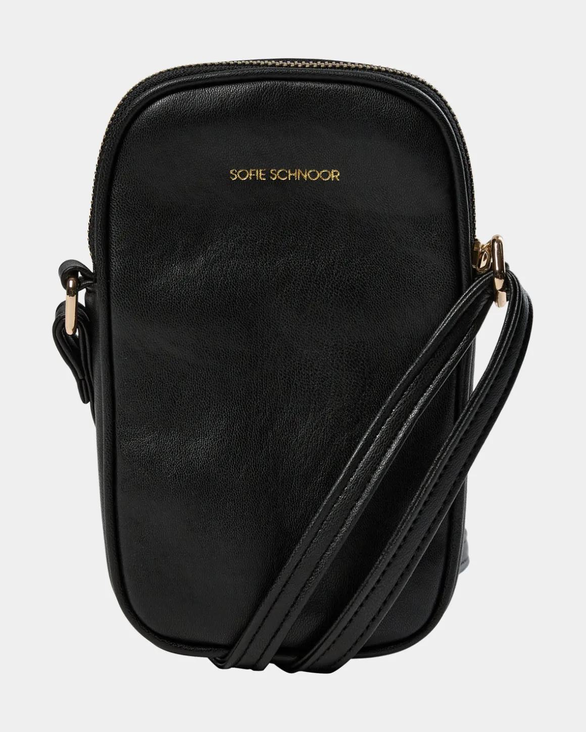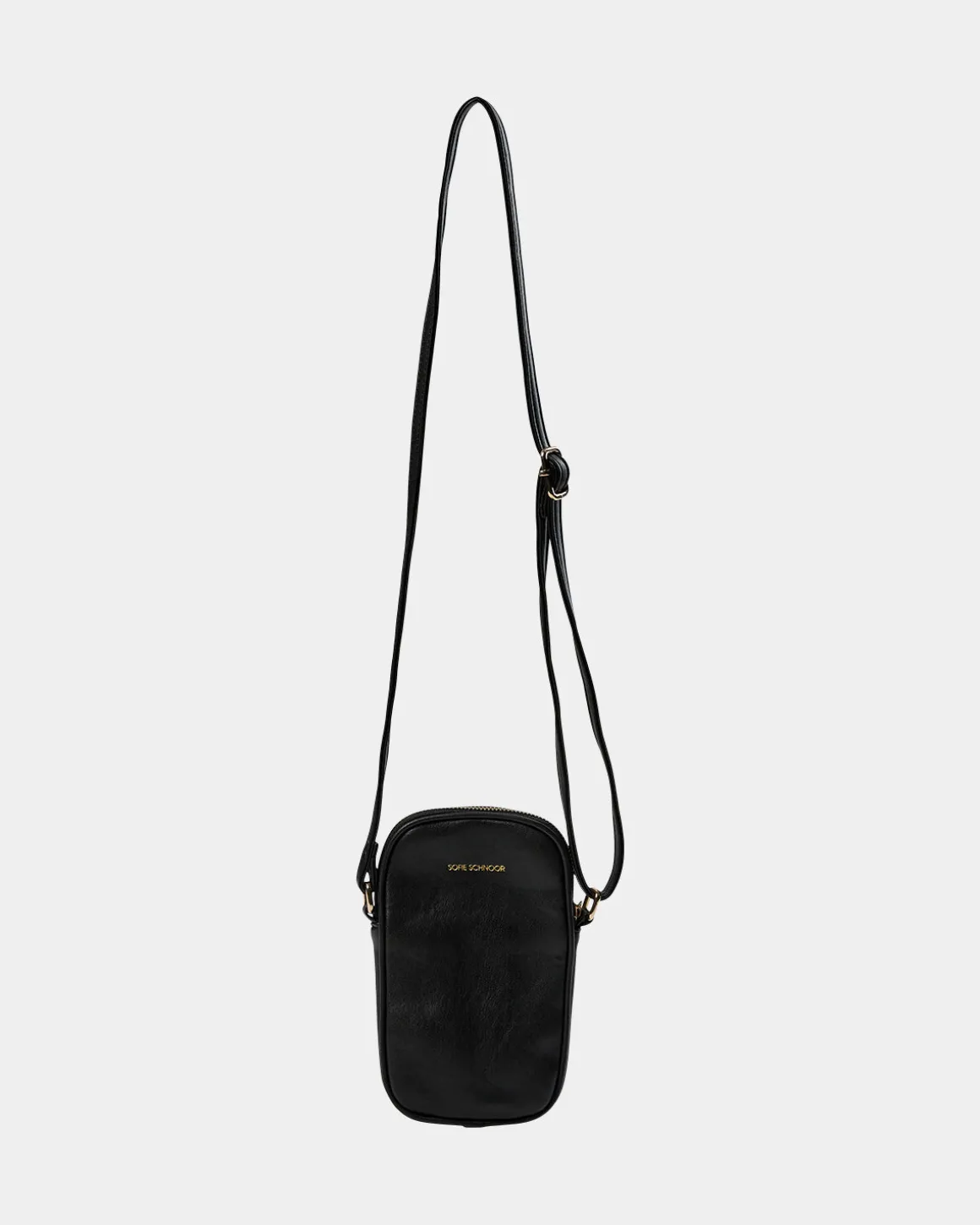 Small shoulder bag in black quilted imitation leather with the ’Sofie Schnoor’ logo. The bag has an adjustable strap and a zip closure at the top.
