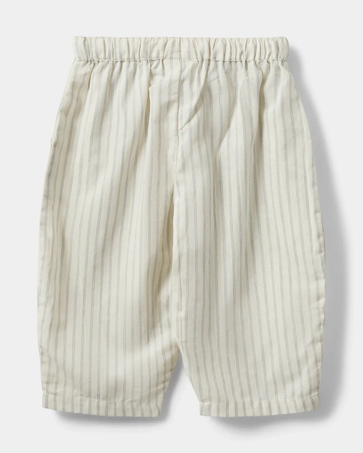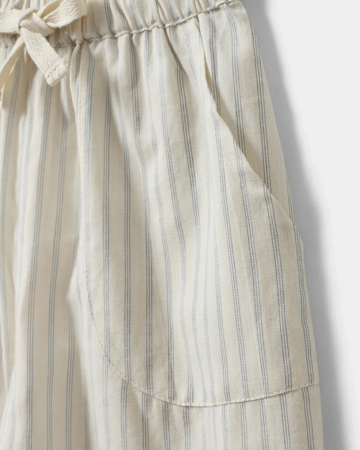 • Striped trousers with a relaxed fit, tie belt at the waist, and side pockets