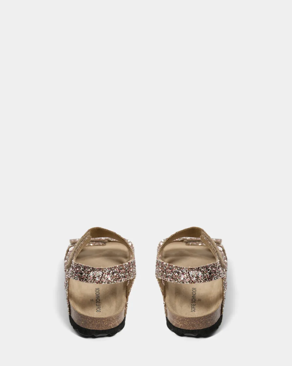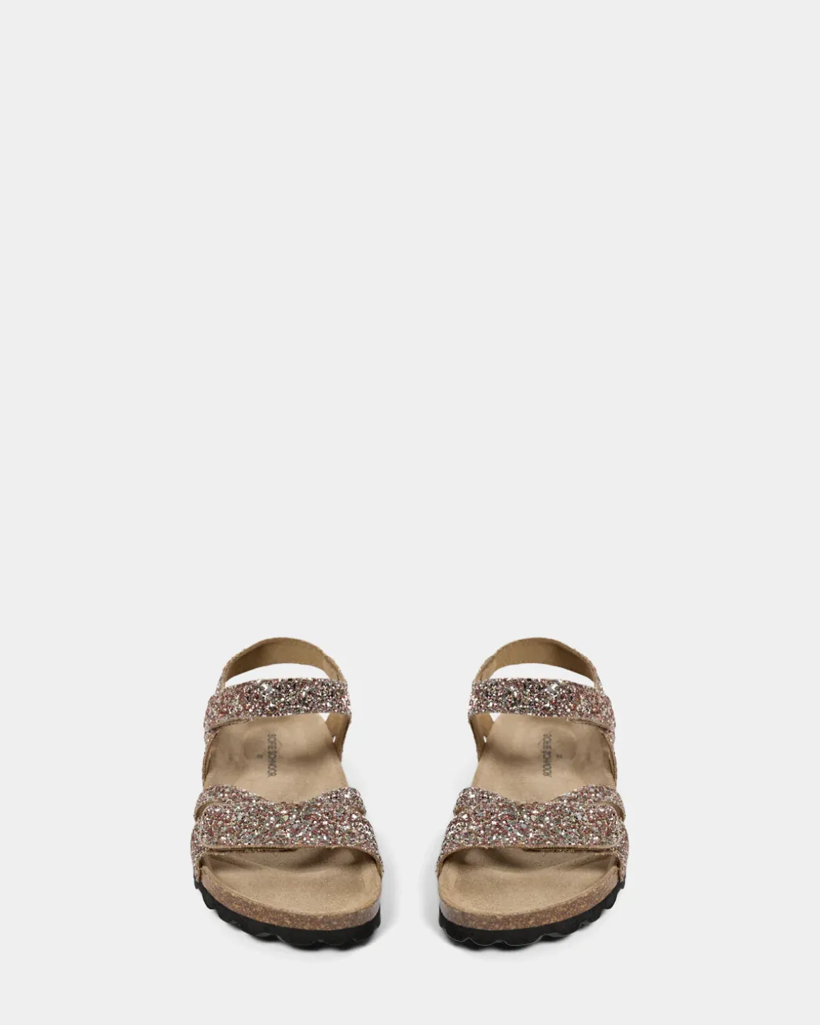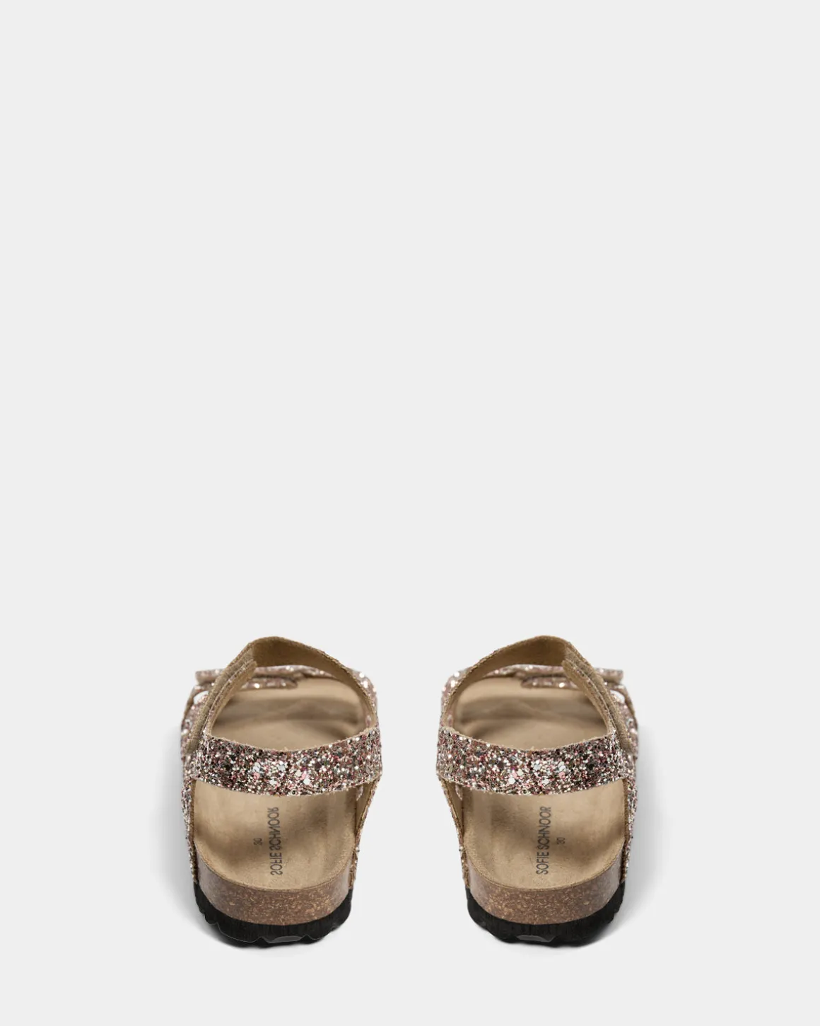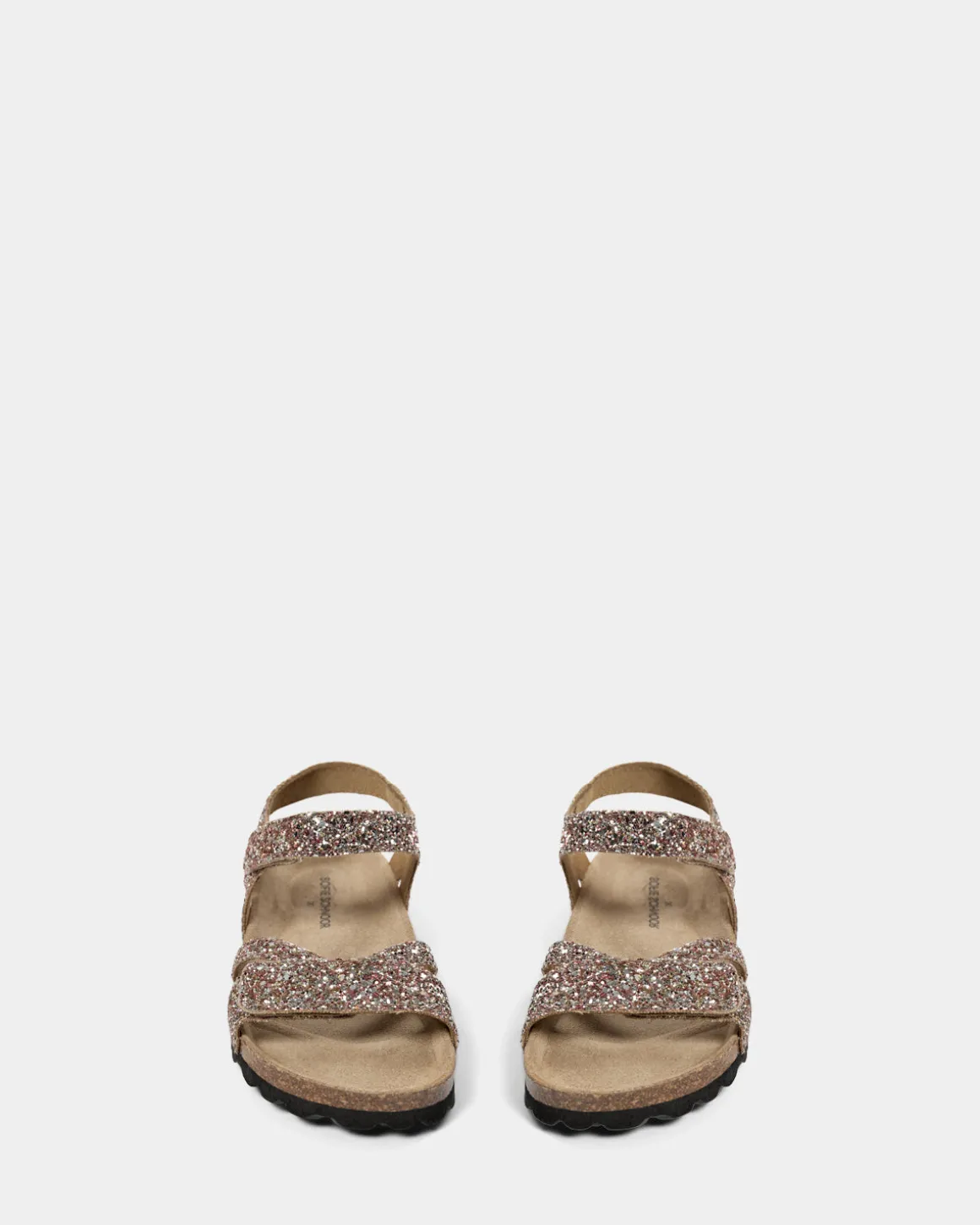 Sandal with glitter. The sandal has two adjustable straps and an ergonomically molded insole for extra comfort. The upper is made of 100% glitter, the insole is leather, and the outsole is rubber.