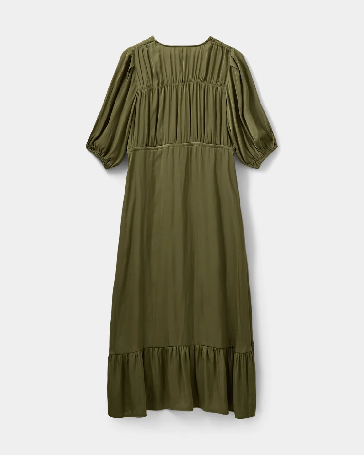 The dress is decorated with fine frills and has ¾ sleeves for a light and airy look.