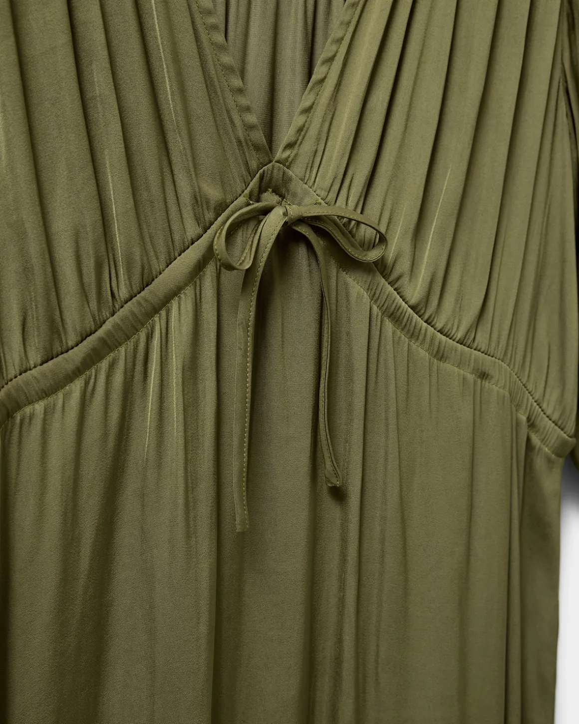 It has a flattering V-neck and tie closure at the chest which can be adjusted as needed.