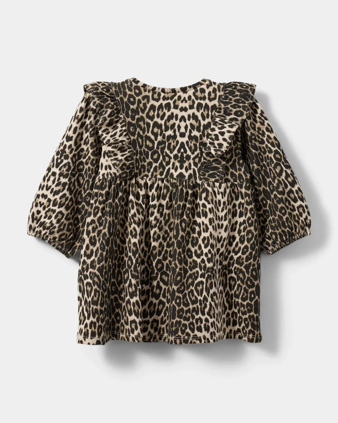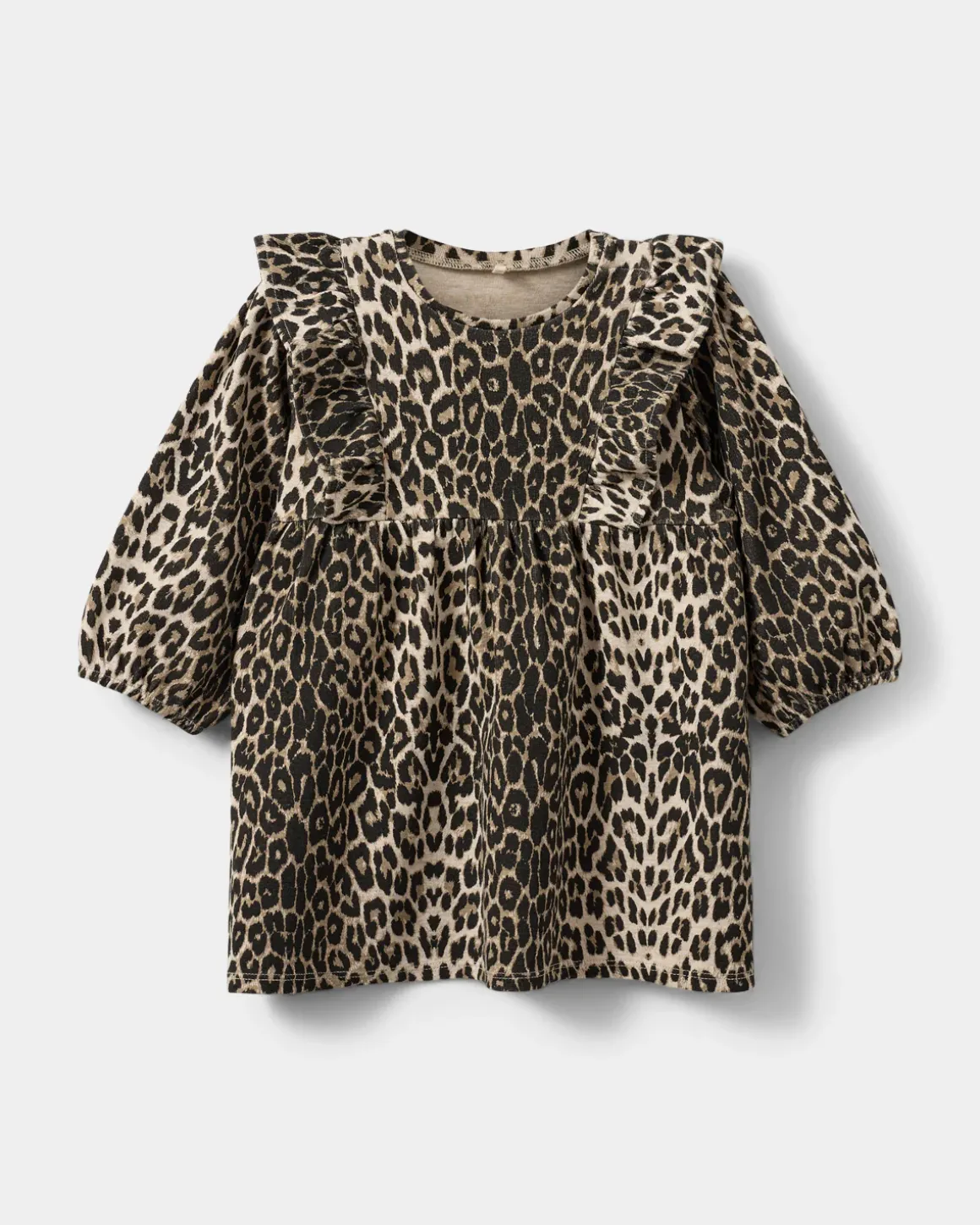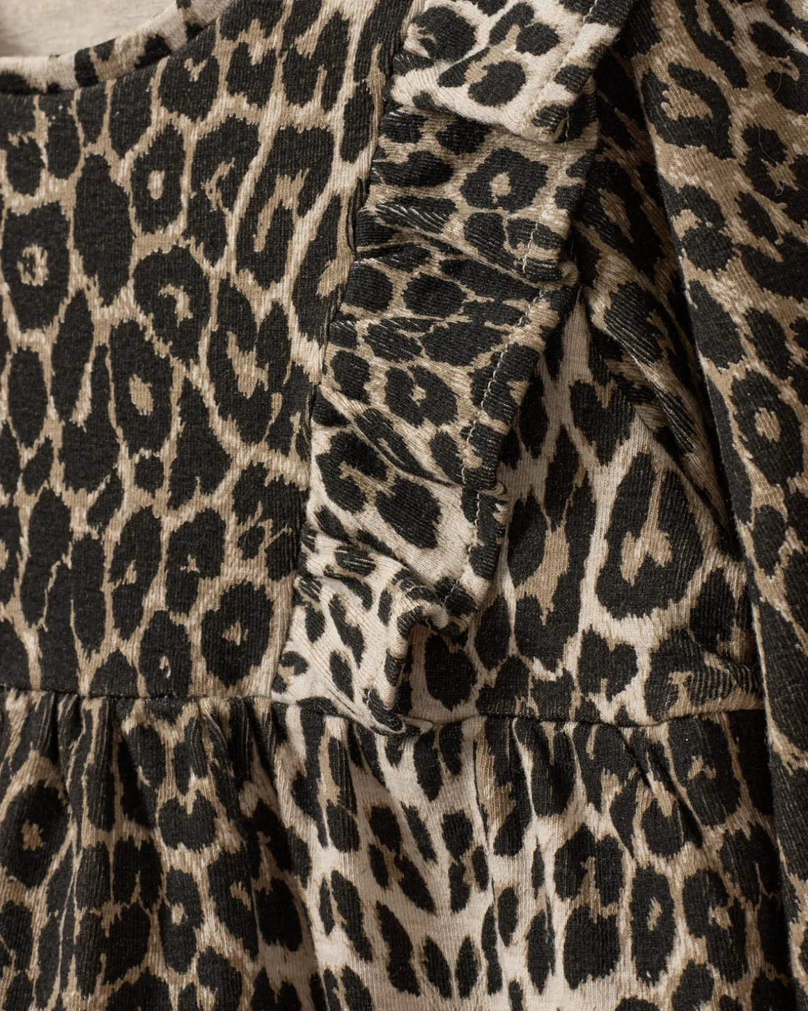 Dress with leopard print and ruffle details at the front. The dress has a loose fit, round neck, and long sleeves with elastic at the cuffs. Made in a blend of 47% cotton, 47% modal, and 6% spandex.