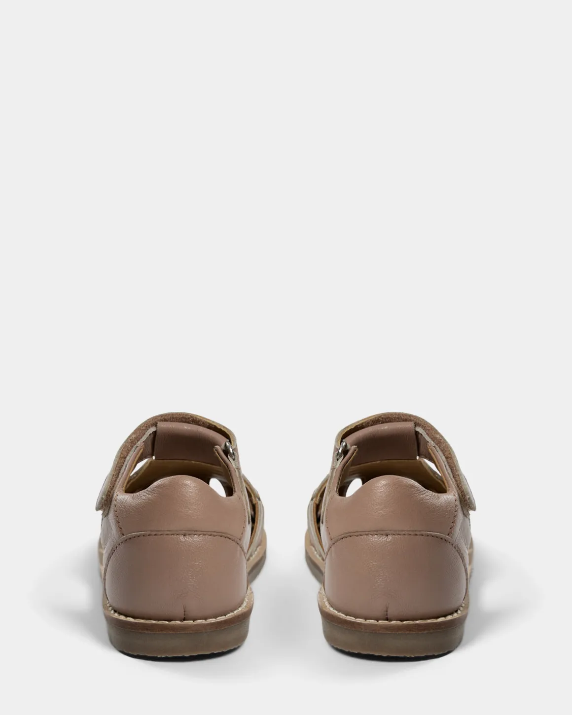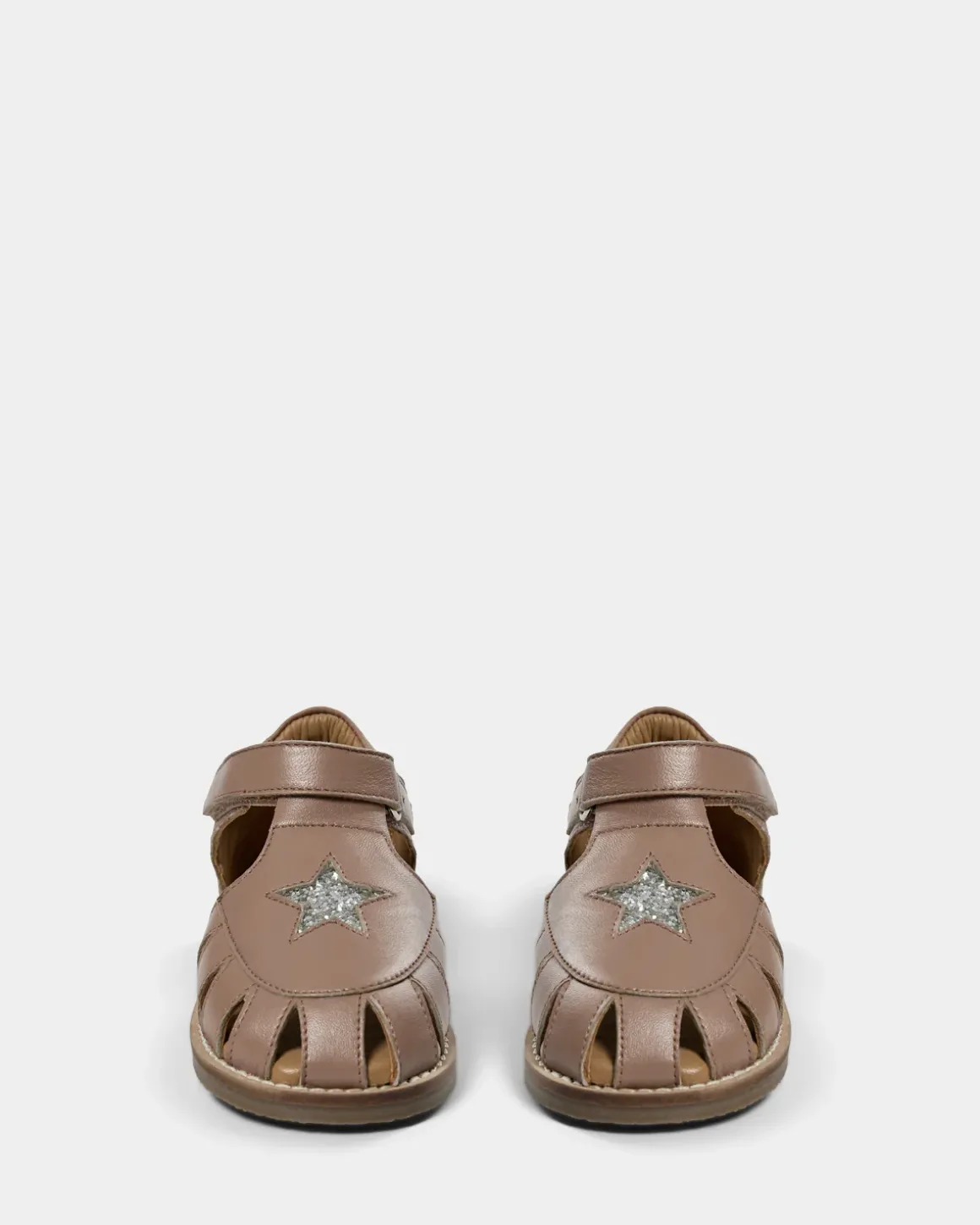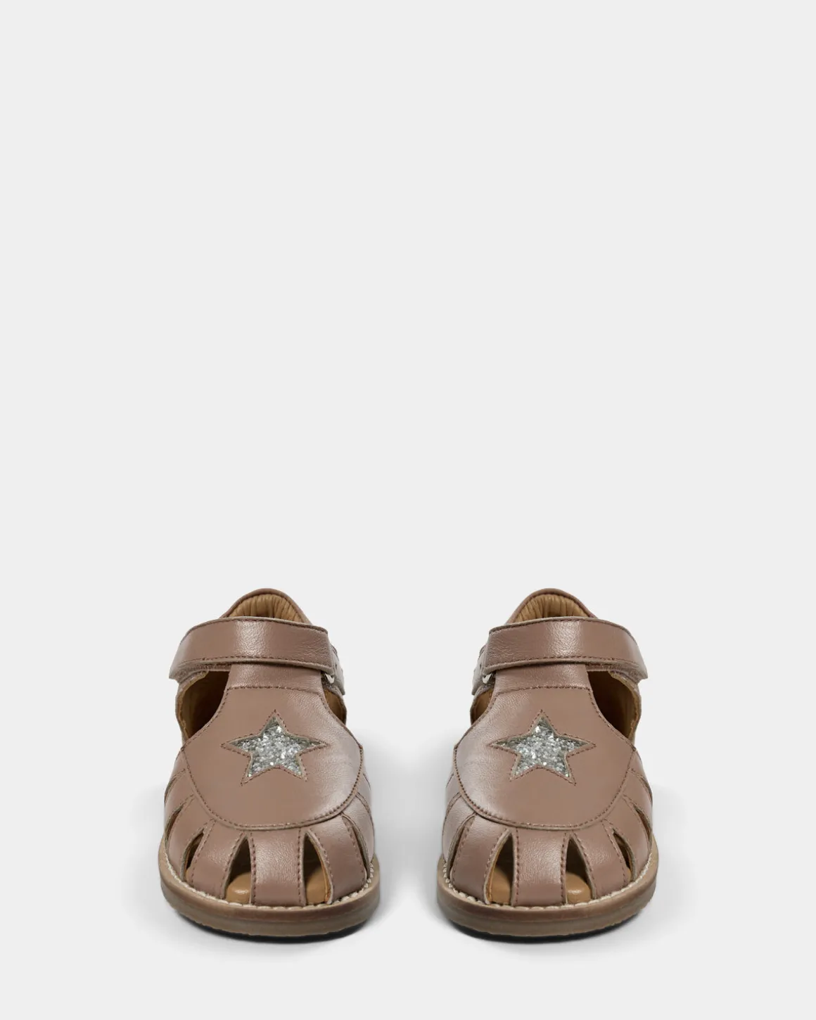 Sandal in light brown with a sparkling star on the top. The sandal has an adjustable Velcro closure and open sides for good ventilation. Made of 100% leather with a rubber outsole.