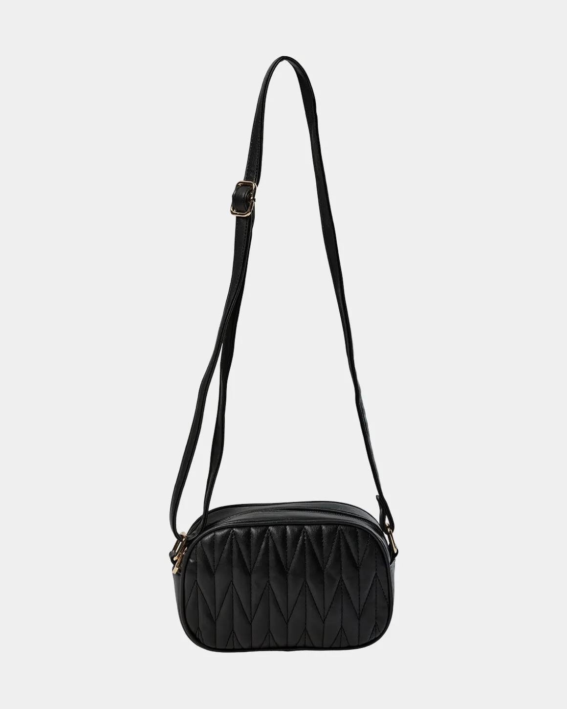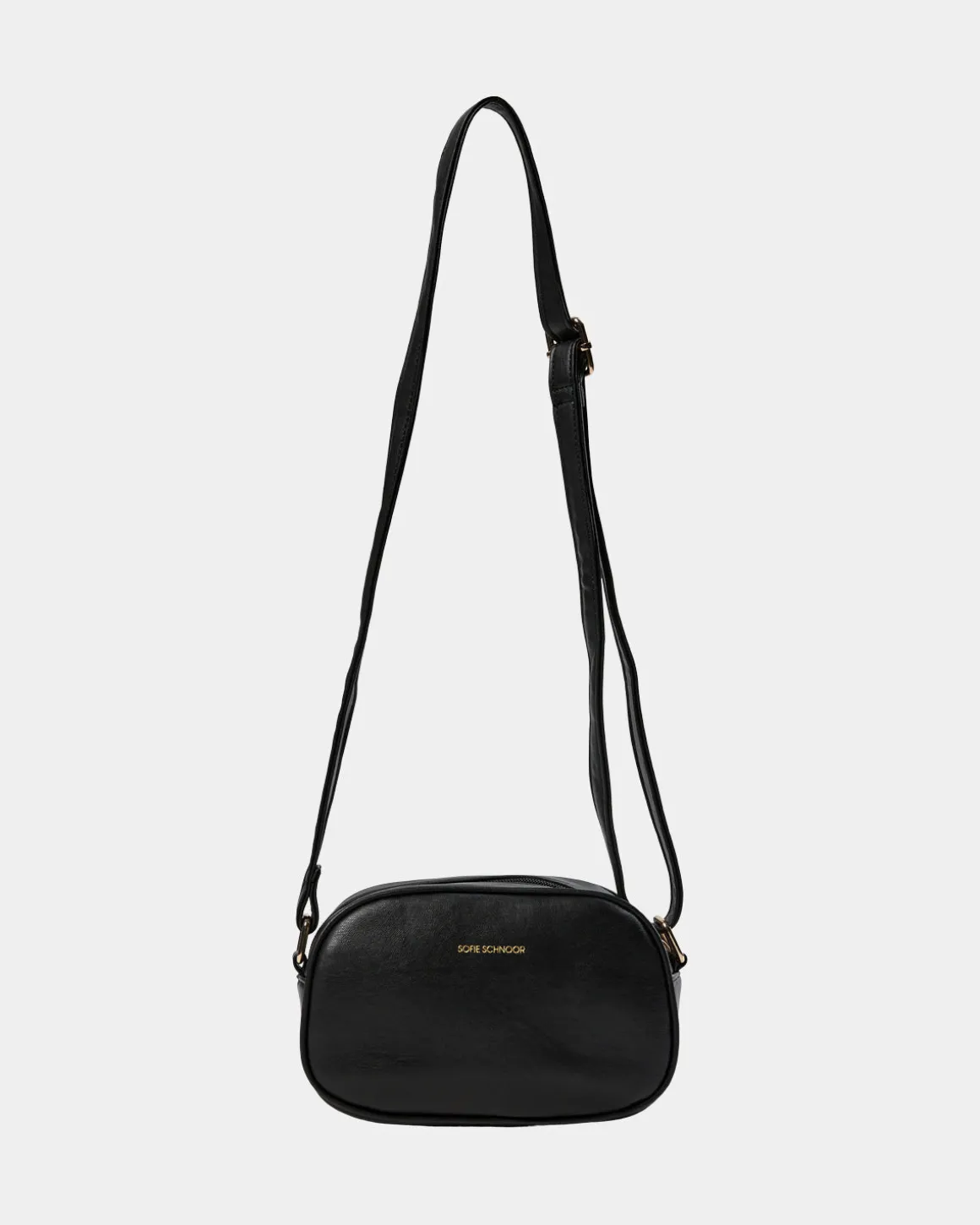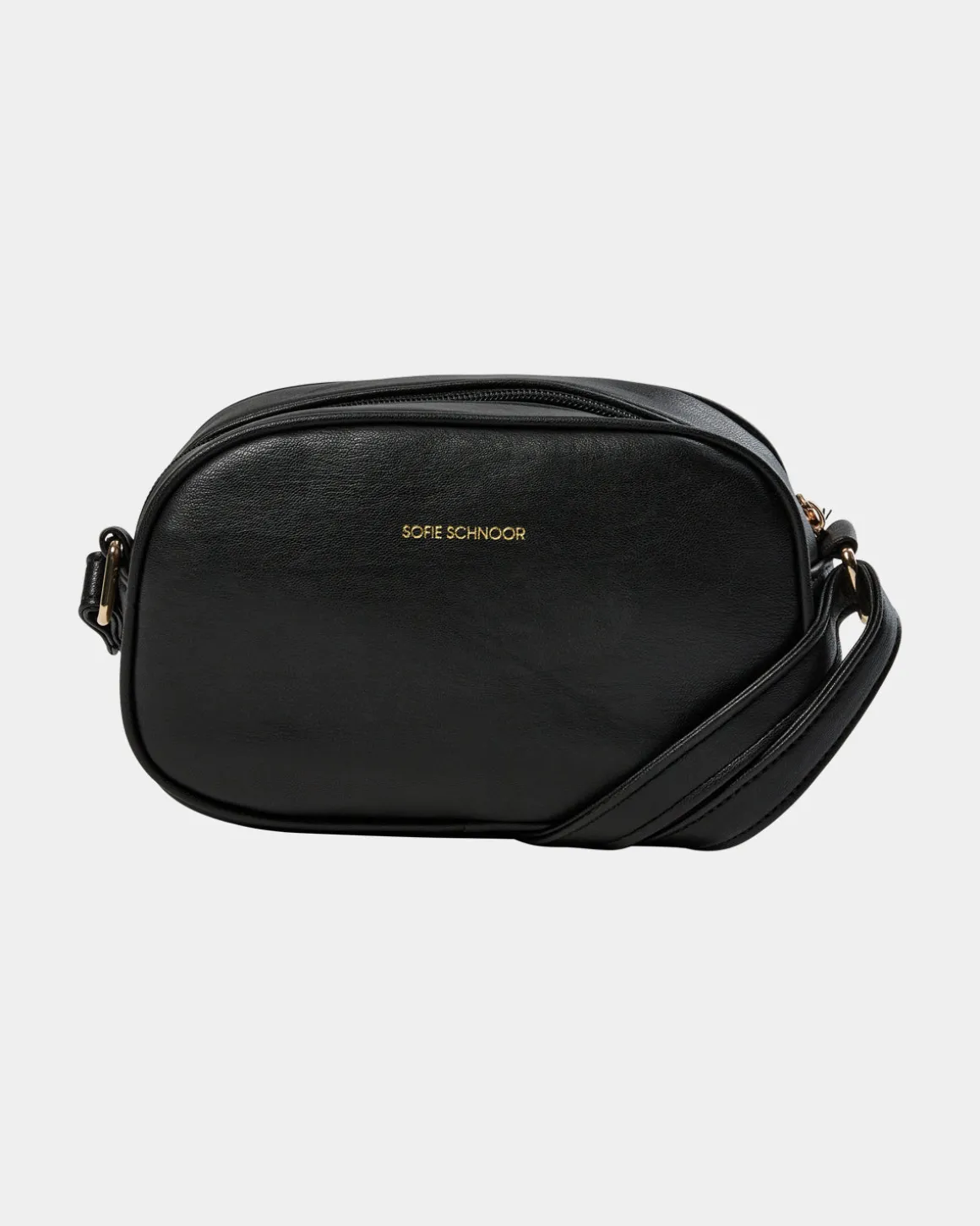 Crossbody bag in black quilted faux leather with ’Sofie Schnoor’ logo. The bag has an adjustable strap and zip closure.