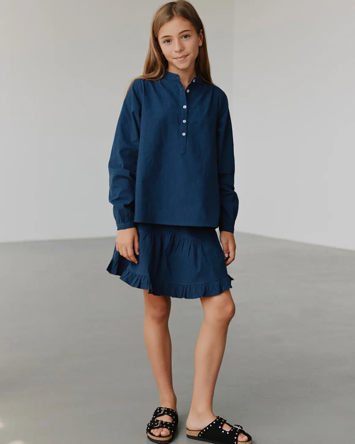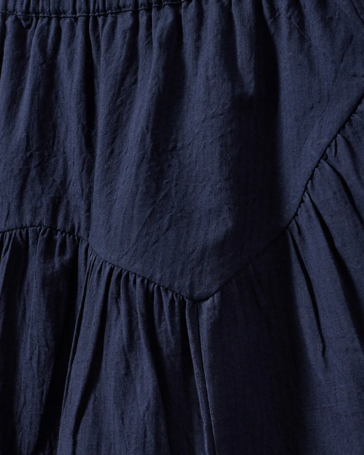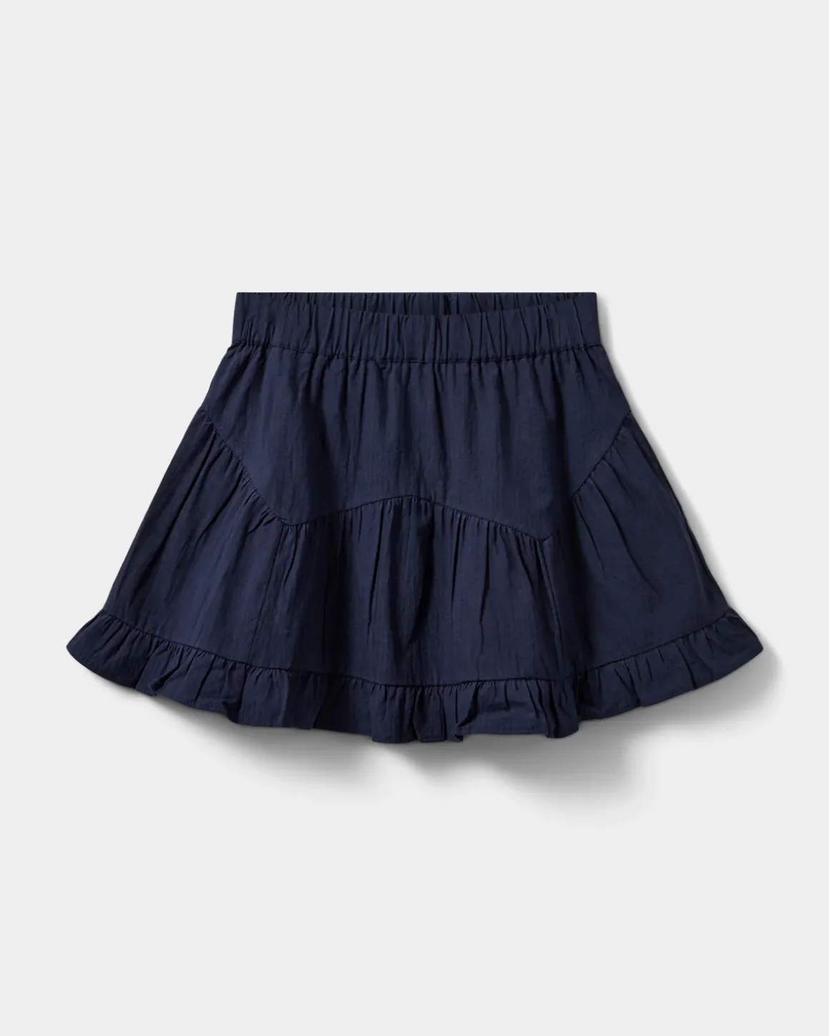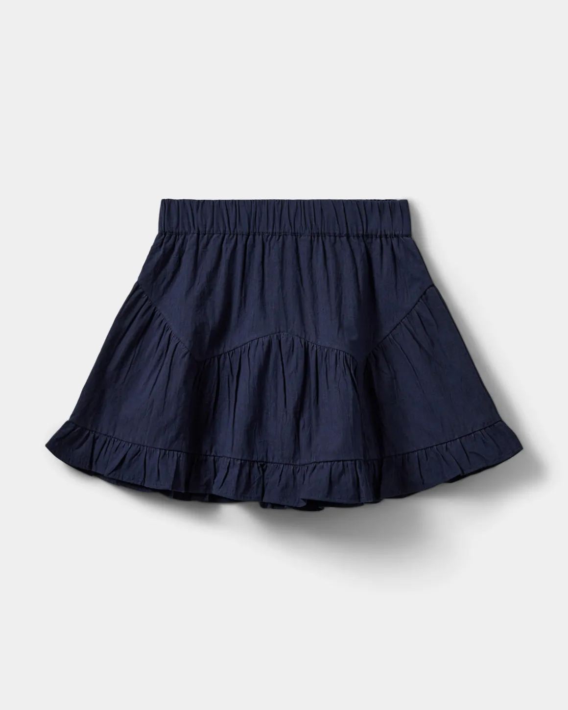 Sweet skirt in dark blue. The skirt has an elastic waist, asymmetric details, and frill details at the bottom. Made of 100% cotton.