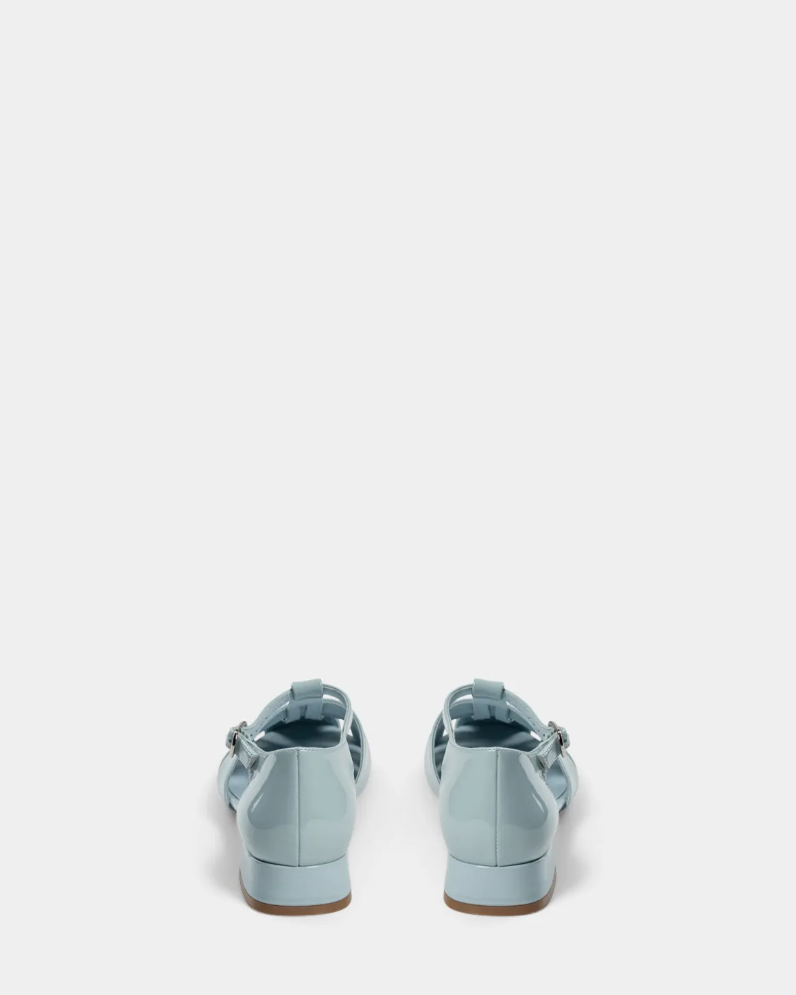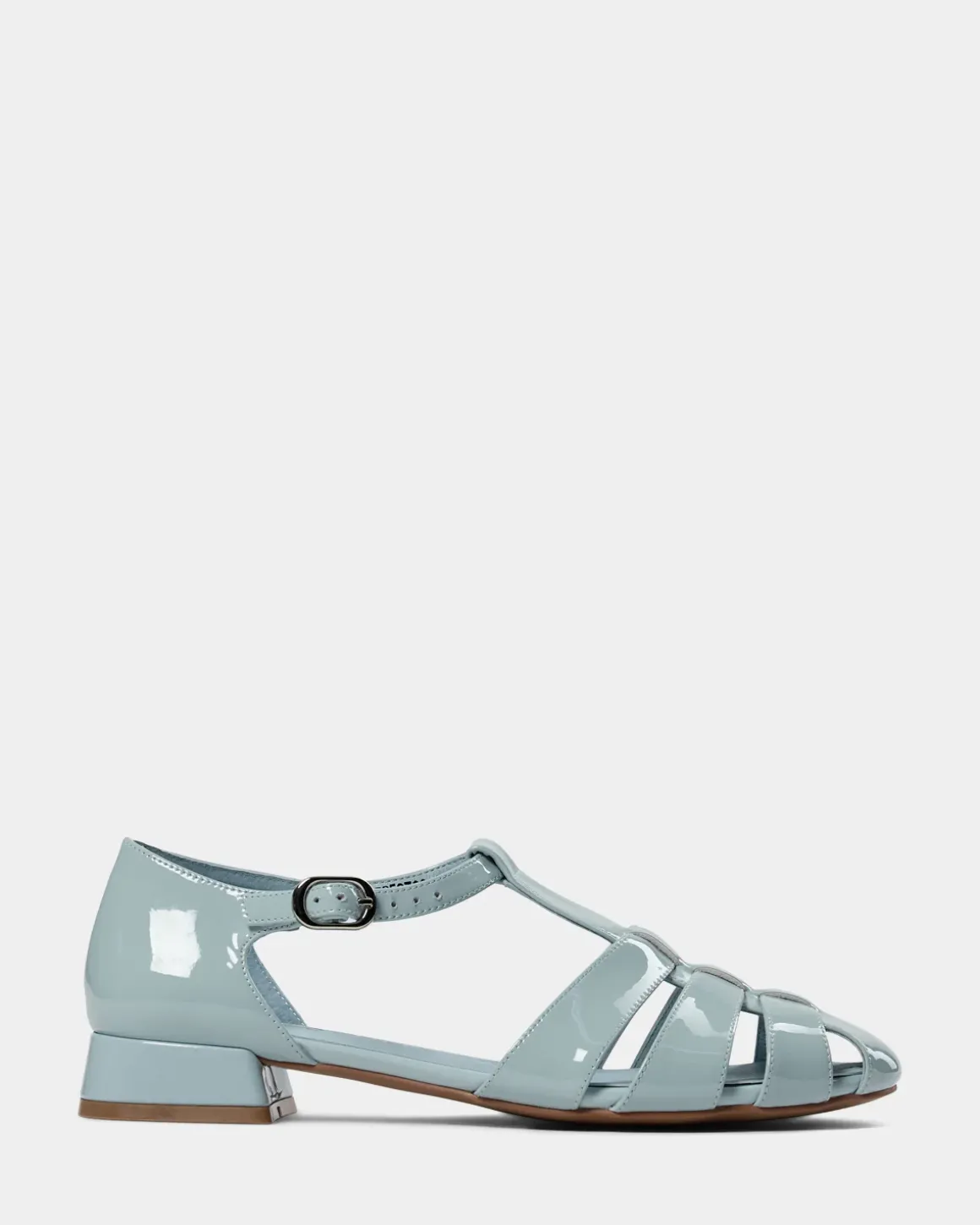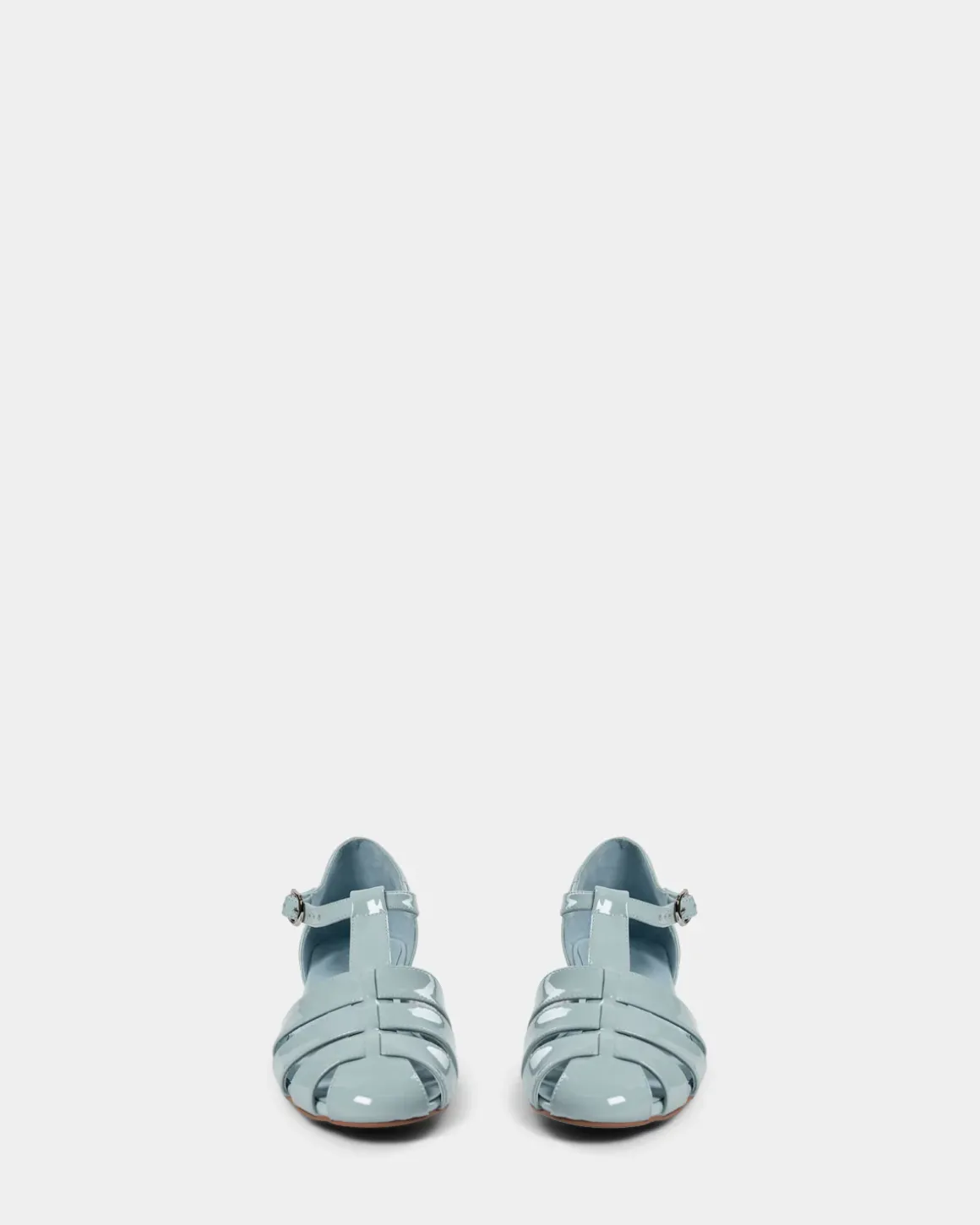 • The sandal has a small block heel and a round toe, as well as a glossy surface