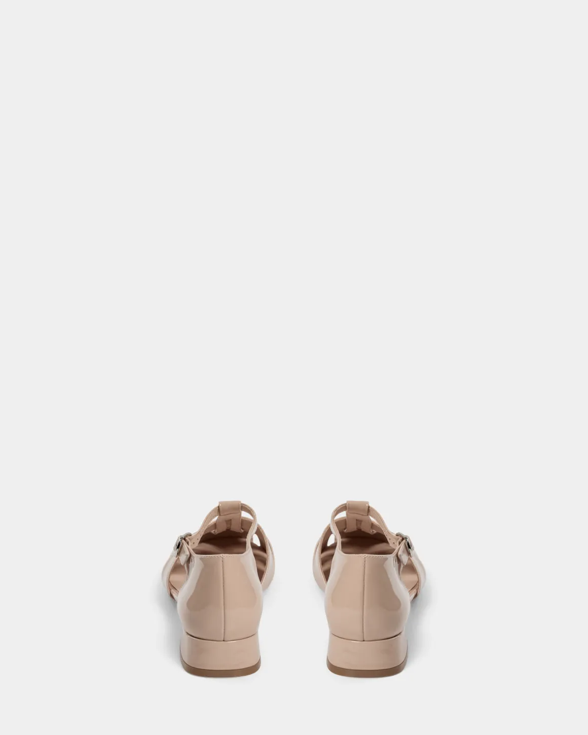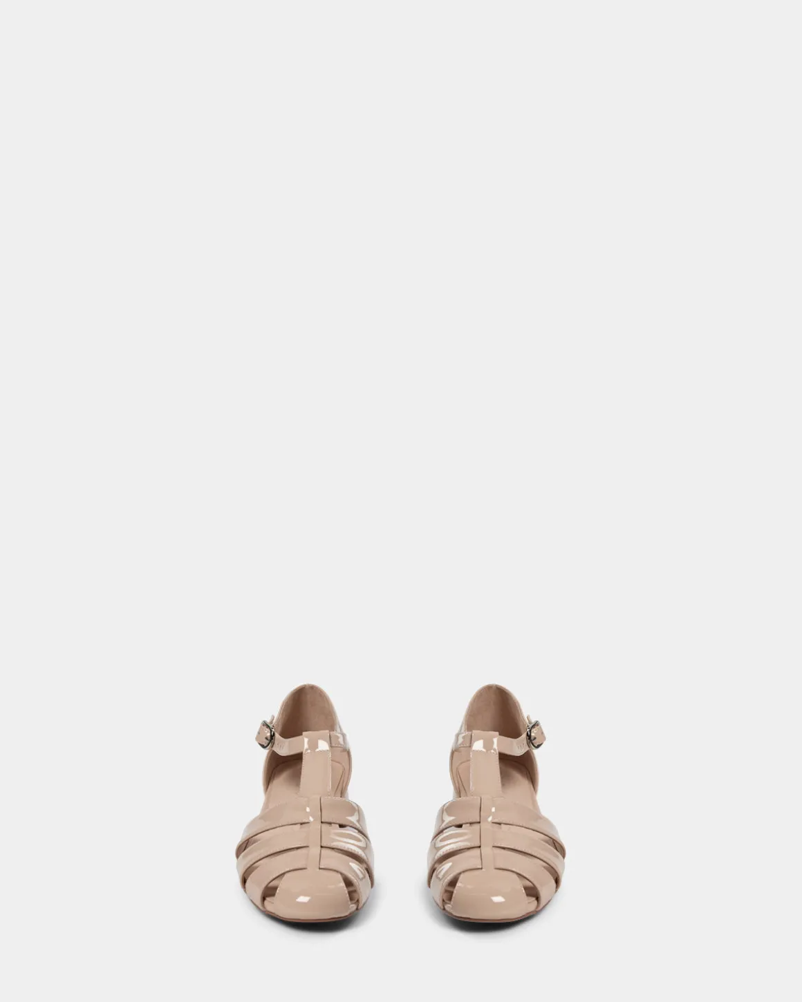 • The sandal has a small block heel and a round toe, as well as a glossy surface