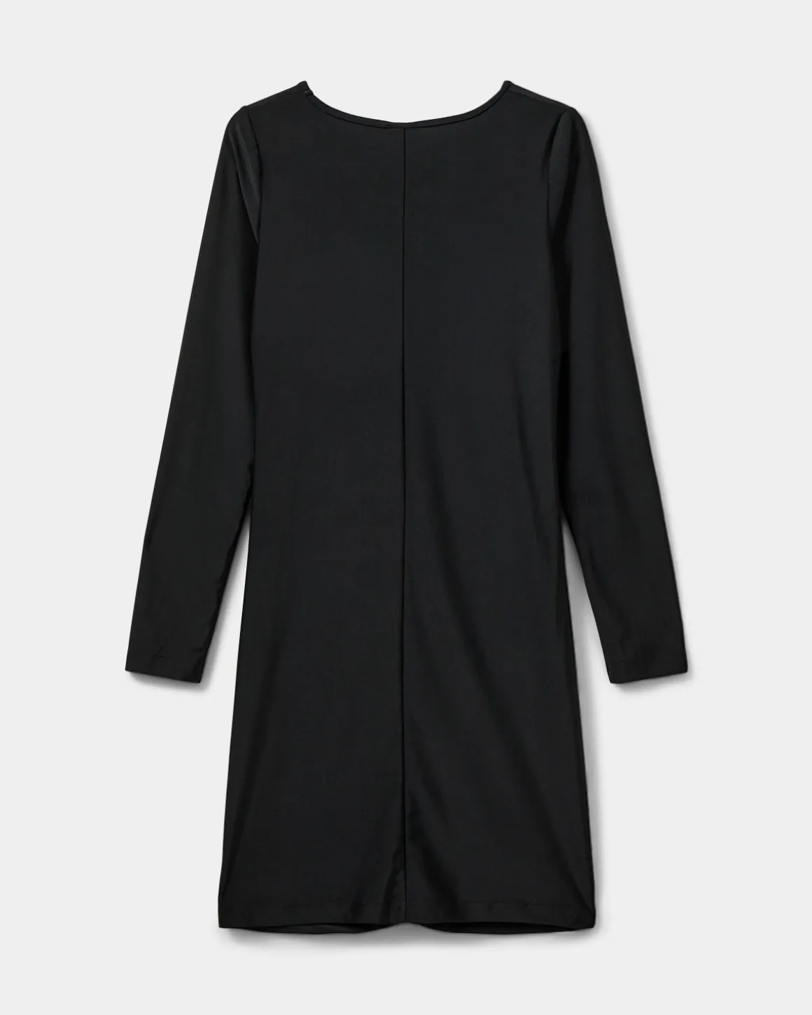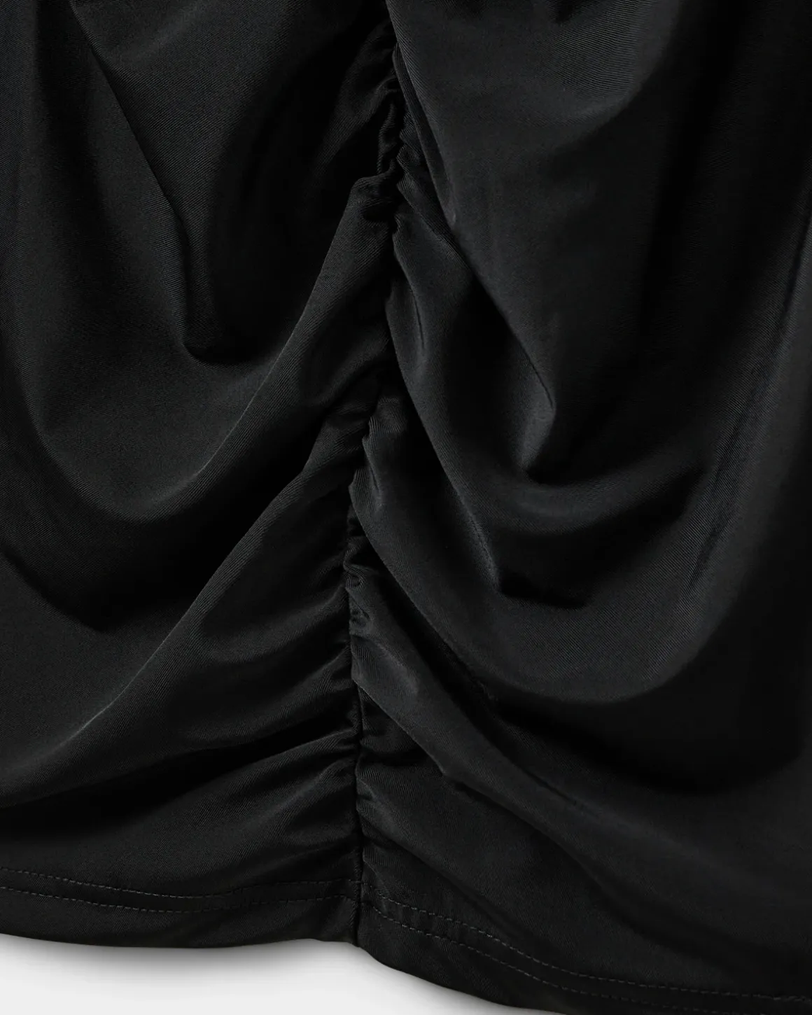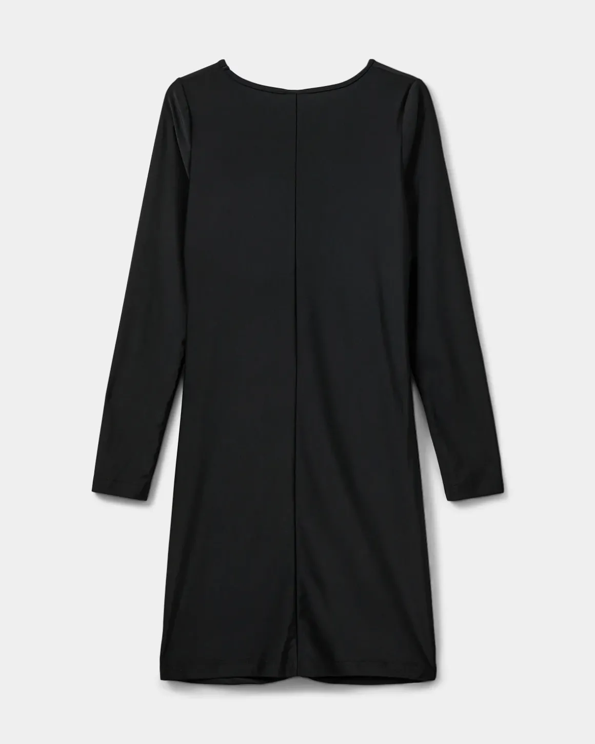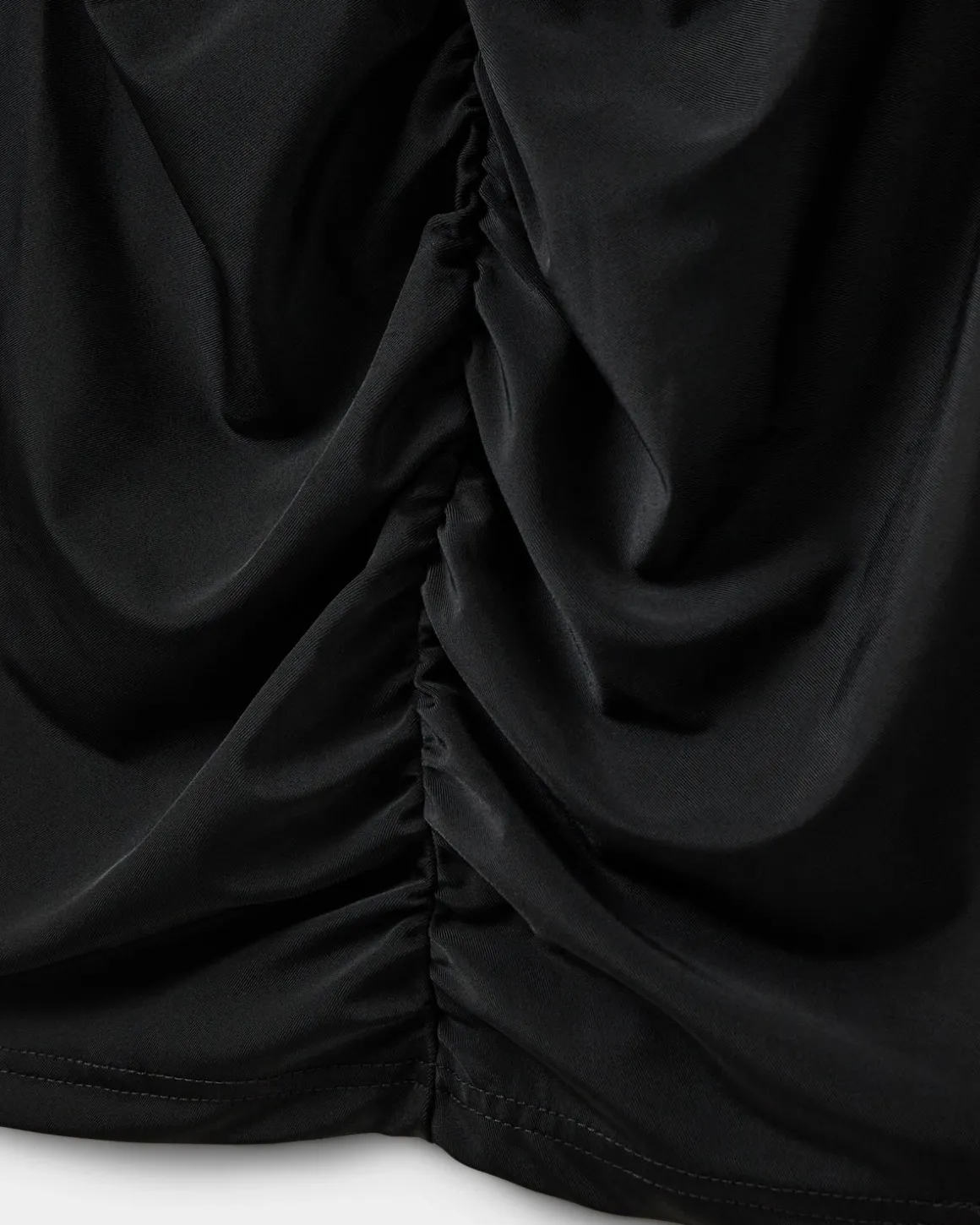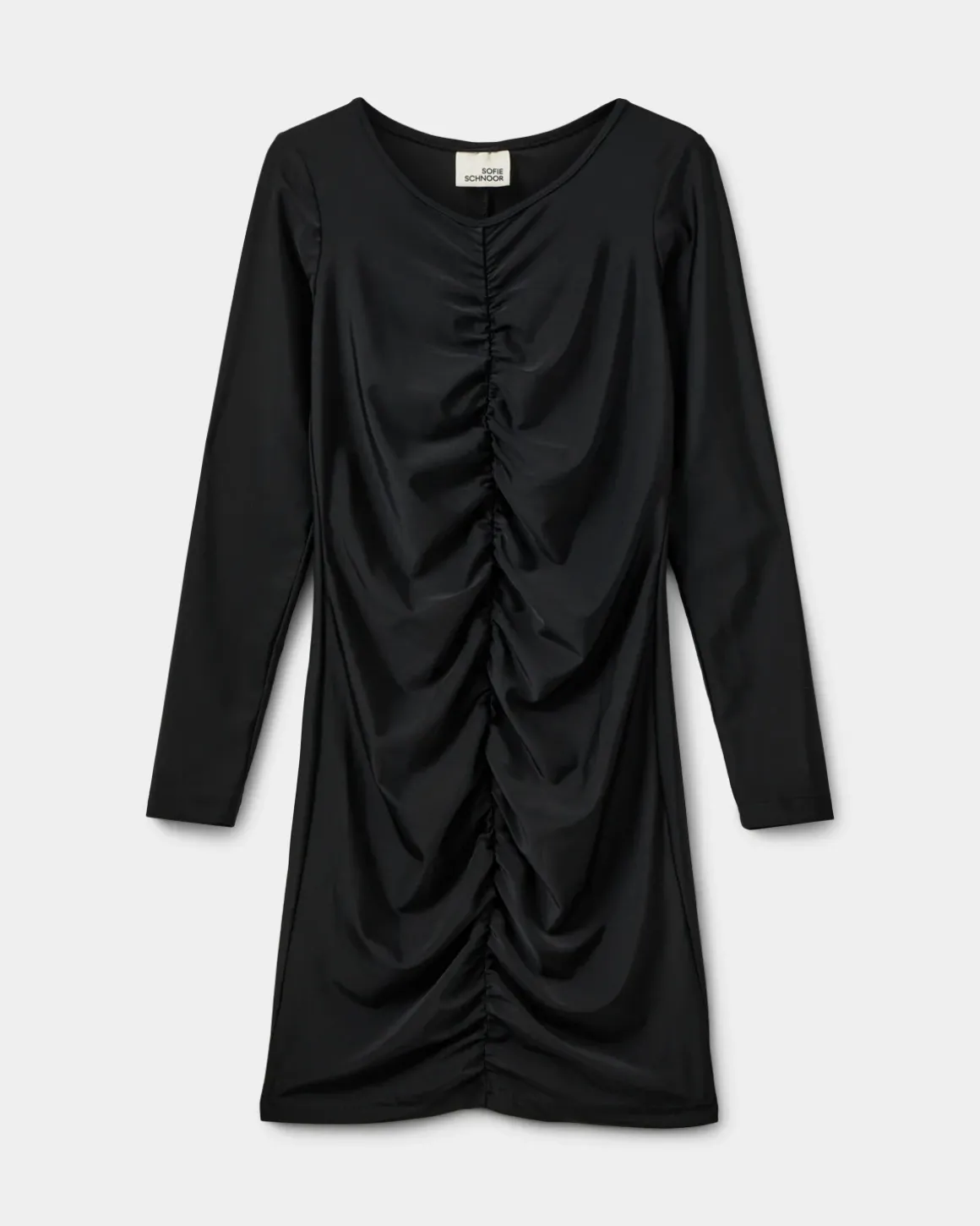 • The dress is designed with pleats on the front that add an elegant and structured detail to the design.