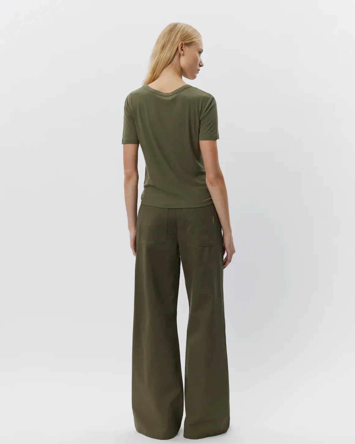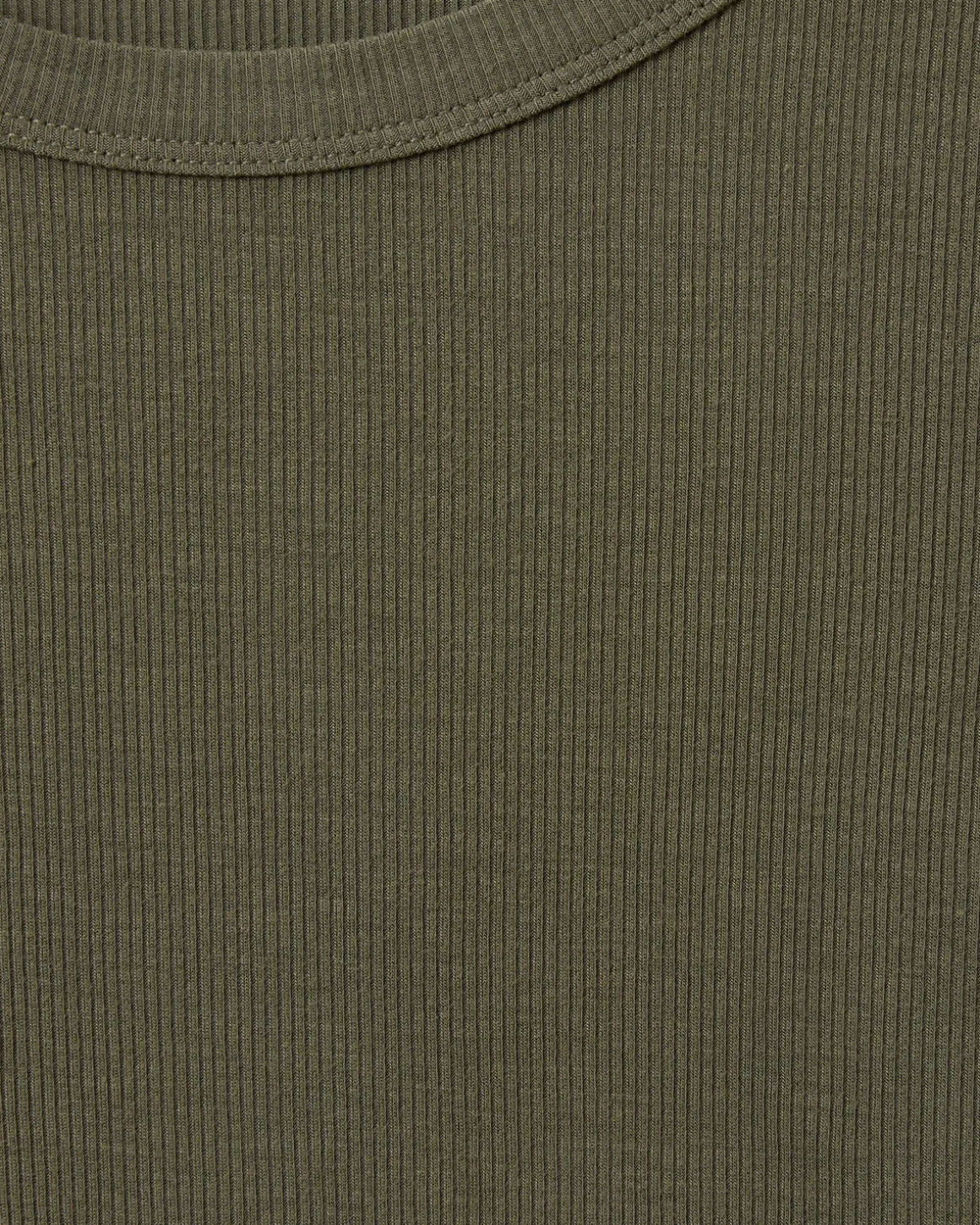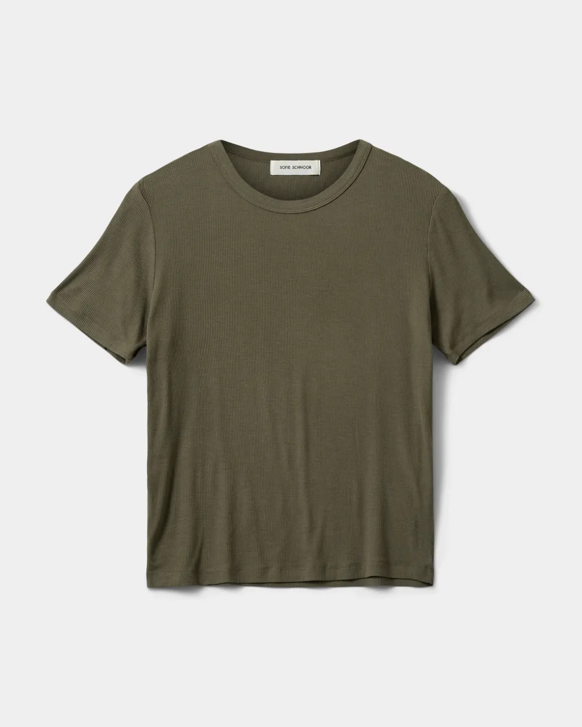 • The T-shirt has a rounded neckline.