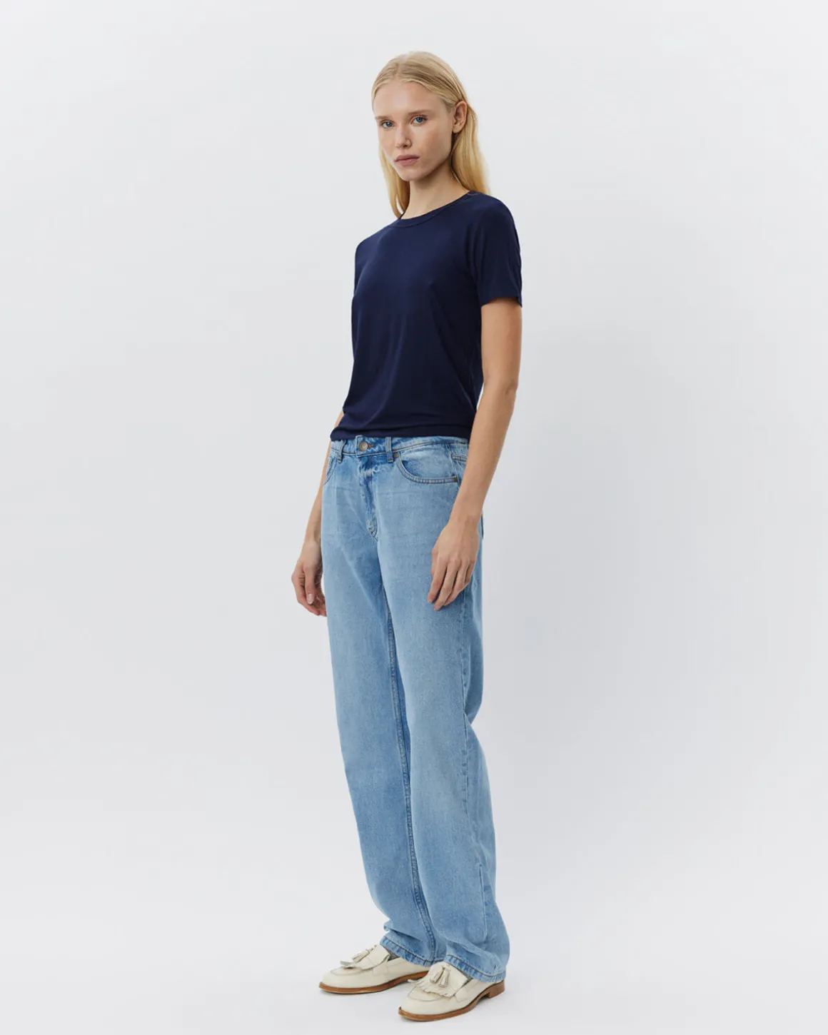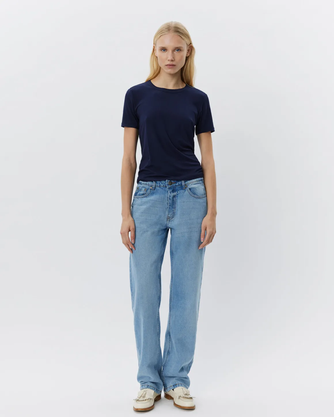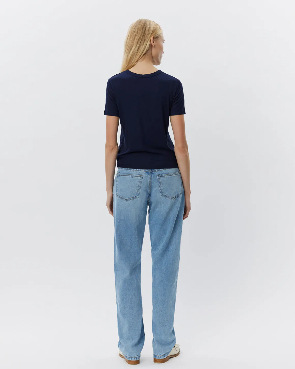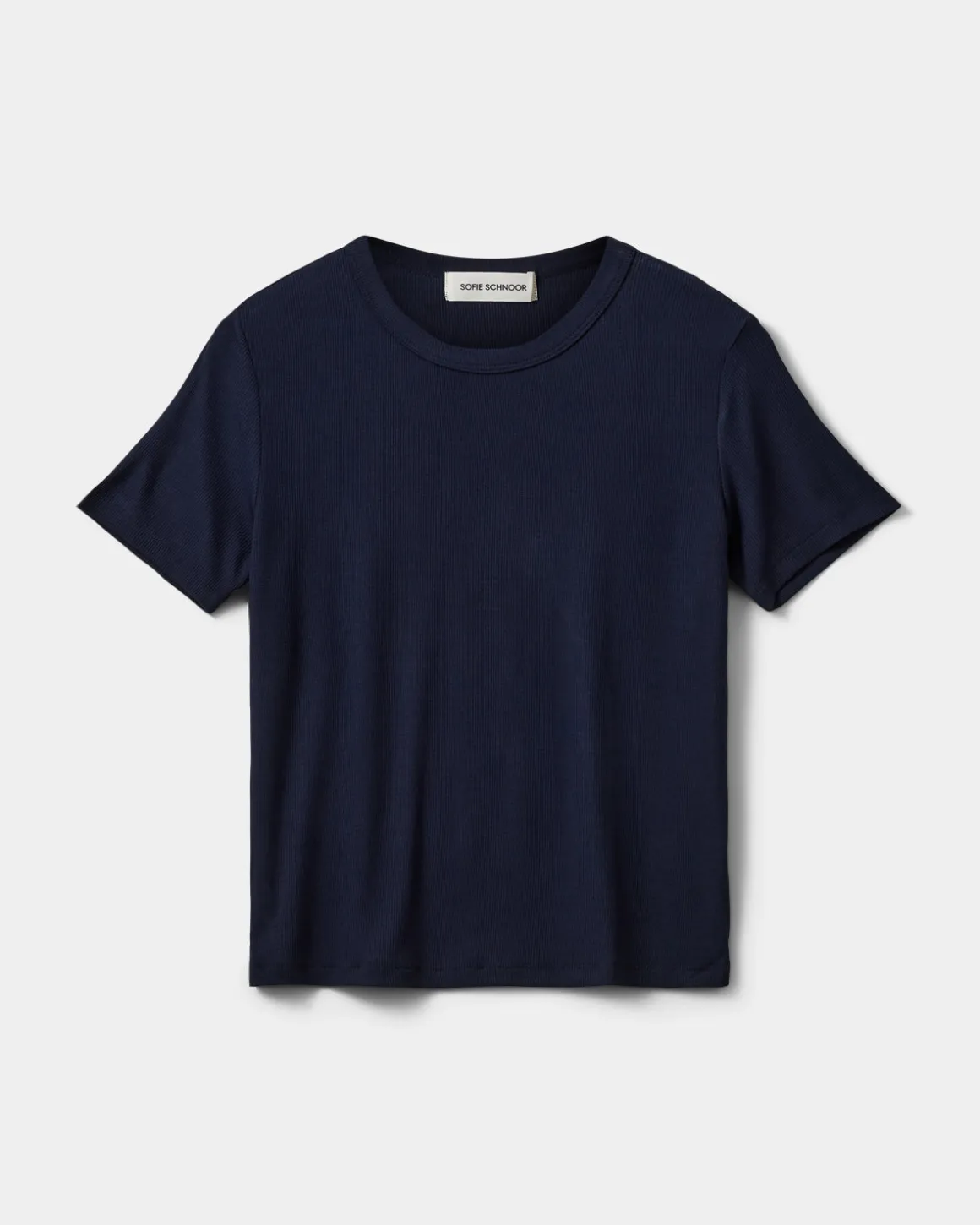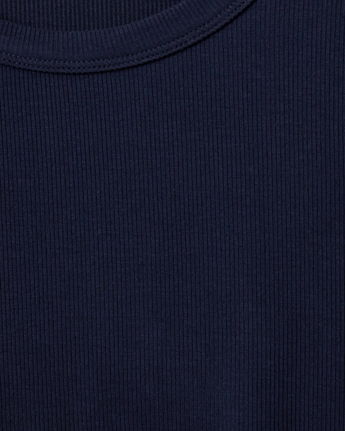 • The T-shirt has a rounded neckline.