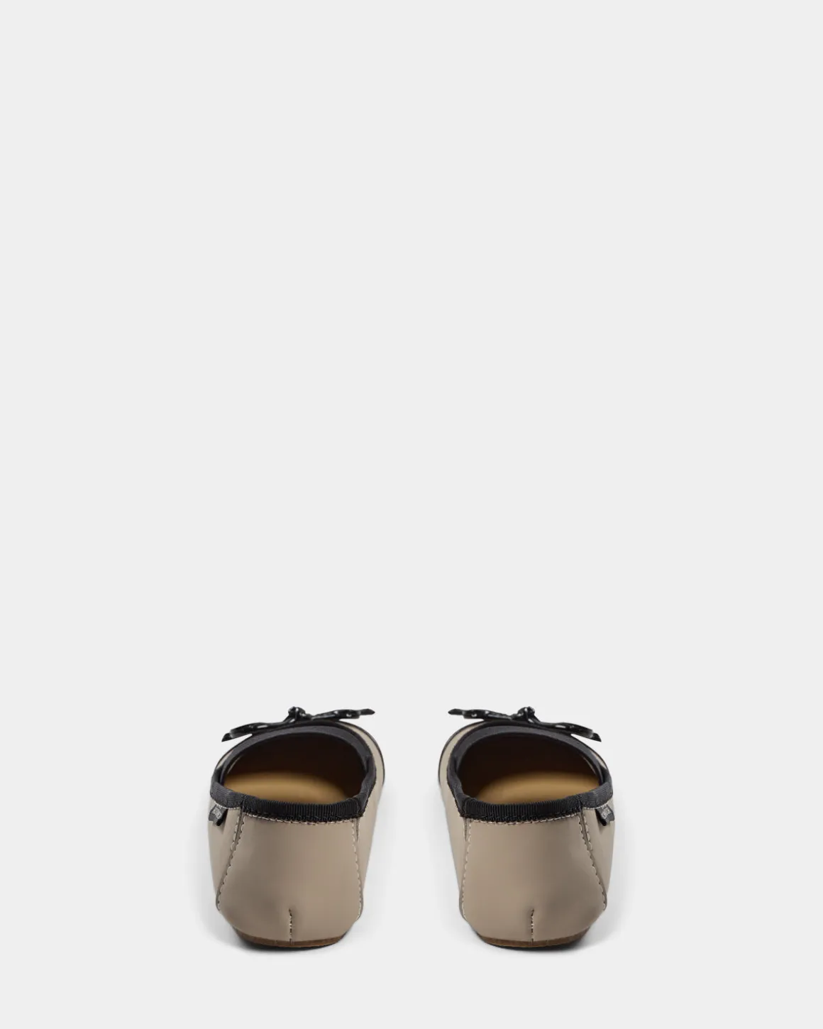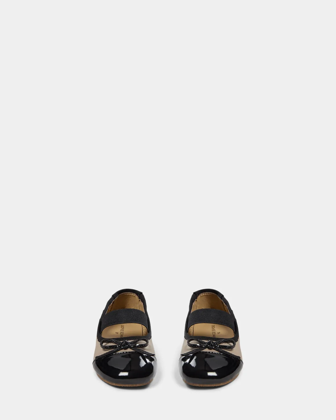 Ballerina shoes in beige with patent details. The shoe features a cute bow at the front and elastic bands over the instep for a good fit. Made of 100% suede, 100% leather, and 100% rubber.
